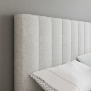 – Modern linen platform bed with upholstered headboard