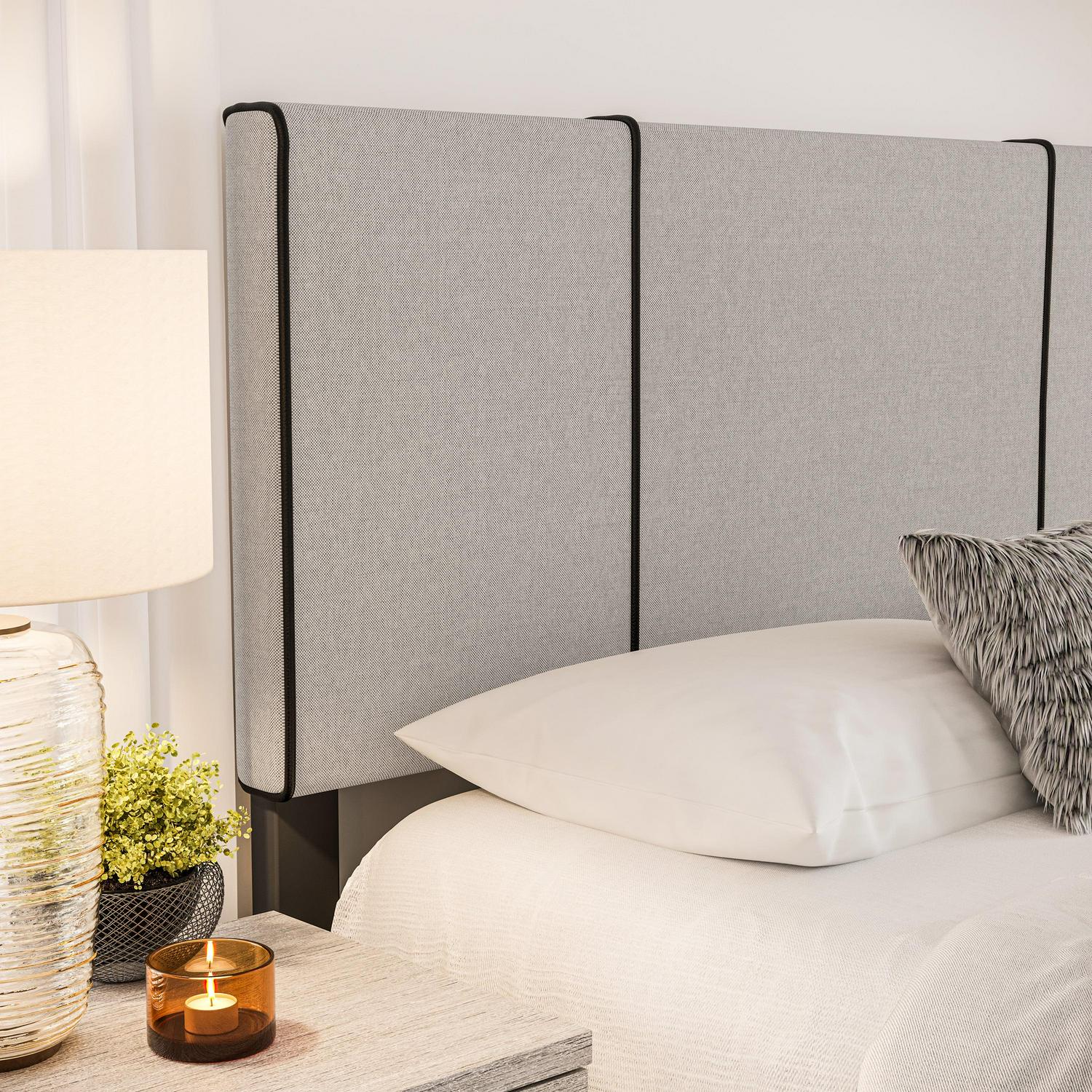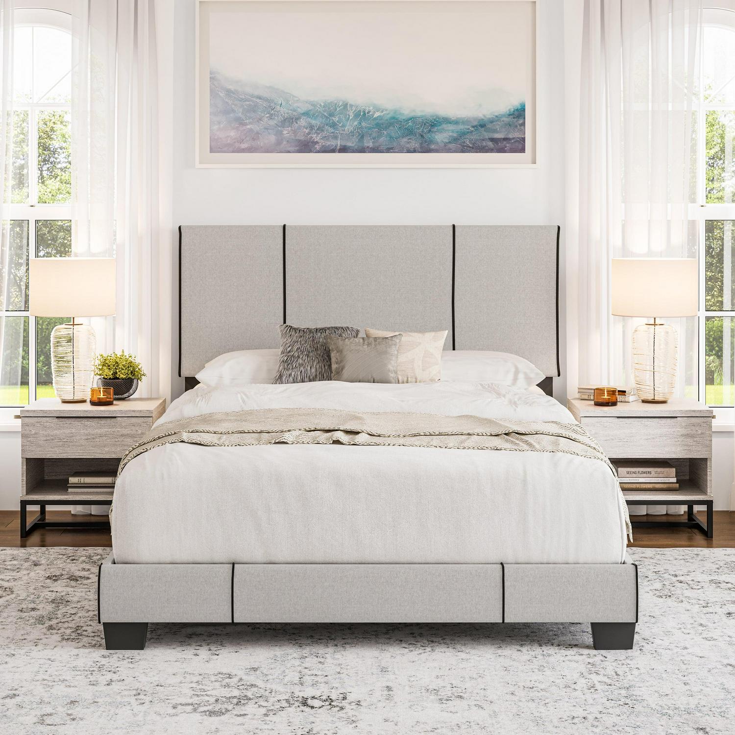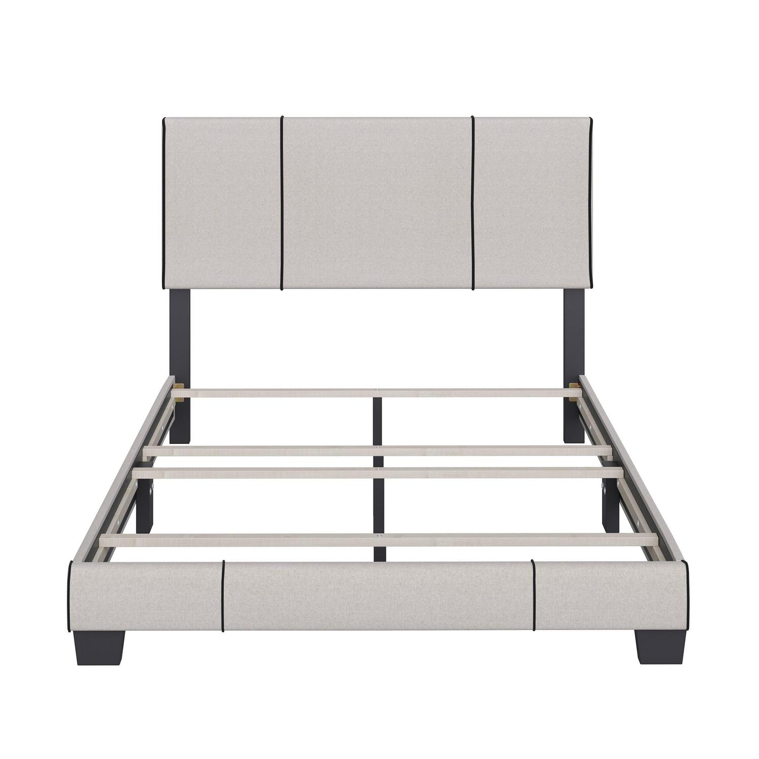 Introducing the Lucena Upholstered Platform Bed, a modern bed frame from Boyd Sleep that fits your personal style. This upholstered bed features contrast piping on its headboard and footboard for a neat, tailored finish. The 4 slat support system is designed to be used with a box spring or foundation, which allows your mattress to sit at a comfortable height off the ground. Built to last, Lucena uses ultra-sturdy, solid wood center legs for additional support and mattress longevity. The adjustable headboard can fit a variety of mattress heights and adds an elegant focal point to your bedroom or guest room. The Lucena from Boyd Sleep calls for easy one-person assembly in under 30 minutes using the provided tools and hardware; Philips screwdriver required (not included). Compatible with most mattress types, including memory foam, hybrid innerspring, and latex mattresses. This sleek panel bed is offered in a variety of stylish finishes and is available in Queen, Full, and Twin sizes.