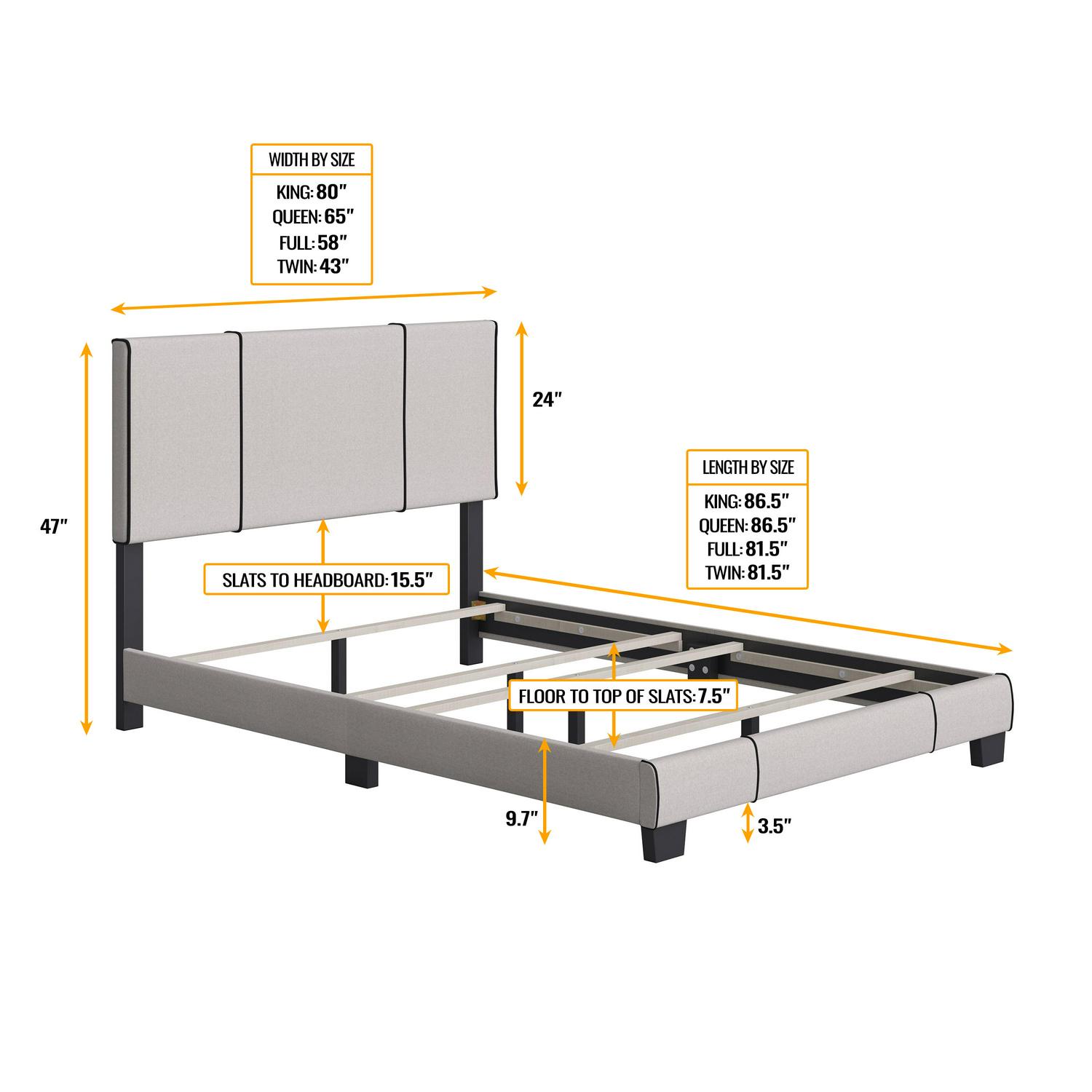 – Assembled Size: Queen: 43.5-47.5″ H x 64″ W x 86″ L, 60 lbs, Full: 43.5-47.5″ H x 59″ W x 80″ L, 56 lbs, Twin: 43.5-47.5″ H x 43″ W x 80″ L, 50 lbs.
