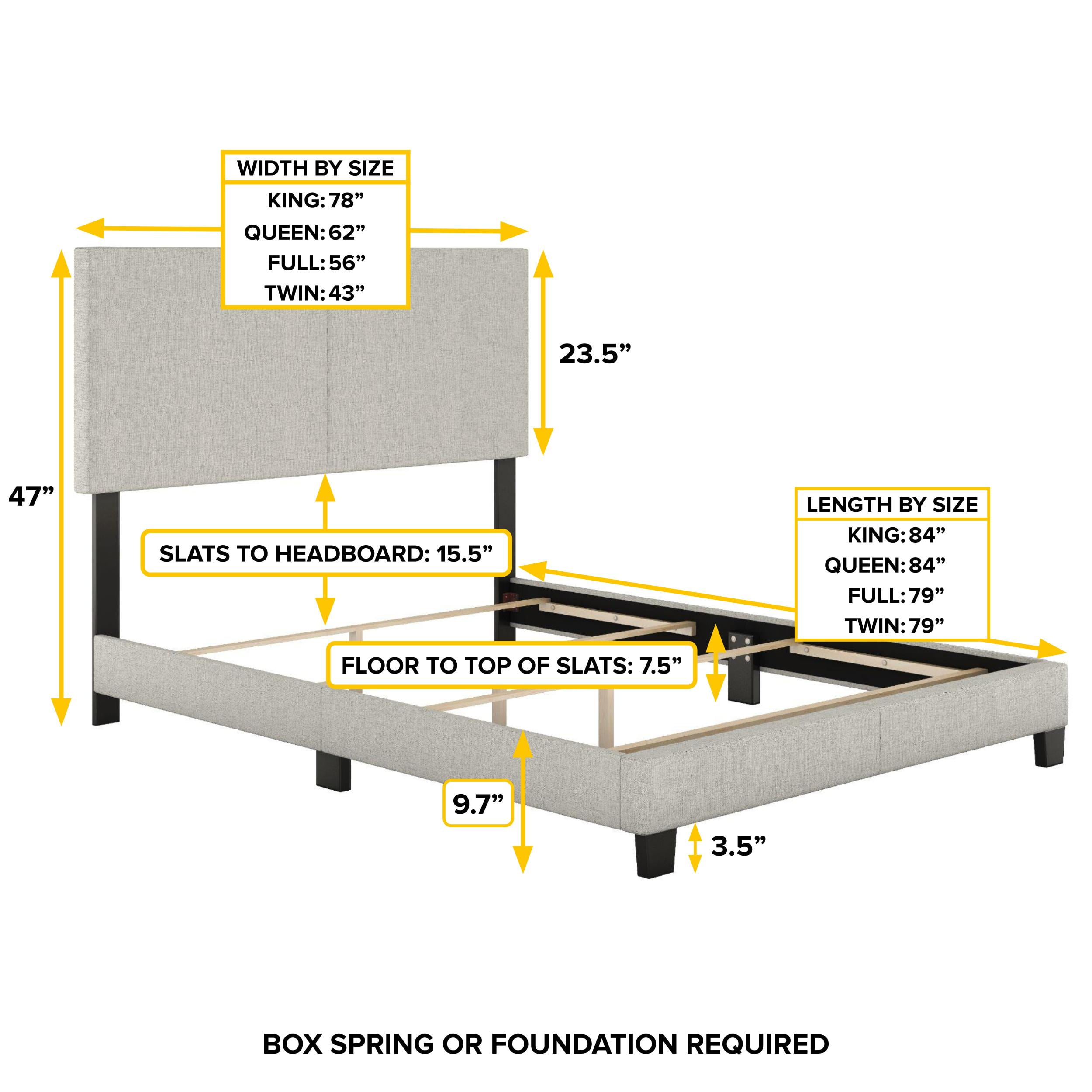 Modern upholstered padded bed from Boyd Sleep Requires a box spring or foundation Sturdy wood and metal frame construction with extra center support legs All components ship zipped in the headboard for easy handling Easy 15 minute assembly Philips screwdriver required Frame supports up to 700 lbs. Available in 3 colors of linen-look polyester upholstery Twin, Full, Queen, and King sizes Assembled Size: King: 46″ H x 78″ W x 83.75″ L, 70 lbs, Queen: 46″ H x 62″ W x 83.75″ L, 60 lbs, Full: 46″ H x 56″ W x 78.75″ L, 56 lbs, Twin: 46″ H x 41″ W x 78.75″ L, 50 lbs. Box Dimensions: King: 4″ H x 25.2″ W x 82.5″ L, 77 lbs, Queen: 4″ H x 25.2″ W x 66.5″ L, 66 lbs, Full: 4″ H x 25.2″ W x 61″ L, 62 lbs, Twin: 4″ H x 25.2″ W x 45 ” L, 44 lbs. Site to Store: This item is packaged in a large box that may not fit in a standard-sized vehicle. Please make sure you have a large car or truck for store pickup.