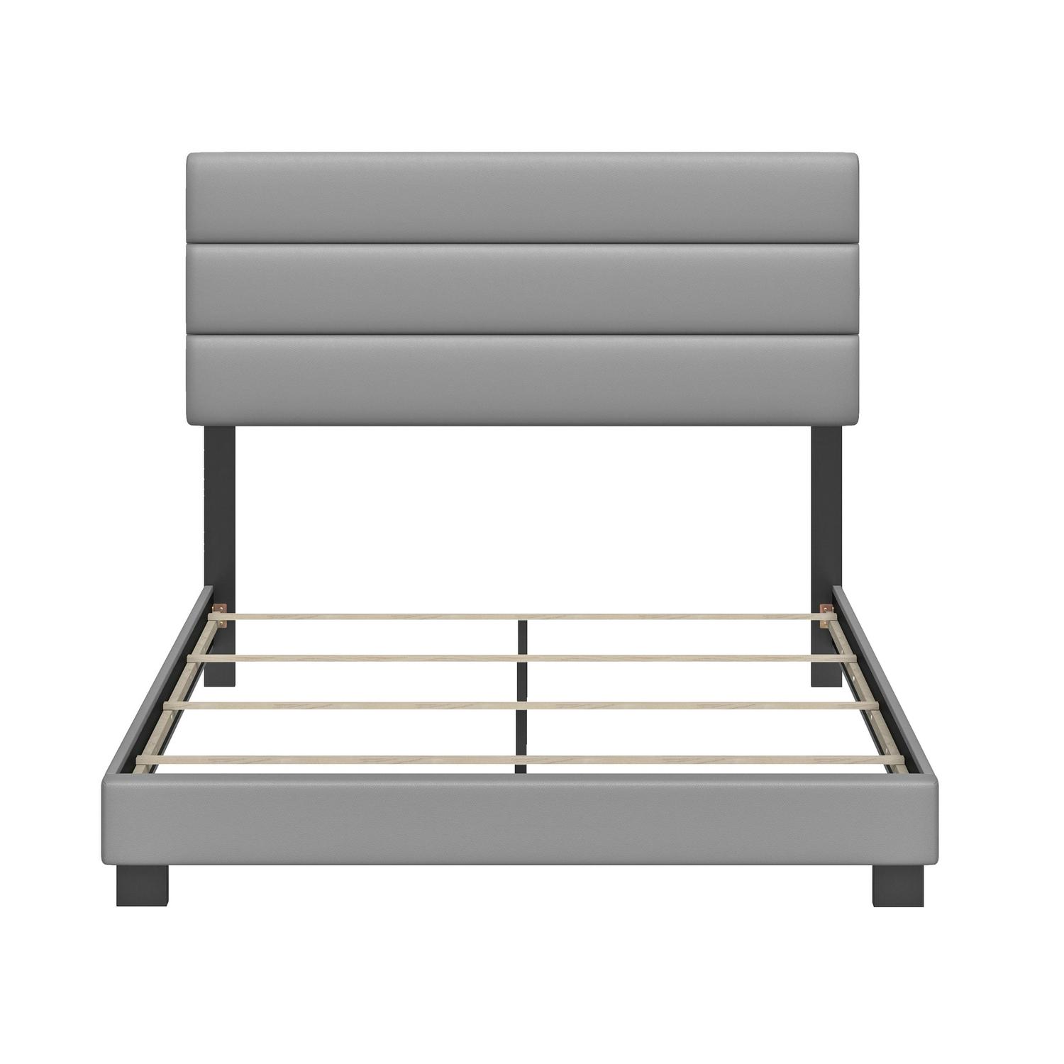 – Upholstered headboard features horizontal three-panel design