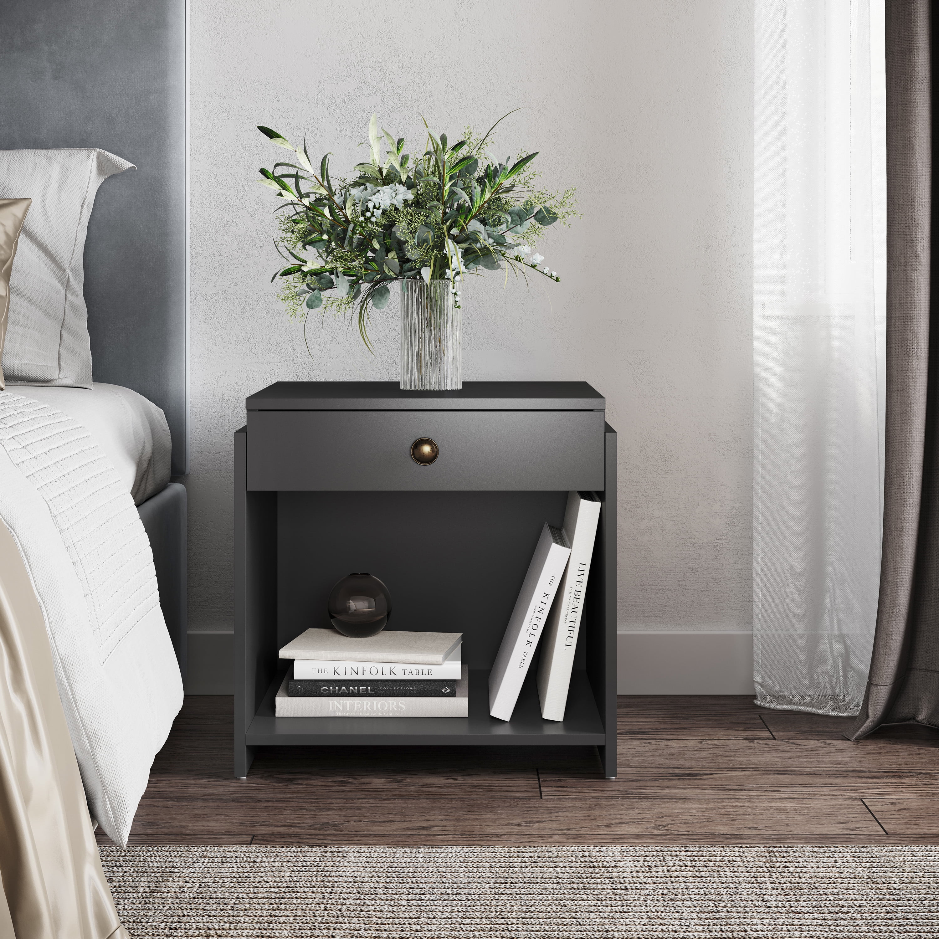 Modern 1-Drawer Nightstand: The Boyd Sleep Sydney Nightstand adds contemporary and modern style to your bedroom. Available in three wipe-clean laminate finishes with brushed pewter hardware, its clean lines and modern look make it a versatile accent piece. Add a touch of sophistication and extra storage to your bedroom, guest room, or any space that needs practical organization. Organized Storage Options: This one drawer modern nightstand provides a flexible combination of hidden and open storage. The drawer interior measures 15″ W x 1.8″H x 12.6″D: its smooth easy-glide drawer mechanism opens quietly and closes effortlessly, providing a safe spot to store personal items. A large lower cubby keeps books, electronics, or bedding within easy reach. Space-Saving & Economical – Measuring 19.69″ W x 15.75″ D x 19.69″ H, this nightstand offers practical storage solutions without taking up too much floor space. Its compact one-drawer design allows for efficient organization, making it a perfect choice for smaller bedrooms, apartments, dorm rooms, or limited spaces. Maximize your storage potential in small spaces with this modern bedside table. Versatile & Multifunctional – This nightstand isn’t limited to just bedside use. Its compact size and versatile design make it an ideal choice for use as a side table or end table in any room. Place it in your living room or home office to add a touch of modern style and provide extra storage space. The Boyd Sleep Sydney Nightstand provides a sleek and contemporary accent next to your sofa, armchair, couch, or desk. Easy 30 Minute Assembly – With clear instructions and all necessary hardware included, assembling this nightstand is a breeze. Spend less time on complicated assembly and more time enjoying the style and organization it brings to your space. Philips screwdriver required (not included).