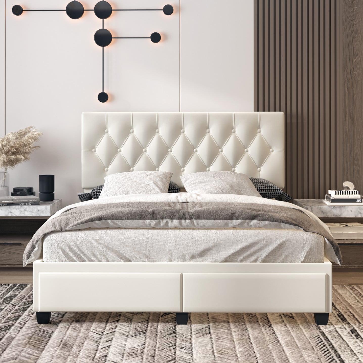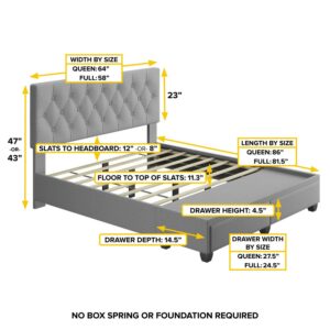 The Verona smoothly combines tufted linen or faux leather style with a space-creating double drawer design. Two easy glide drawers assure an understated, appealing option for your storage needs. A heavy-duty support desk comes pre-assembled with 8 cross slats for strength and support, meaning the Verona can be used with or without a box spring/foundation. The Verona can be assembled in less than 15 minutes.