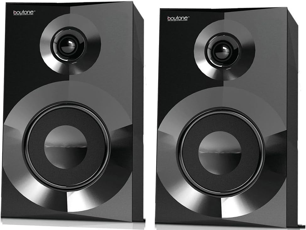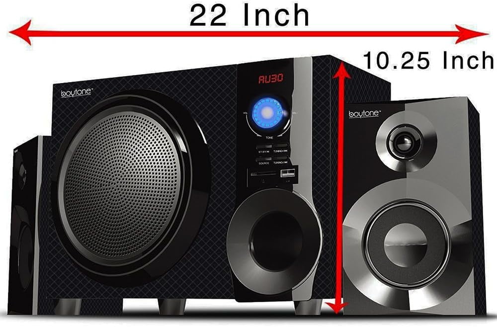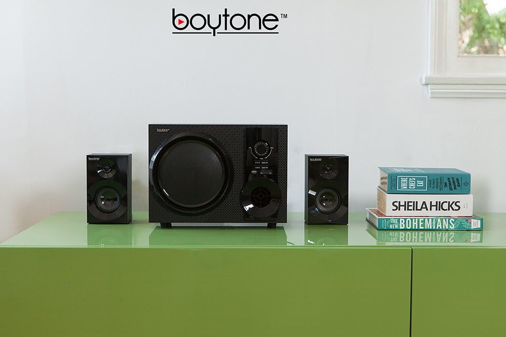 Boytone BT-210F Bluetooth Speaker: 2500W PMPO (peak music power output) FM tuner MP3 playback Bluetooth support USB/SD support Treble control Bass control Digital display Bluetooth speakers with FM include remote control 2.1 multimedia speaker