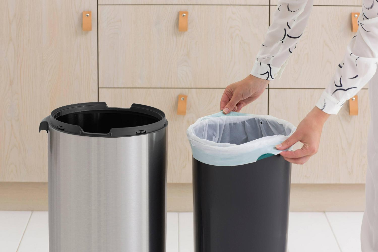 The newly designed lid of the Touch Bin New opens at the lightest touch, quietly and smoothly. Ventilation holes in the inner bucket allow air to escape when you insert the bin liner and prevent a vacuum. Sturdy carrying handle – makes Touch Bin easy to move even when full. It made of corrosion-resistant materials – durable and easy to clean.