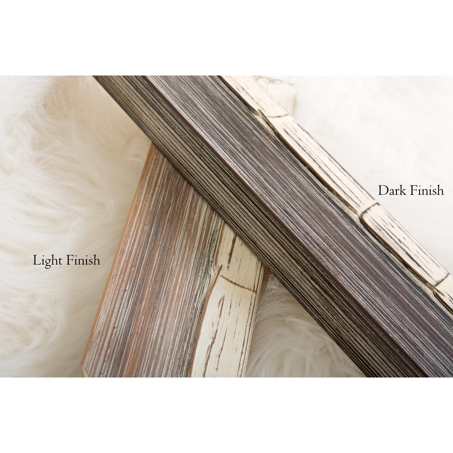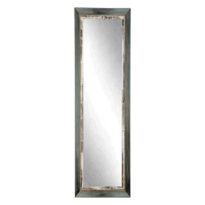 This weathered full length mirror features a dark gray grain finish. The 3 inch wooden frame has an angled front decorated with an inner distressed white border creating a unique rustic feel. This wooden mirror is an impressive accessory to hang or lean in a bedroom, bathroom or living space. Four hooks are also preinstalled allowing for a vertical or horizontal wall installation.