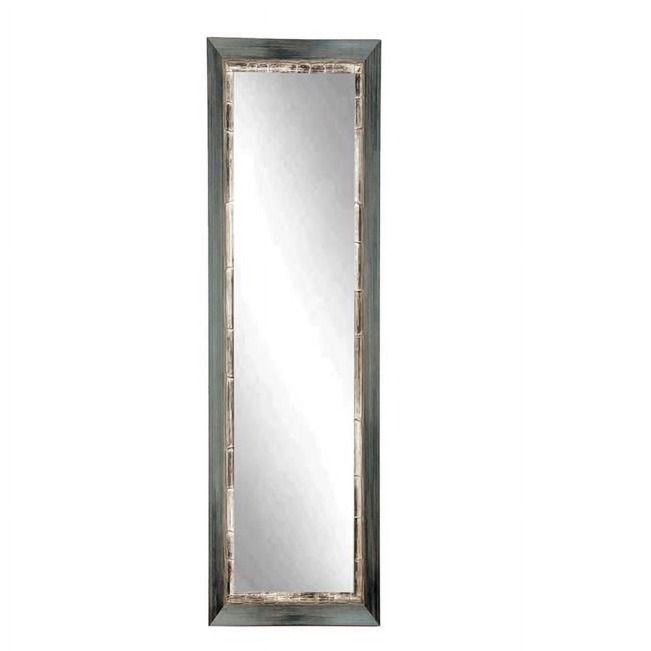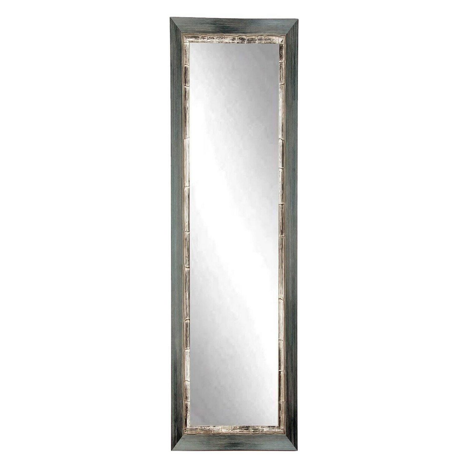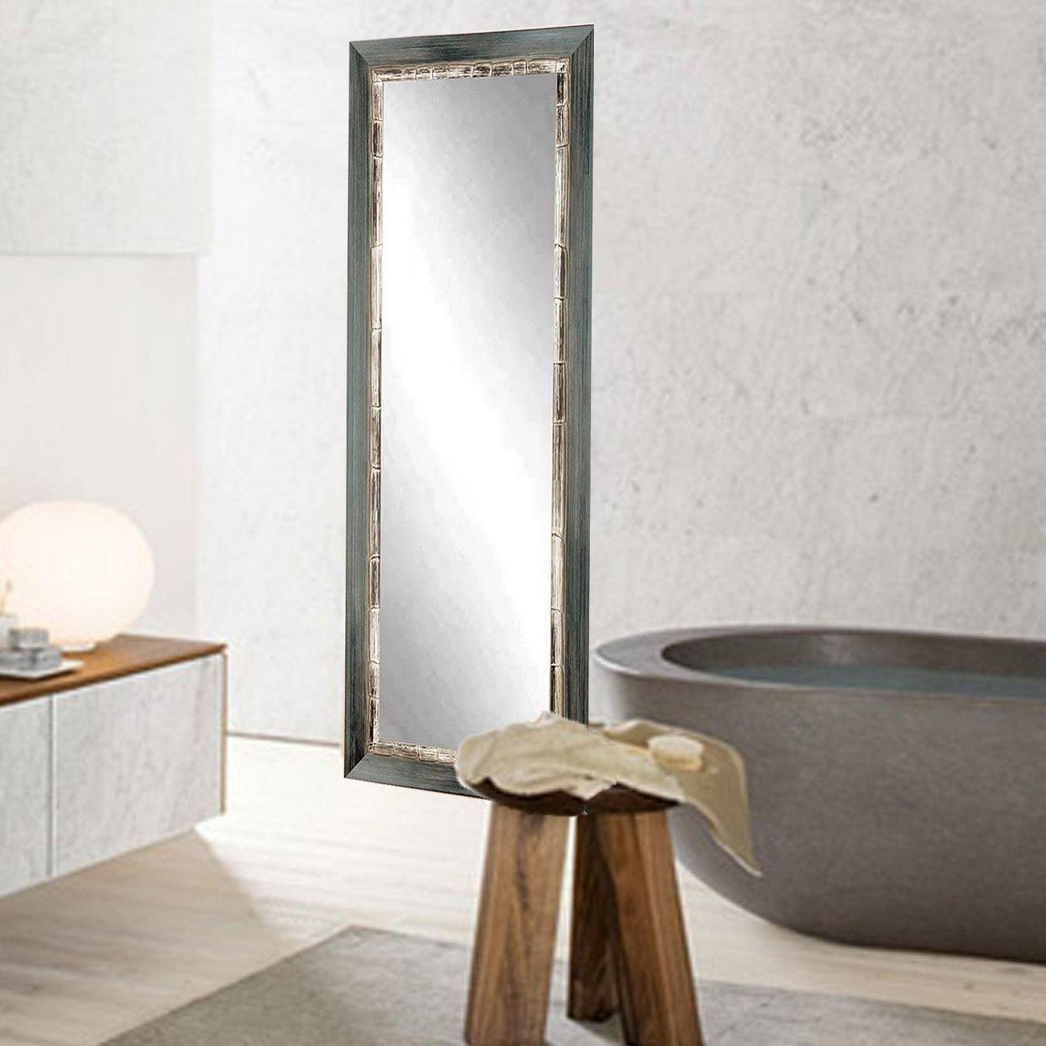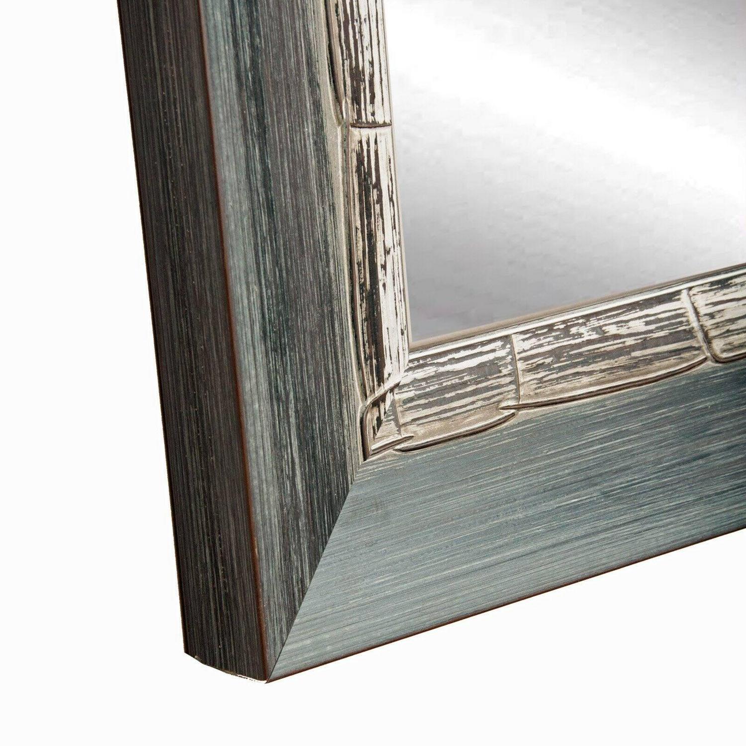 This weathered full length mirror features a dark gray grain finish. The 3 inch wooden frame has an angled front decorated with an inner distressed white border creating a unique rustic feel. This wooden mirror is an impressive accessory to hang or lean in a bedroom, bathroom or living space. Four hooks are also included allowing for a vertical or horizontal wall installation.