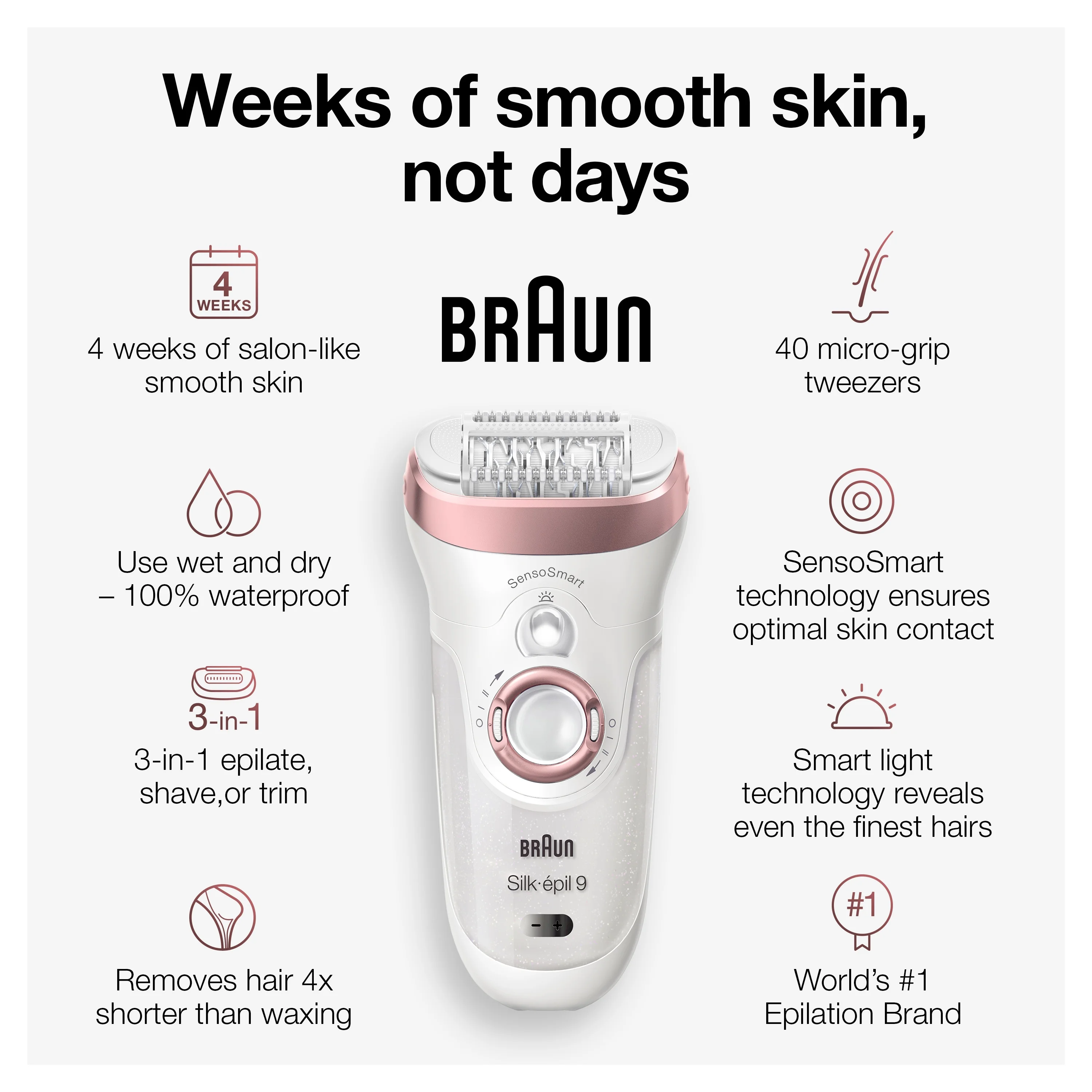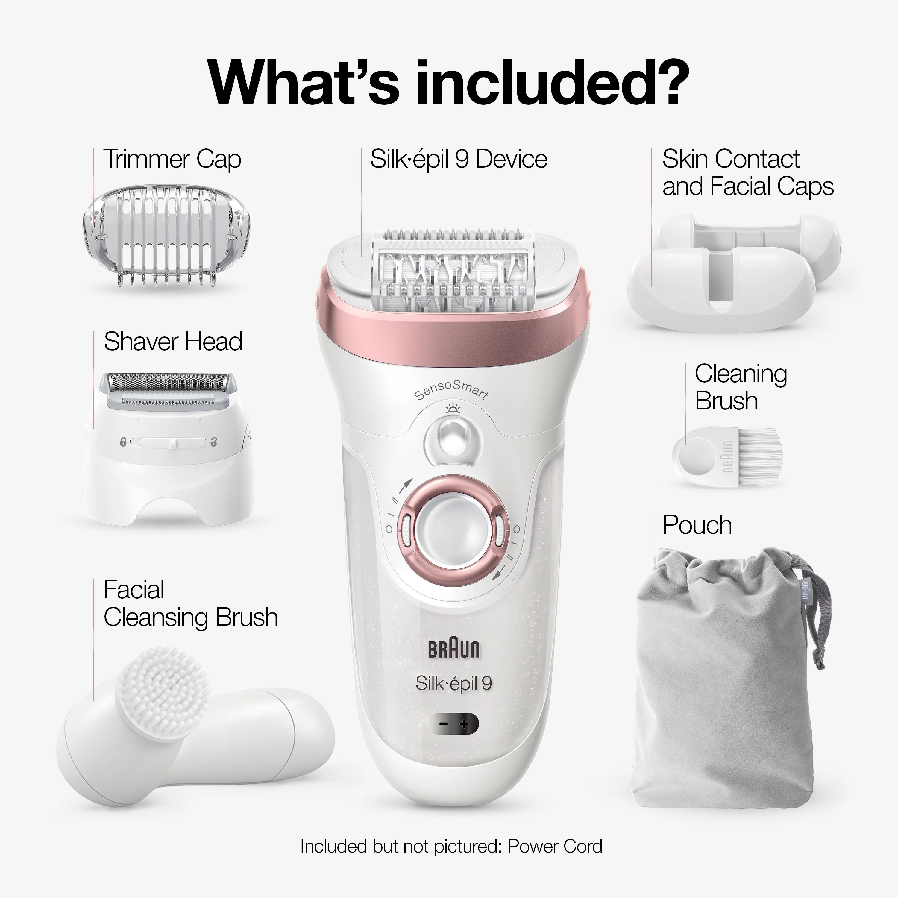 EFFORTLESS: Braun Epilator for women with a wide, pivoting head, for easier and more efficient hair removal FACIAL CLEANSING: gently oscillates to loosen and remove make-up, oil and impurities up to 6x better than manual cleaning. CONVENIENT: Ergonomic handle enables convenient use on all body areas LESS PAIN: 100% waterproof so you can epilate in the bath or shower for a less painful experience SMOOTH SKIN: Micro-Grip tweezer technology (40 tweezers) provides smooth skin for weeks, not days