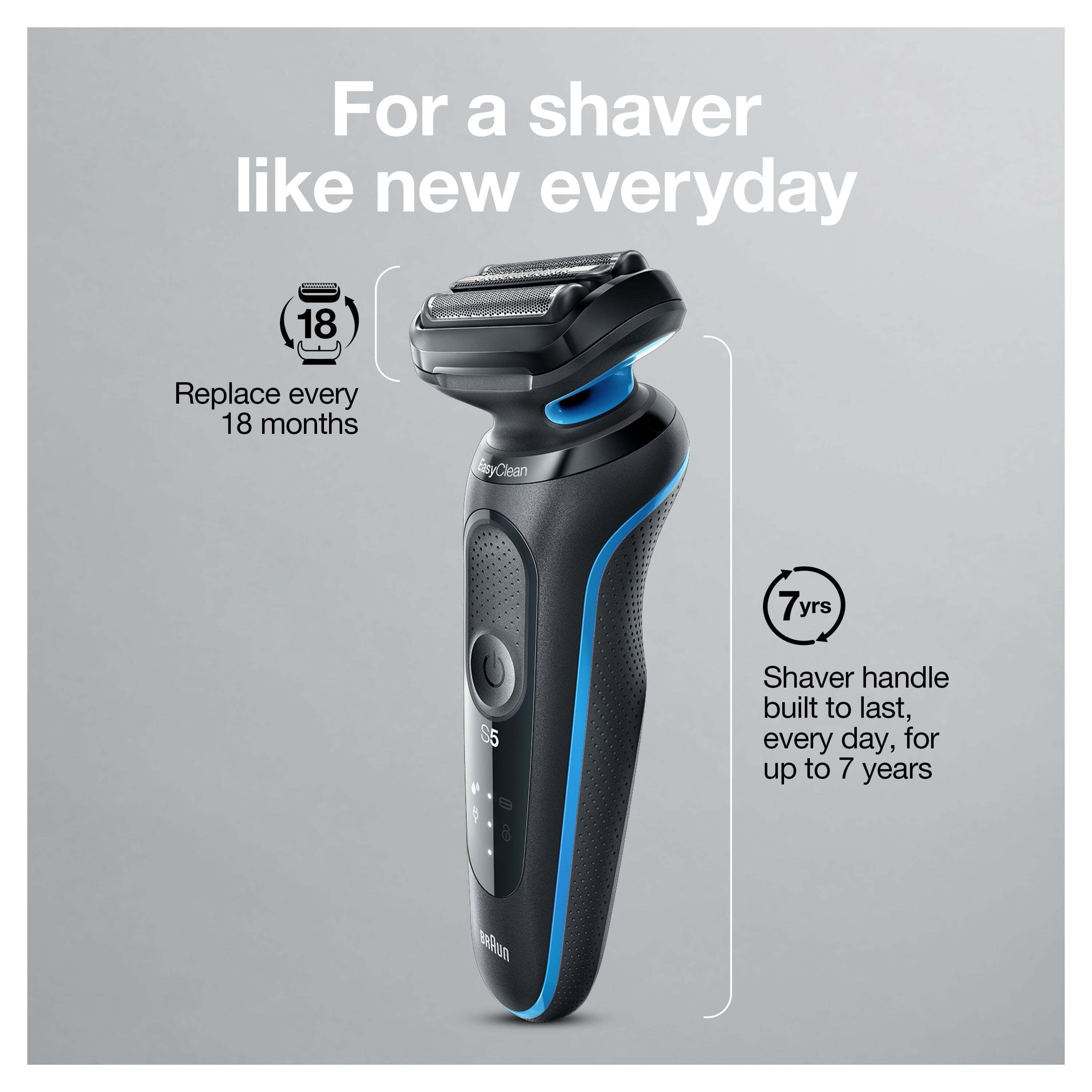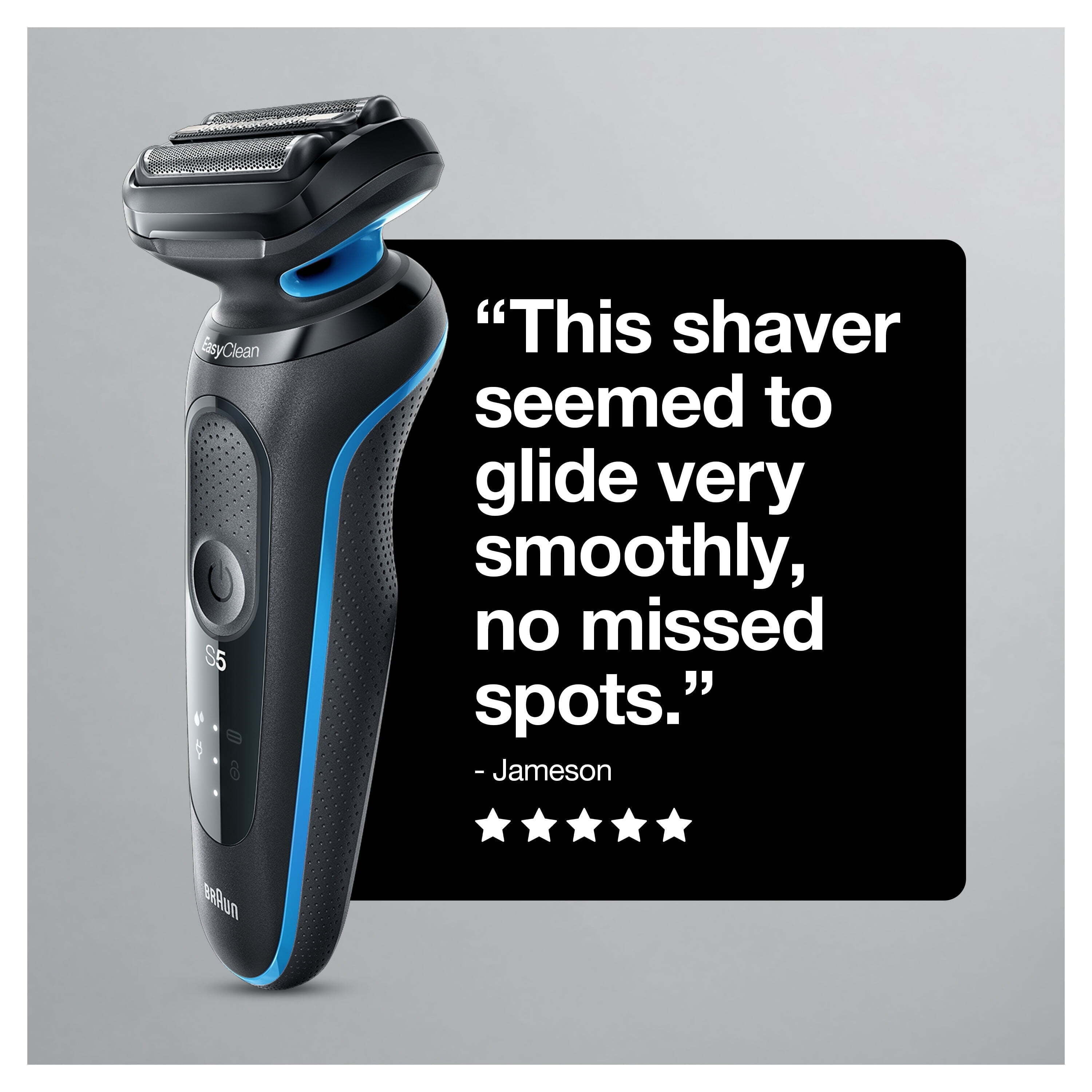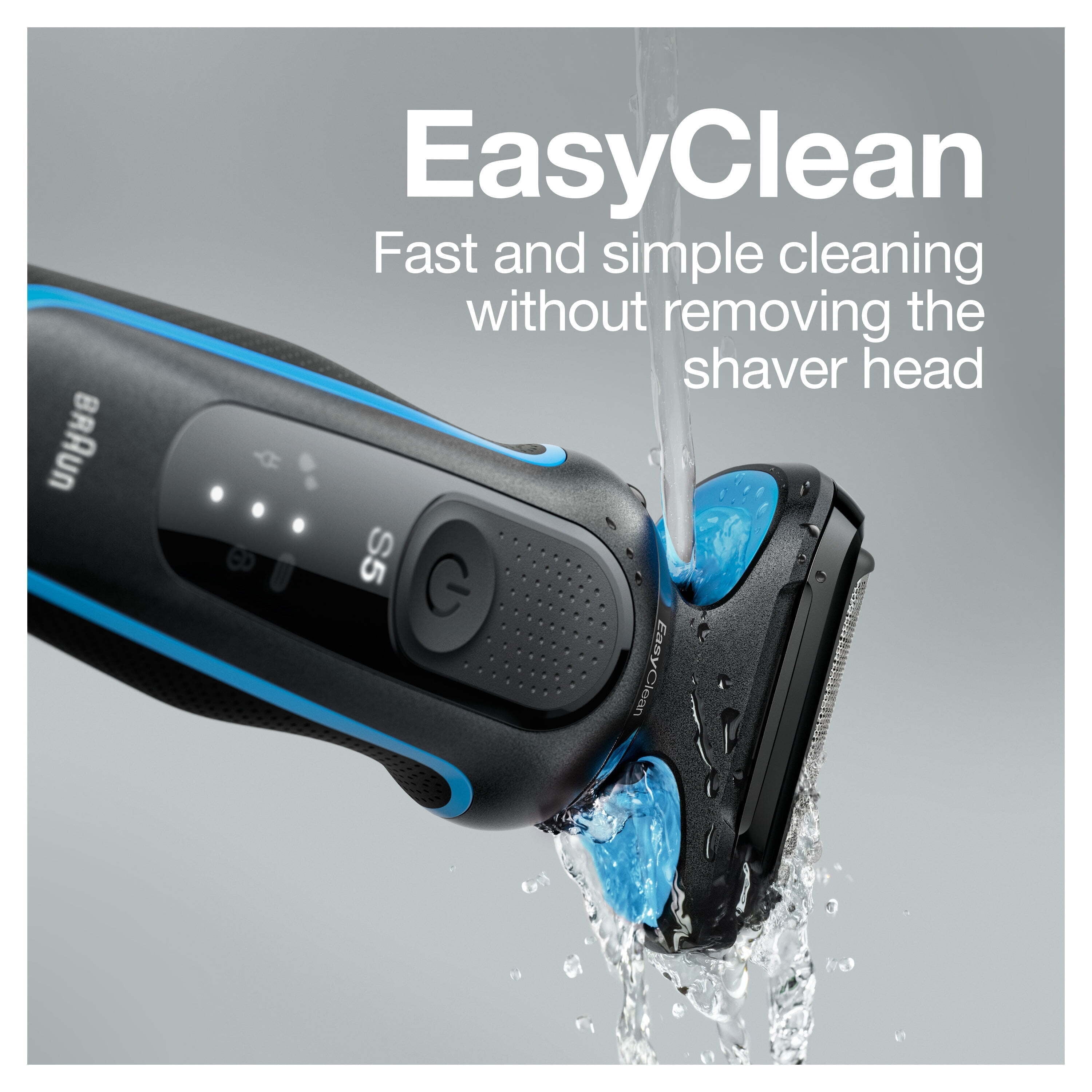 Close shaving is made easy with the Braun Series 5 Electric Shaver. This wet and dry foil shaver features three flexible blades that adapt fluidly to your facial contours. Plus, AutoSense technology reads and adapts to your beard, capturing and cutting more hair in every shave. For quick and easy cleaning, this Braun Series 5 Shaver has an EasyClean system that allows you to thoroughly rinse stubble off your electric razor without the need to remove the shaver head. The included precision beard trimmer attachment makes mustache and sideburn trimming simple-and with the convenient EasyClick design, you can easily swap out shaver attachments to accommodate a variety of grooming needs. Braun Series 5 Electric Shavers for men use a powerful Li-Ion battery that provides up to three weeks of shaving (50-minute runtime) and a 5-minute quick charge option. These wet and dry shavers are 100% waterproof and can be used with foam, gel or even under the shower. Each shaving kit includes a Smart Plug charger for automatic 100 to 240 voltage adjustment. All Series 5 electric razors for men are made in Germany with premium craftsmanship.