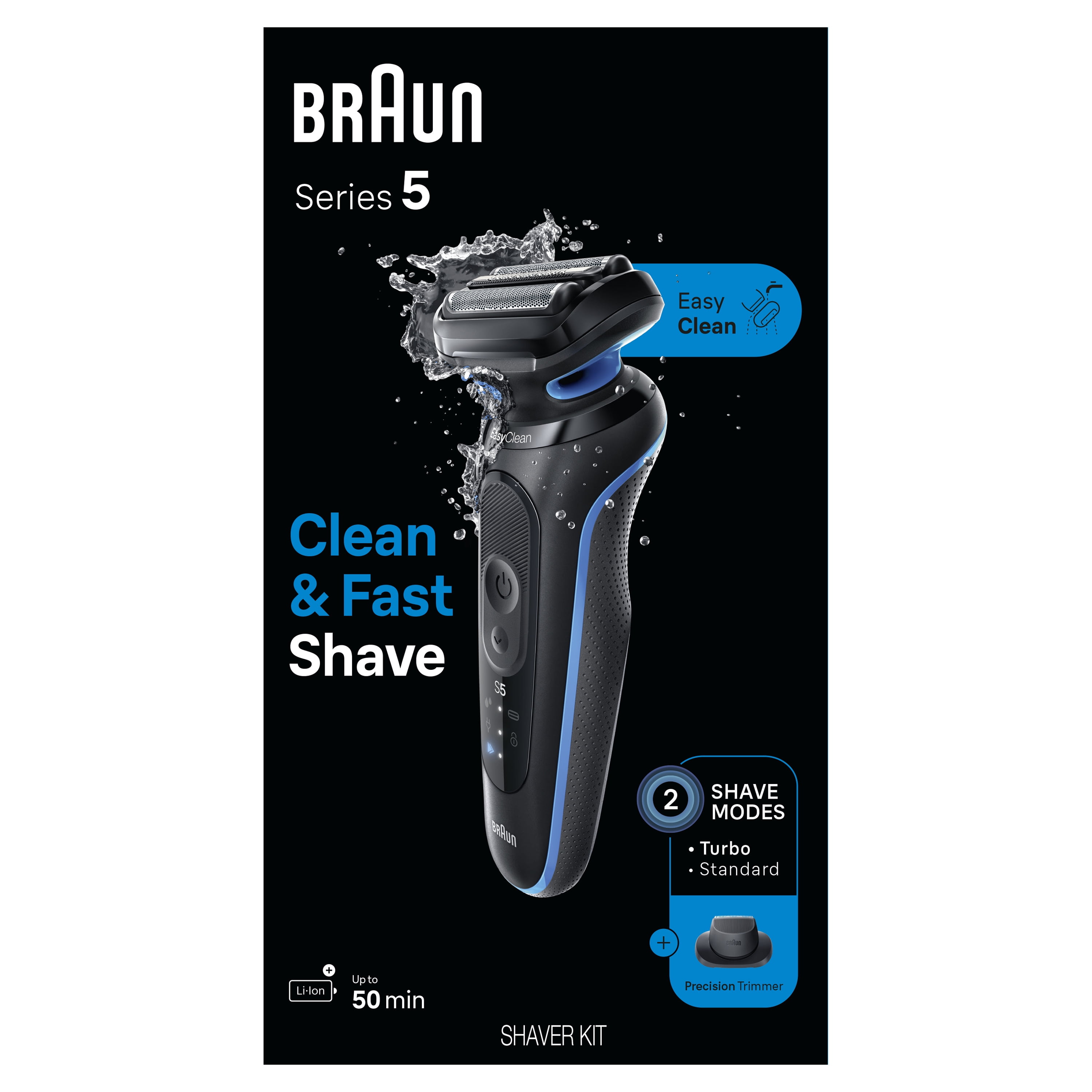 CLEAN AND FAST SHAVE: Braun Series 5 Shaver for a clean and fast shave. Comfortable on your skin 3 FLEXIBLE BLADES: The shaver adapts to your unique face contours to deliver a close shave while also protecting your skin 2 SHAVE MODES: now with Standard and Turbo mode for an extra fast shave with up to 25,500 cutting actions per second BUILT TO LAST: Engineered in Germany, Wet & Dry use, up to 50 min Li-Ion battery time INCLUDES: Precision Trimmer EasyClick attachment