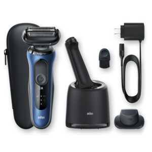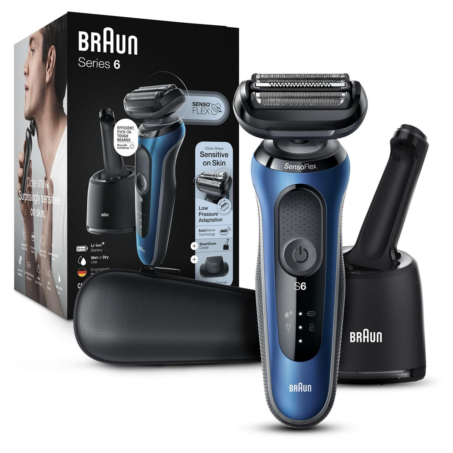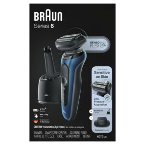 Braun Series 6 electric shaver for men features a dermatologically tested SensoFlex swivel head and SensoFoil blades that enable low pressure adaptation for closeness, whilst remaining sensitive on your skin. The Li-Ion Battery provides up to 3 weeks of shaving and a 5 min quick charge. This men’s electric razor is 100% waterproof for Wet & Dry use. Includes a 4in1 SmartCare Center, Precision Trimmer attachmentIncludes:1x Series 6 Electric razor for men – Blue1x SmartCare Center1x Precision Trimmer attachment1x Travel case1x Smart plug for automatic 100-240 voltage adjustment1x Cleaning Brush