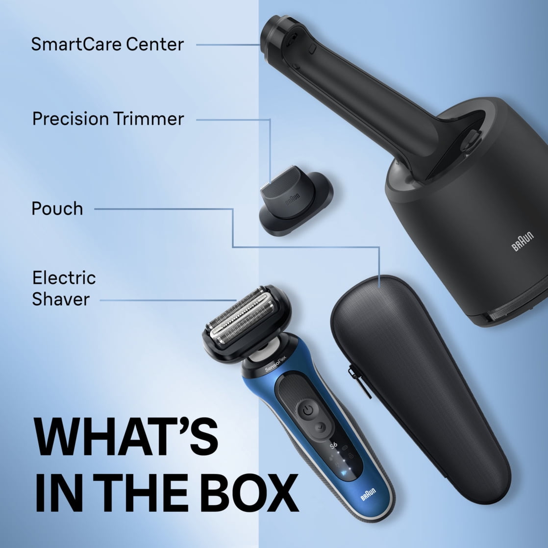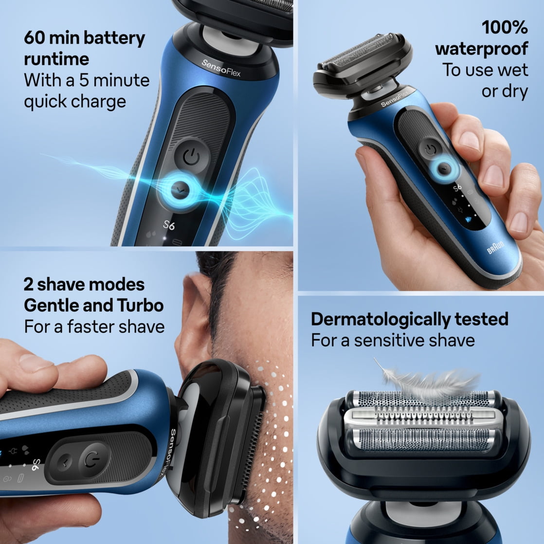GENTLE SHAVE FASTER*: Braun Series 6 Shaver: for a gentle shave, faster than ever before. Dermatologically tested, now with Sensitive SkinGuard (*vs previous Braun Series 6) MINIMIZE PRESSURE ON THE SKIN. The SensoFlex Shaving Head minimizes pressure on the skin for closeness even on sensitive skin 2 SHAVE MODES: now with Gentle mode and Turbo mode for an extra fast shave with up to 28.5% more cutting actions (vs Gentle mode) per second BUILT TO LAST: Engineered in Germany, Wet & Dry use, up to 50 min Li-Ion battery time INCLUDES: 4in1 SmartCare center, Precision Trimmer EasyClick attachment, and Pouch