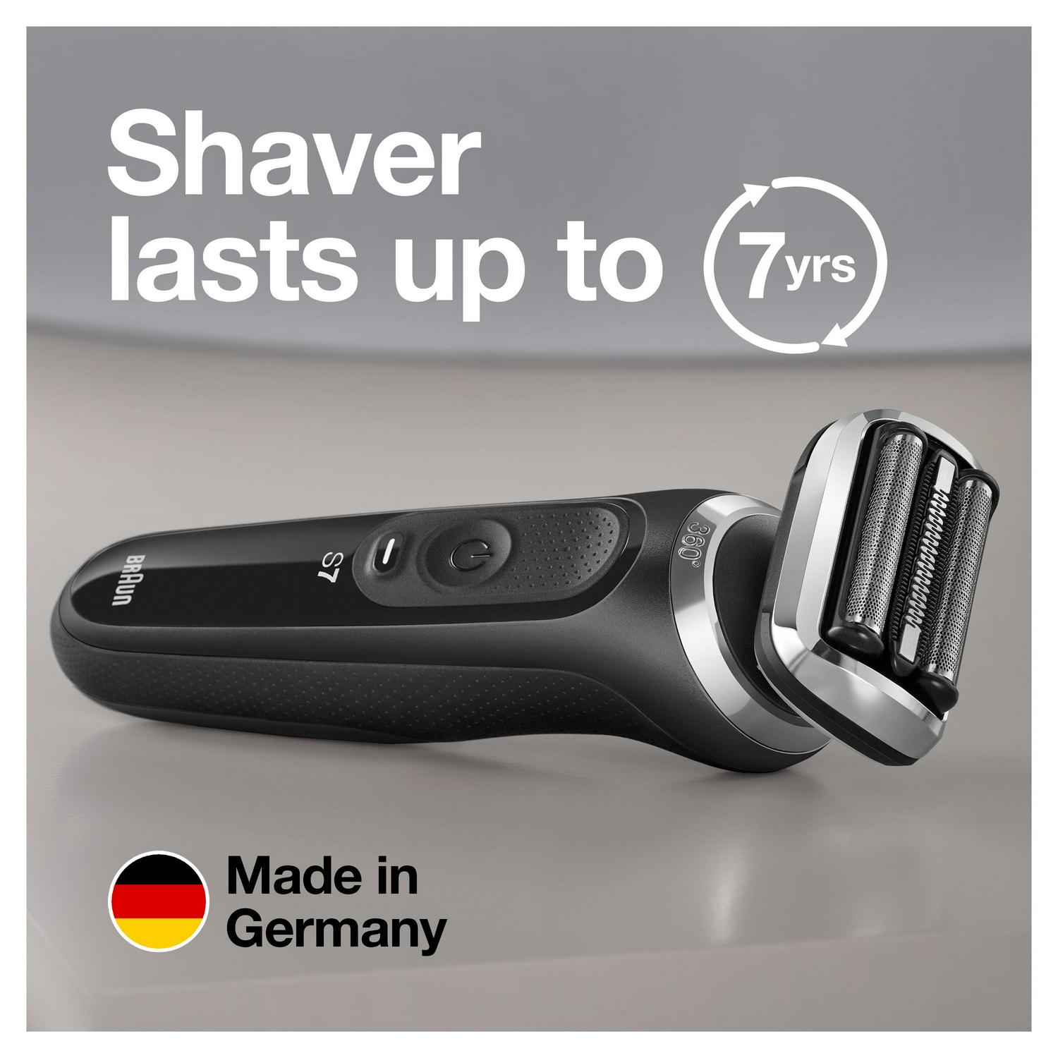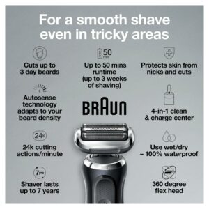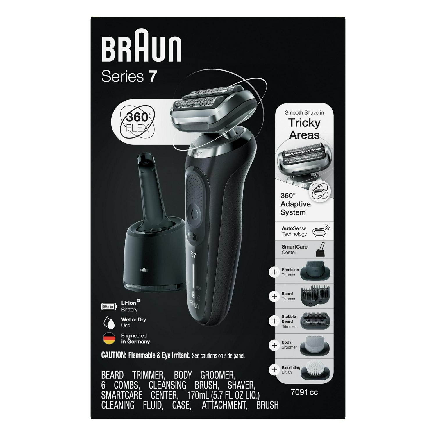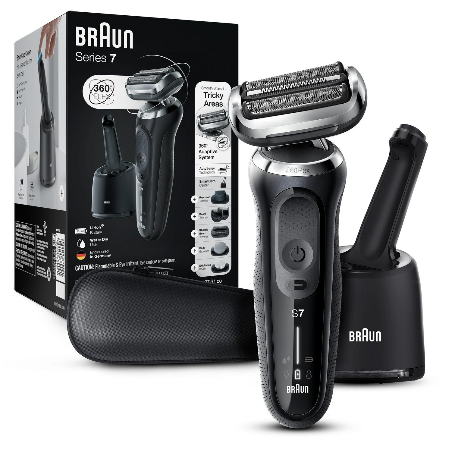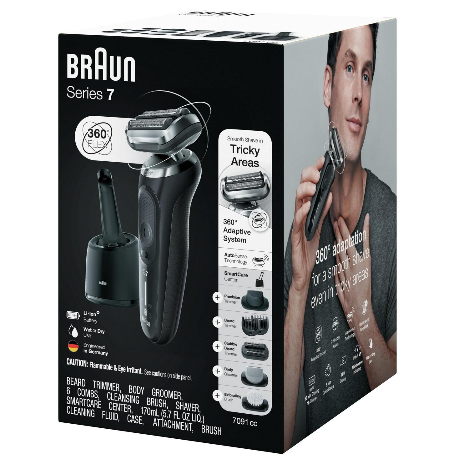 Braun Series 7 Flex electric shaver with Stubble Beard Trimmer, Body Groomer and Exfoliating Brushfor men with 360 degrees adaptation for a smooth shave. Features AutoSense technology that reads and adapts to your beard density, removing more hairs in every stroke.The Li-Ion Battery provides up to 3 weeks of shaving and a 5 min quick charge. This men’s electric razor is 100% waterproof for Wet & Dry use.Includes a 4in1 SmartCare center, and a Beard Trimmer attachment.Box includes·1x Series 7 Electric razor for men – Black·1x SmartCare center·1x Beard Trimmer attachment·1x Stubble Beard Trimmer attachment·1x Body Groomer attachment·1x Exfoliating Brush attachment·1x Travel case·1x Smart plug for automatic 100-240 voltage adjustment·1x Cleaning Brush