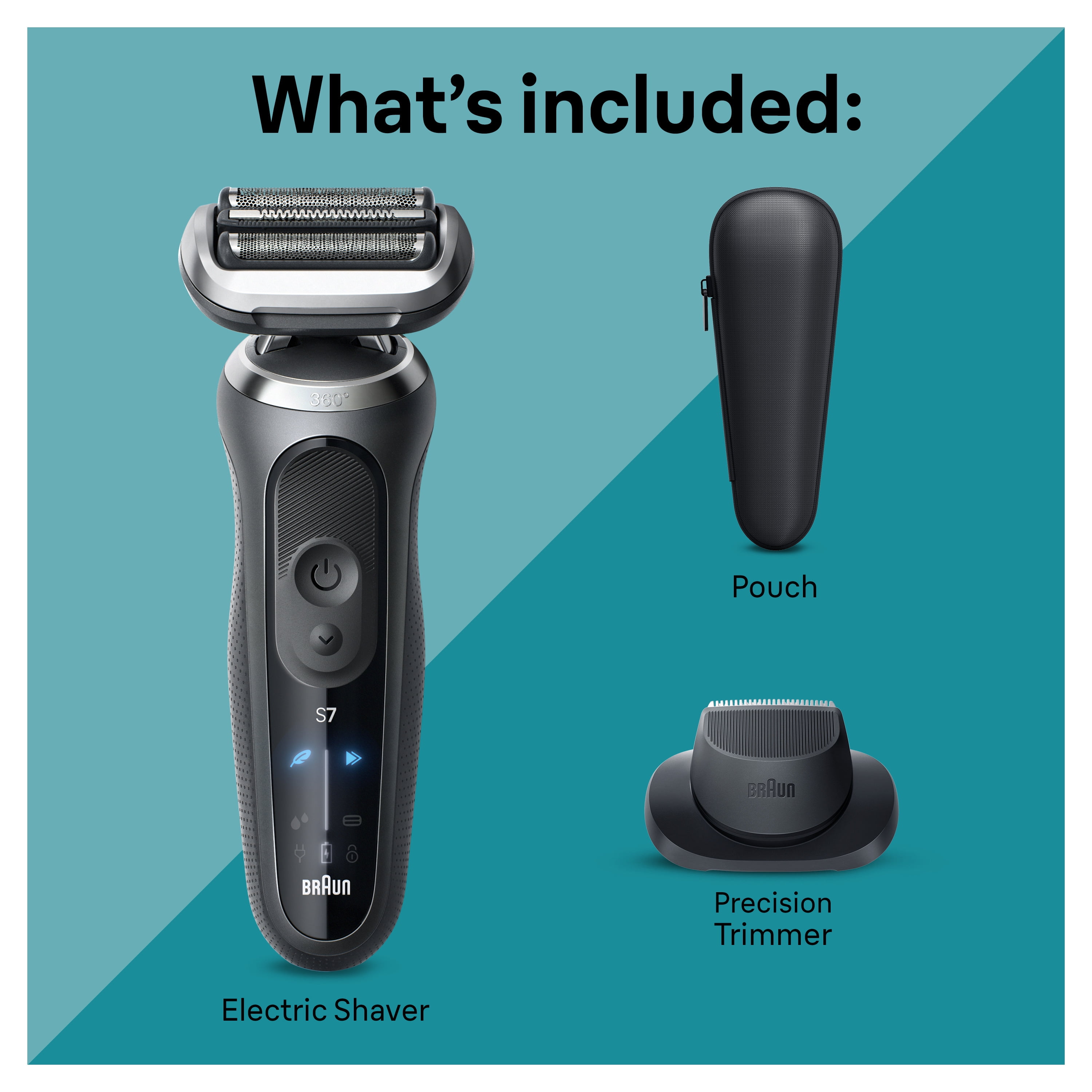 Braun Series 7 7120s electric shaver for men delivers a close shave faster, thanks to the floating 360 degrees Flex Head that adapts to your contours for an extremely close shave, even in tricky areas. To easily customize your shave, select Turbo mode for an extra fast shave, Gentle mode for a gentle shave on sensitive skin, or Standard mode for a balanced shave. Easily upgrade your shaver with different attachments for all your grooming needs. Made to adapt to your shaving needs, this waterproof electric shaver features AutoSense technology that adjusts power to your beard density. The men’s shaver is made in Germany for guaranteed quality. Box includes: 1x Series 7 shaver, Cleaning Brush, Precision Trimmer, and Pouch.