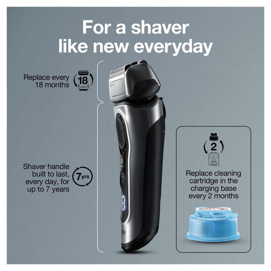 POWERFUL YET GENTLE: This electric shaver has a 40 degree adapting head and floating blades to gently adapt to facial contours. Braun’s unique Sonic Technology with 10,000 micro-vibrations capture more hair* while gently gliding over the skin. *Tested vs Braun Series 7 products LONGER BATTERY LIFE*: Li-Ion Battery with a 60-minute life and 5-minute quick charge, this razor is powered to last. *Tested vs Braun Series 7 products INCLUDES 4-in-1 SmartCare center that intelligently selects a cleaning program, hygienically cleans, lubricates, dries, and charges your razor; cleaning cartridge; travel case; cleaning brush; charging cord; and user manual. BUILT TO LAST: Made in Germany, this wet & dry shaver is 100% waterproof and can be used with foam, gel or even under the shower. PREMIUM SHAVER DESIGN: The high-quality coating is smudge-proof and includes 3 layers of coating as thin as human hair for a supremely sleek razor.