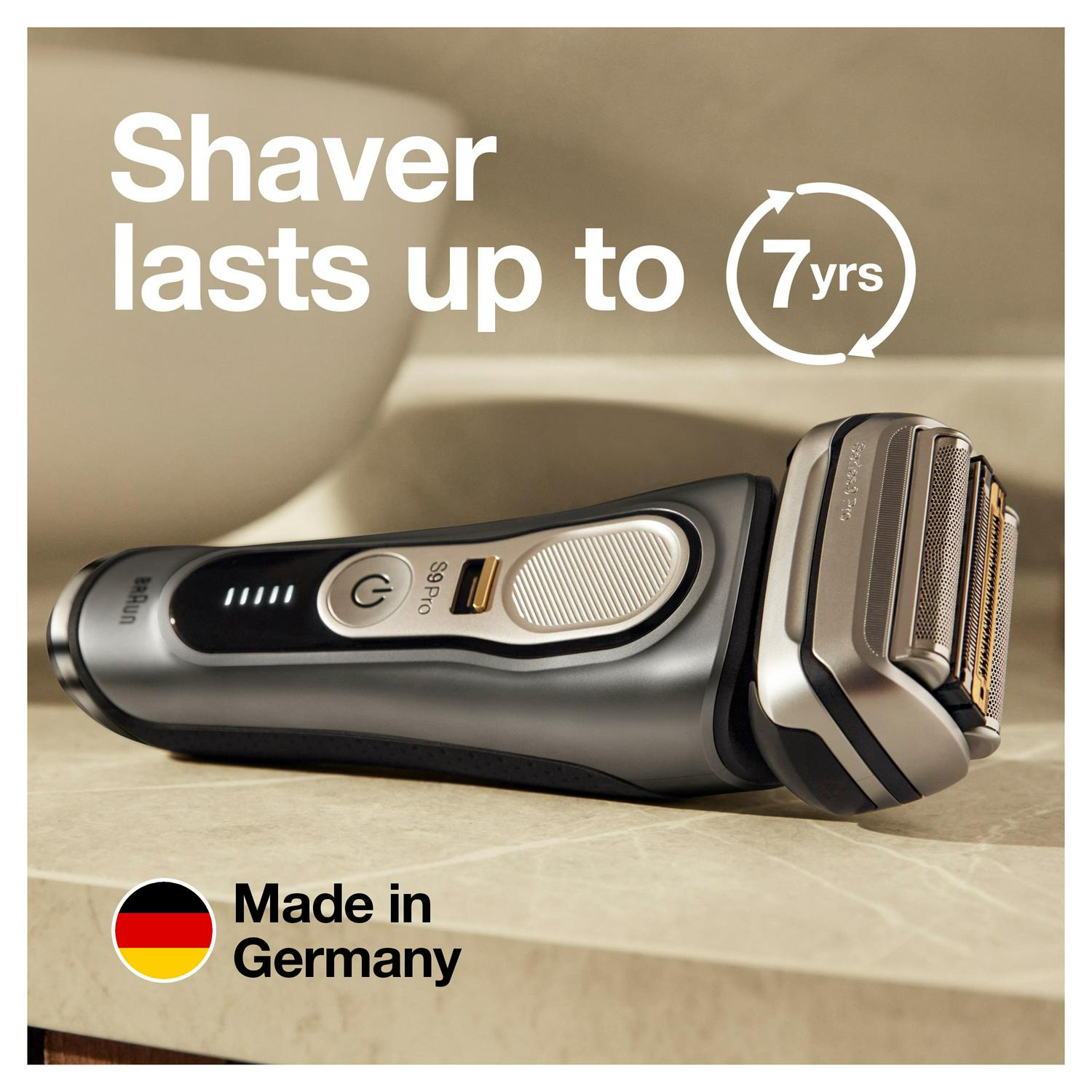 Braun Series 9 Pro is the world’s most efficient electric shaver, reinvented to be even better. This wet and dry foil shaver provides you with both a close and gentle shave, no matter if it’s a 1, 3, or 7-day beard. The Pro-Lift trimmer captures and cuts flat lying hair, combined with our unique Sonic Technology to help shave up to 10% faster* for a more gentle shave in fewer strokes. Braun’s Auto Sense technology reads and adapts to your beard, providing a close shave even on dense beards. For unparalleled precision and control, this electric shaver features a redesigned precision switch to lock the shaver’s head and easily capture tricky hair in those hard-to-reach areas like under the jawline and nose. A precision beard trimmer slides out of the back of the electric razor for easy and more accurate sideburn shaping. You can now shave cordless for longer (60 minutes) with 20% more battery than the previous Series 9. Braun Series 9 Pro 9465cc comes with a Clean & Charge station that hygienically cleans, lubricates, dries and charges your electric shaver at the touch of a button. Each shaving kit includes a Smart Plug charger for automatic 100 to 240 voltage adjustment. All Series 9 electric razors for men are made in Germany with premium craftsmanship.