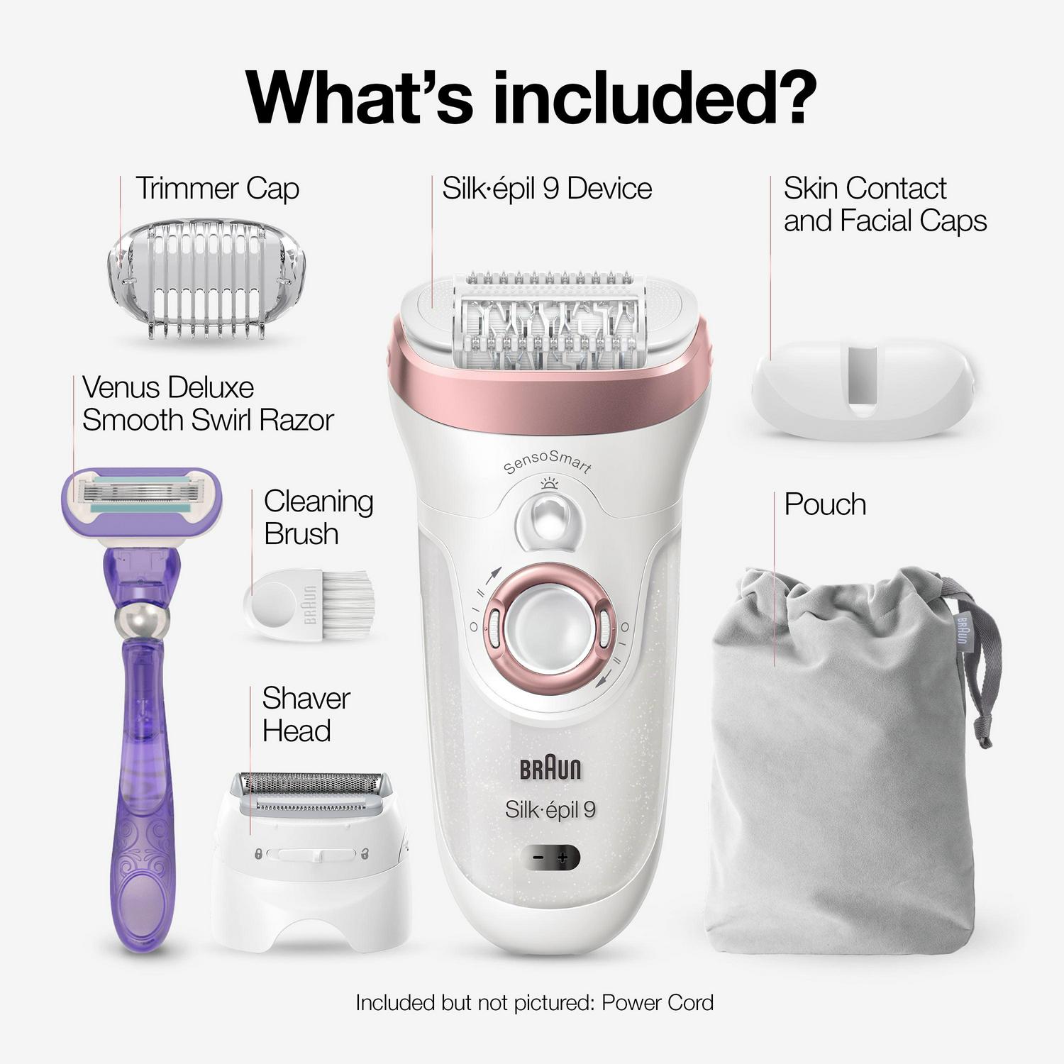 The Braun Silk-epil 9-870 with a wide head for ultra fast epilation. Enjoy weeks of salon-smooth skin thanks to Micro-Grip technology and a 40% wider head that removes hairs as short as 0.5mm. The shaver and trimmer head gives you added options for sensitive areas and the epilator for women is 100% waterproof, which means you can epilate in the bath or shower for a painless experience. Box includes: 1 X Epilator 1 X Shaver Head 1 X Trimmer Head 1 X Pouch 1 X Venus razor 1 X Cleaning Brush 1 X Charger