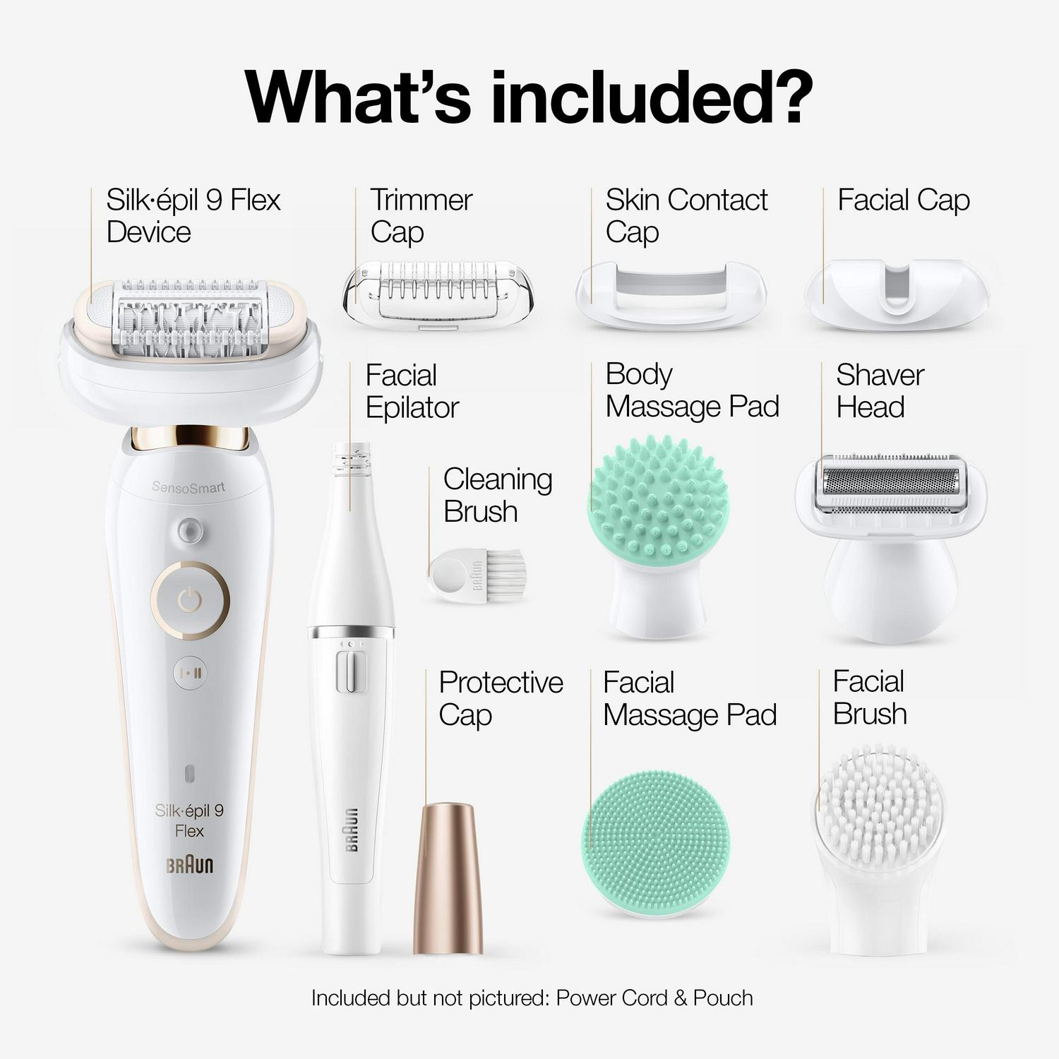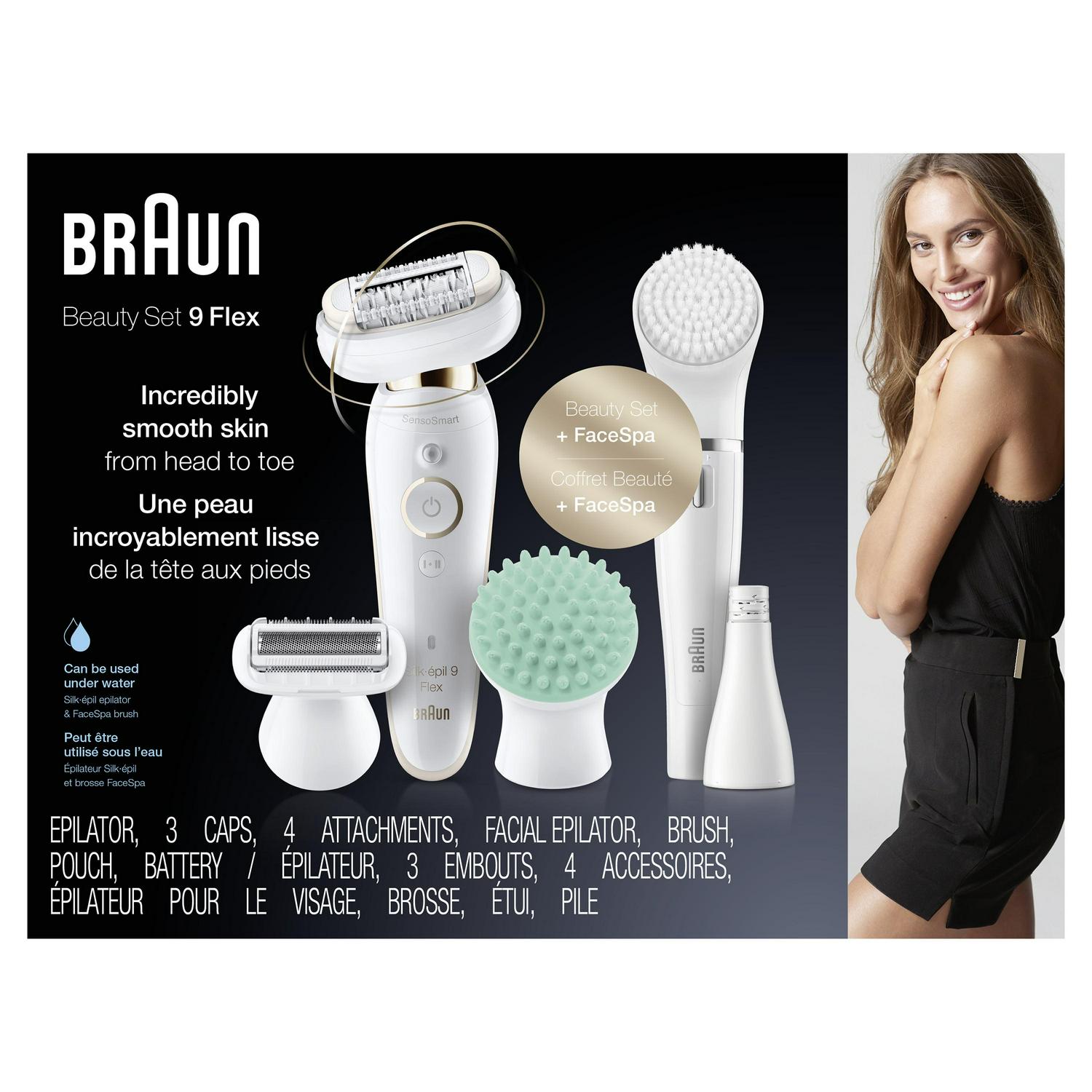 The new Braun Silk-epil 9 Flex 9-300 beauty set is the world’s 1st epilator for women with a fully flexible head, for effortless hair removal. Enjoy weeks of salon-smooth skin thanks to Micro-Grip technology and a 40% wider head that removes hairs as short as 0.5mm. The beauty set includes 4 additional attachments so you can shave, trim, massage and exfoliate, plus Face Spa with a facial epilator, cleansing brush to break free from skin impurities and massage pad for skin vitality. Box includes: 1 X Epilator1 X Shaver Head 1 X Trimmer Head 1 X Braun Face Spa 1 X Face Spa Epilator 1 X Face Spa Cleansing Brush 1 X Face Spa Massage Pad 1 X Pouch 1 X Body Massage Pad 1 X Cleaning Brush 1 X Charger 1 X AA Batteries