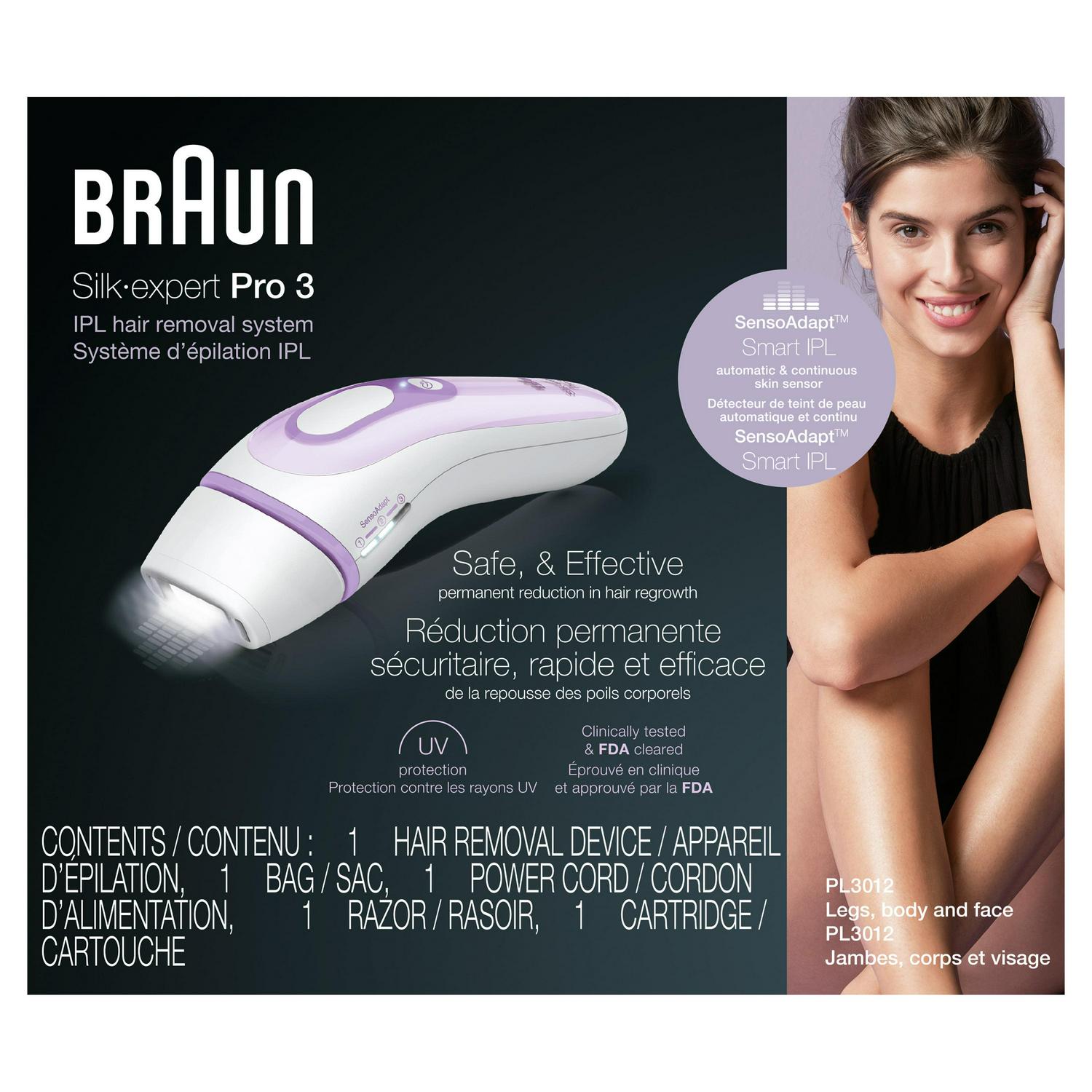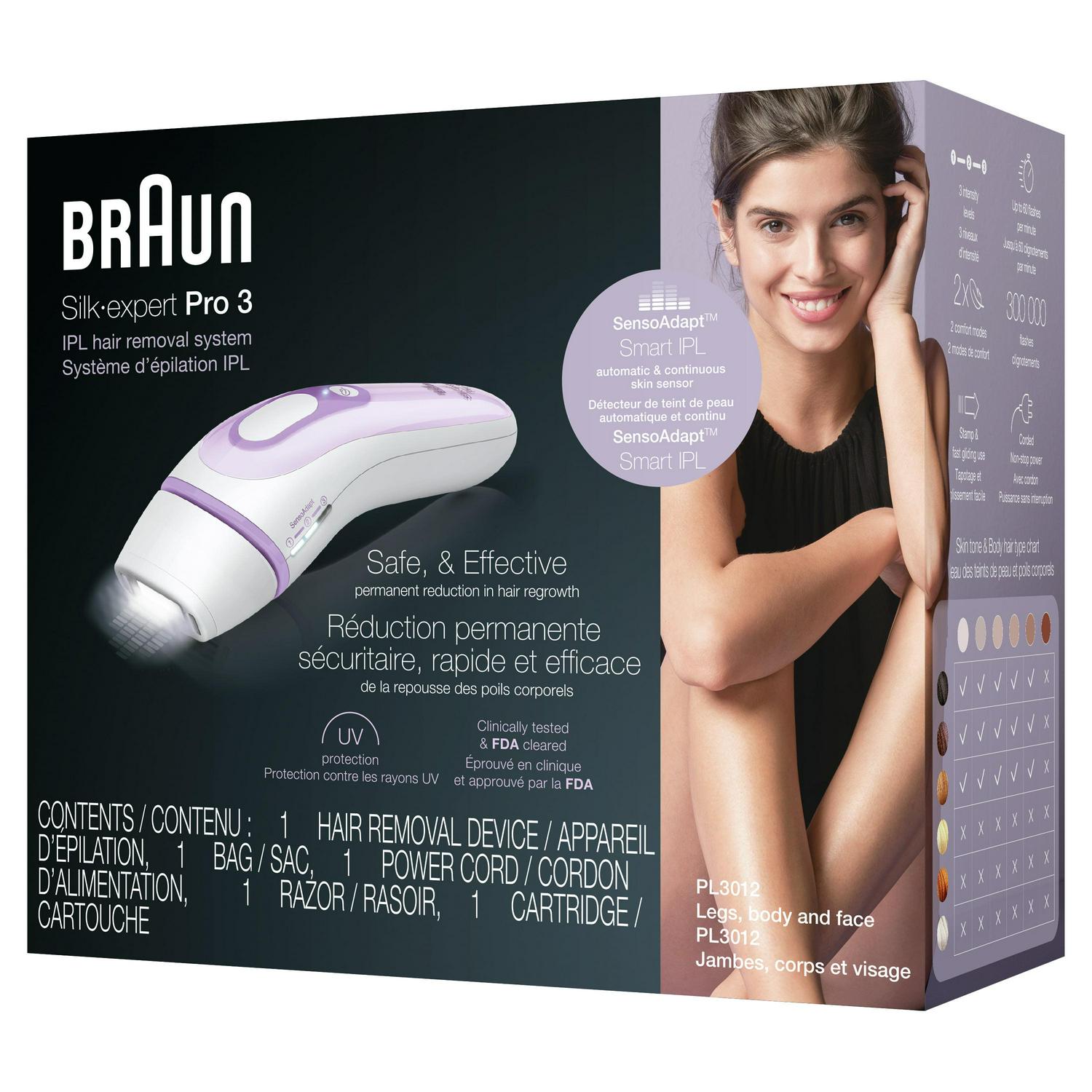 Silk·expert Pro, Braun’s latest generation IPL. Silk·expert Pro 3 ensures permanent hair reduction in just 3 months*. The safest IPL technology, clinically tested and dermatologically accredited as skin safe by a leading international skin health organization (Skin Health Alliance). The only IPL that automatically and continuously adapts to skin tone for a safe and effective permanent visible hair removal. Now with a precision head to tackle smaller areas like the face, bikini line or underarms. Get results 2 times faster than with previous Silk·expert 3: just 9 minutes for both legs. 300,000 flashes, 20% more than previous Silk·expert 3. *Assessed on lower leg, armpits & bikini, following the treatment schedule. Individual results may vary. **For more information, visit Braun.com Box includes: 1 X IPL hair removal device 1 X Venus razor 1 X Razor cartridge 1 X Beauty bag 1 X Power cord