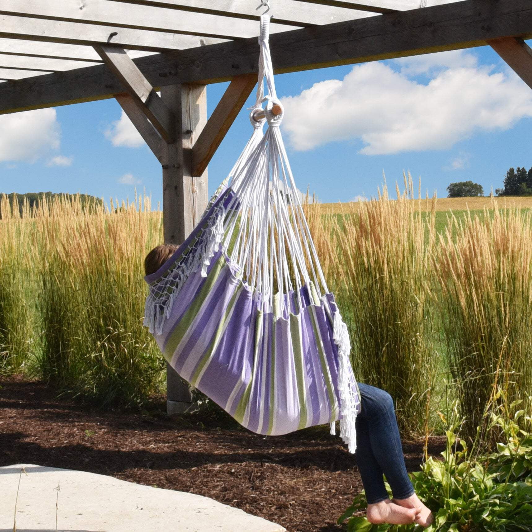 This Brazilian Hammock Chair is constructed of tightly woven 100% cotton, making this the most relaxing chair you’ll own. Now available in ten specially-selected color combinations with a coordinating, hand-crocheted fringe on both ends that adds a Bohemian touch to any space. Once set up, there’s additional fabric that stretches up behind you, providing you with the perfect place to rest your back. The hammock chair can be used both indoors and outdoors due to its small footprint and arrives with the wooden spreader-bar and additional sling. The hooks and springs are sold separately.