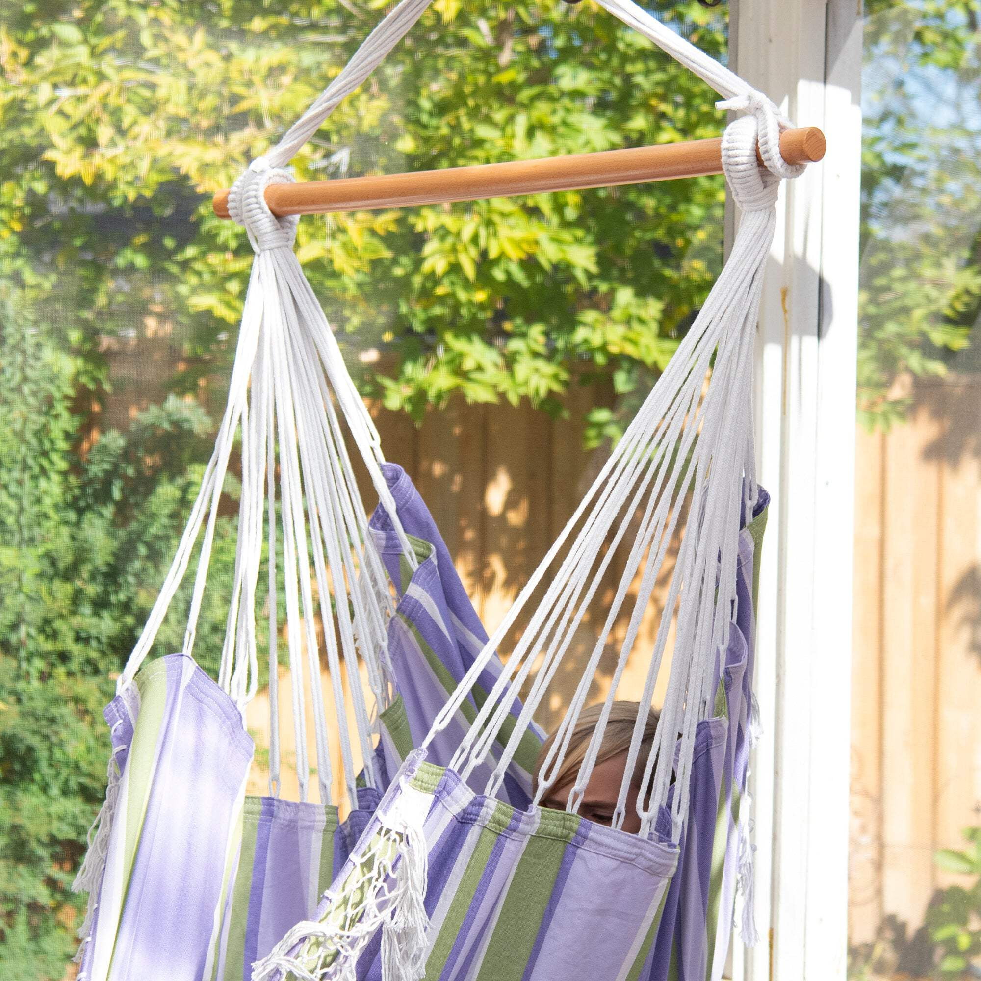 Tightly woven with 100% cotton cloth, allowing for a soft and airy, breathable fabric. Designed like a chair, this hammock is easy to get in and out of. Comes with the wooden spreader-bar and an additional sling from which you can hang the chair from. Hooks and springs sold separately. Accommodates one adult, for a total capacity of 250s.