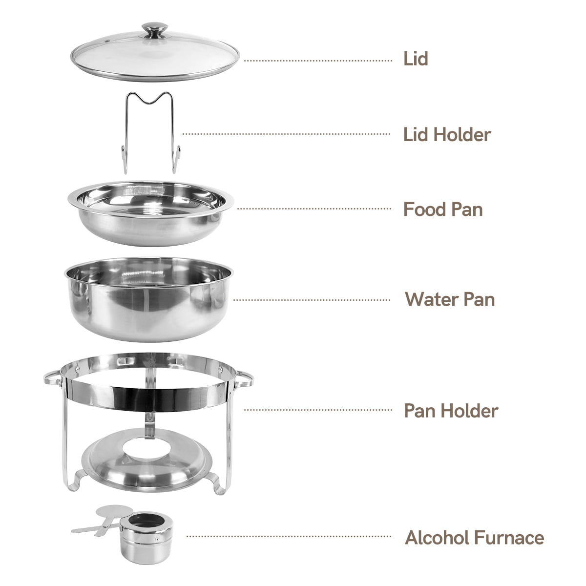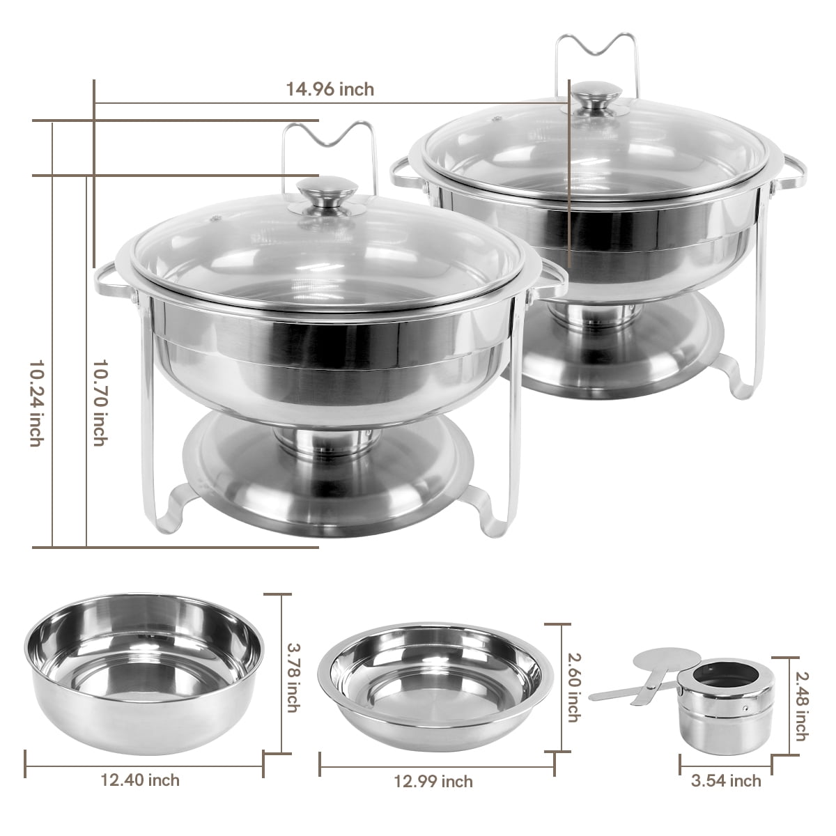 Features: BreeRainz stainless steel chafing dish buffet set will not rust, corrode or lose its luster. A polished, mirror finish completes a perfect presentation of the buffet warmer. Comes with a lid holder for easy lid placement. The transparent glass lid of chafing dish makes it easy to observe the food condition. Brushed, glossy steel frame is sturdy. Non-stick bowl, easy to clean with dishwashing liquid and dry with a soft towel. When the round chafing dish is stored, all components are nested within each other to save space. Suitable for weddings, parties, picnics, birthdays, and gatherings.Specification: Volume: 3.7L / 4 QT Material: Stainless Steel Package Size: Approx. 13.3″ X 13.0″ X 8.9″(L X W X H) Alcohol Furnace Size: 3.5″ (Dia.) X 2.5″(H) Product Packaging: 2* Lid 2* Lid Holder 2* Water Pan 2* Food Pan 2* Chafing Dish Frame 2* Fuel Can Using Tips: This type of stainless steel cutlery is not suitable for cleaning with steel wool, it should be hand washed with hot soapy water and then rinsed thoroughly. Air dry immediately after washing. Avoid using salt solutions or acidic foods or harsh detergents to maintain the finish. The lid holder is removable and you can install it according to your preference. The chafing dish is used to keep food warm and cannot be used as a cooking tool. It is forbidden to put the chafing dish directly on the gas or induction stove. Fuel is not included in the package and is to be prepared by yourself.