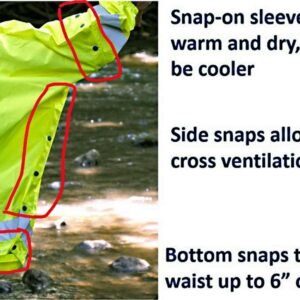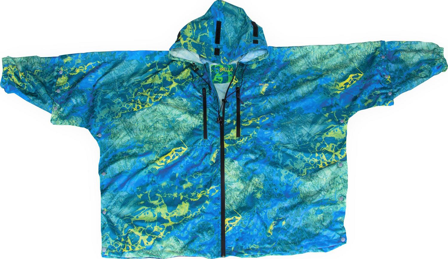 The Brella 2015 unisex, one size fits most Realtree WAV3 lifestyle rain jacket with snap-on sleeves will protect you from the rain … stay dry and look cool doing it. With 20,000mm waterproof performance and 15,000MVT breathability, you will be dry and the fabric breathes keeping you comfortable. The Brella is ideal for outdoor sports and has fully taped waterproof seams, cross venting system, just unsnap the side snaps and most of the heat inside comes out, Snap-on sleeves which allow the user to keep cooler by taking them off, or remain warmer with them on. The Brella can be worn as a windbreaker, is packable into the pocket for easy storage, is unisex and one size fits most. The patented retractable hood extends 1-4 for customized peripheral vision and safety, especially for women. drawcord adjuster with elastic rope closure, heavy-duty YKK waterproof front zipper with outer and inner storm flaps, 2 outside pockets with YKK waterproof zipper closures, packable in the pocket with 2 way YKK zipper and loop for hanging, back length 30 in., imported and machine washable in cold water with a mild detergent and hang dry is suggested. The Brella is ideal for hunting, fishing, camping, kayaking hiking, gardening or just looking cool in the rain.