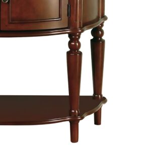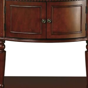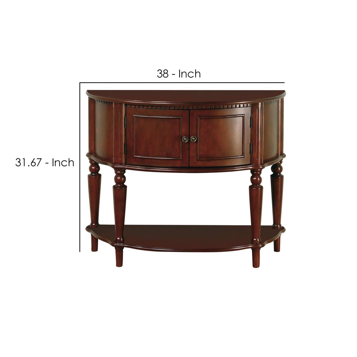 Brown Wooden Console Table With Curved Front & Inlay Shelf- Saltoro Sherpi This elaborate console table is a lovely piece to welcome all your guests. A rich brown finish emanates a warmth that is comforting and calming, while intricate woodwork details add visual appeal. Four legs are traditional turned and supported by a lower inlay shelf that offers the perfect space for home accents and decorations. Two upper center doors add decoration and storage space, while a curved fronts add shape and movement to the table. Fit for both a formal or casual room, this entry table is elegant and refined to adorn your home.