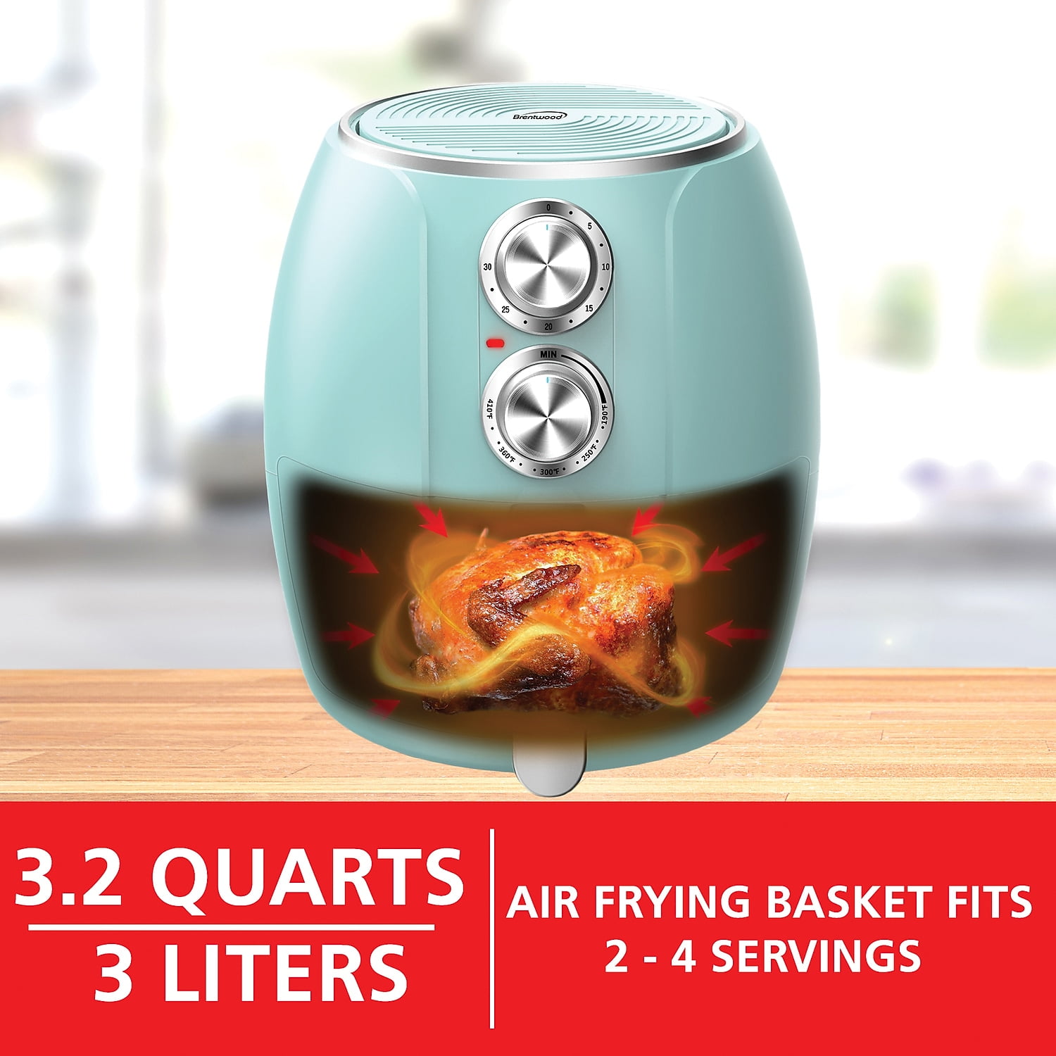 The powerful 1200 watt Brentwood 3.2 qyart electric air fryers frys quickly and evenly using little to no oil. Make crispy french fries, onion rings, chicken wings, roasted veggies, and more. Use the quick temp guide and 30 minute timer with auto shut off for fast, crispy results. Cool touch removable fry basket makes serving easy. Non stick surface makes this air fryer easy to clean.