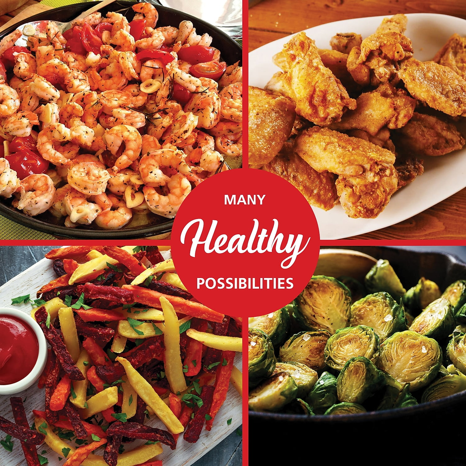 1,200 watt electric air fryer uses hot-air circulation to cook quickly and evenly using little-to-no oil 3.2 qt. capacity ideal for personal use 190°F to 410°F temperature range cooks all types of foods Nonstick surface allows fast cleanup with little to mess Set-it and forget-it 30-minute timer with auto-shutoff Serves freshly fried foods with cool-touch, removable fry basket 1-year warranty Blue Includes fry pan, fry basket, quick-reference temperature guide for common household foods, and instruction manual