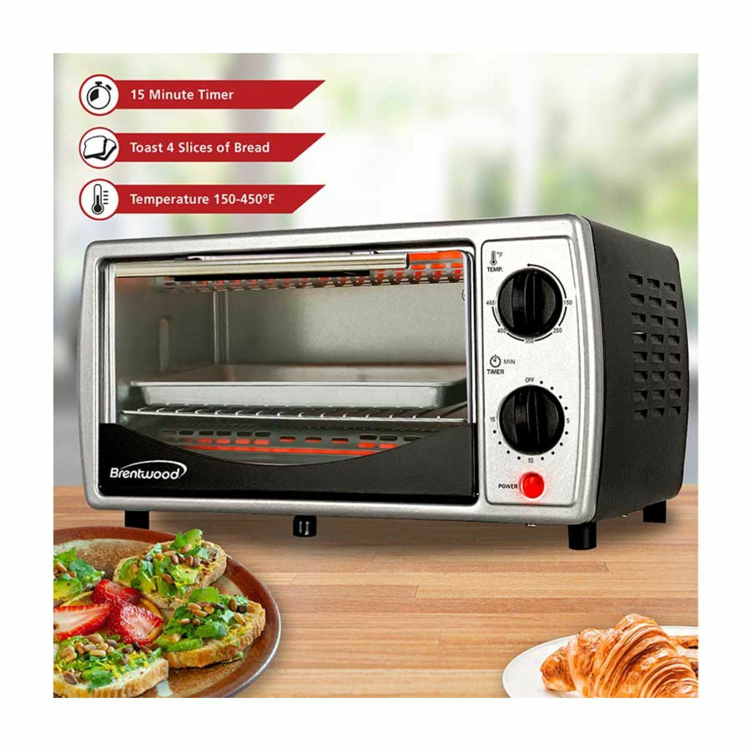The powerful 800 watts Brentwood TS-345B stainless steel 4 Slice toaster oven can toast, broil and bake an array of foods. Adjustable temperature ranges 50 to 450 degrees. Choose between the 15-minute timer with auto shut off and stay on functions. Two rack positions and two heating elements insure even toasting. Convenient crumb tray. Includes food tray and wire rack.