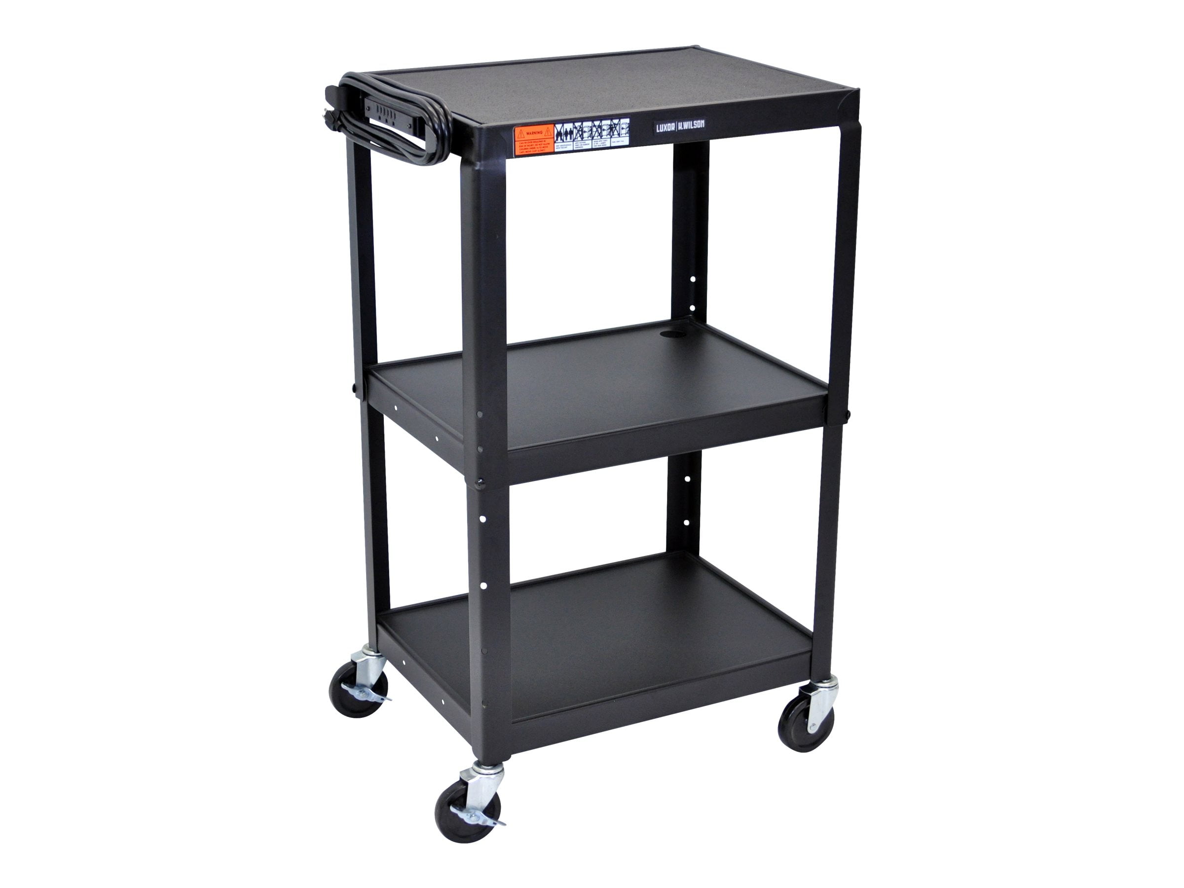 Key Features and Benefits: Multipurpose steel utility cart perfect for use with audio/video equipment and more Roll formed shelves with powder coat paint finish Tables are robotically-welded for stability, with easy-access cable holes to keep the cart clean, organized and safe Measures 24″W x 18″D x 42″H with adjustable height from 24″ to 42″ in 2″ increments .25″ retaining lip borders flat shelves Rolling cart with four 4″ silent roll, full swivel ball bearing casters, two with locking brake Three-outlet, 15′ UL and CSA listed electrical assembly with cord plug snap