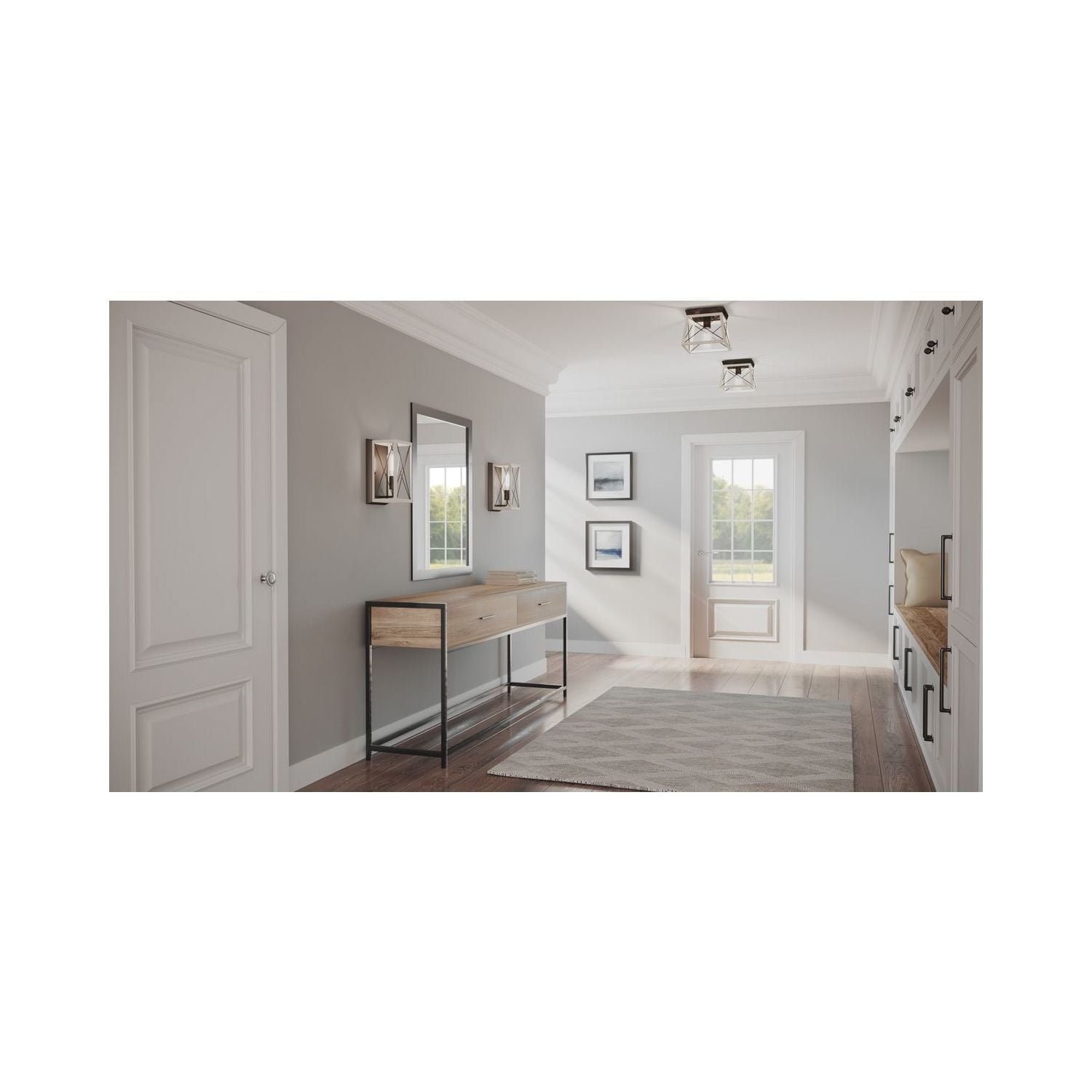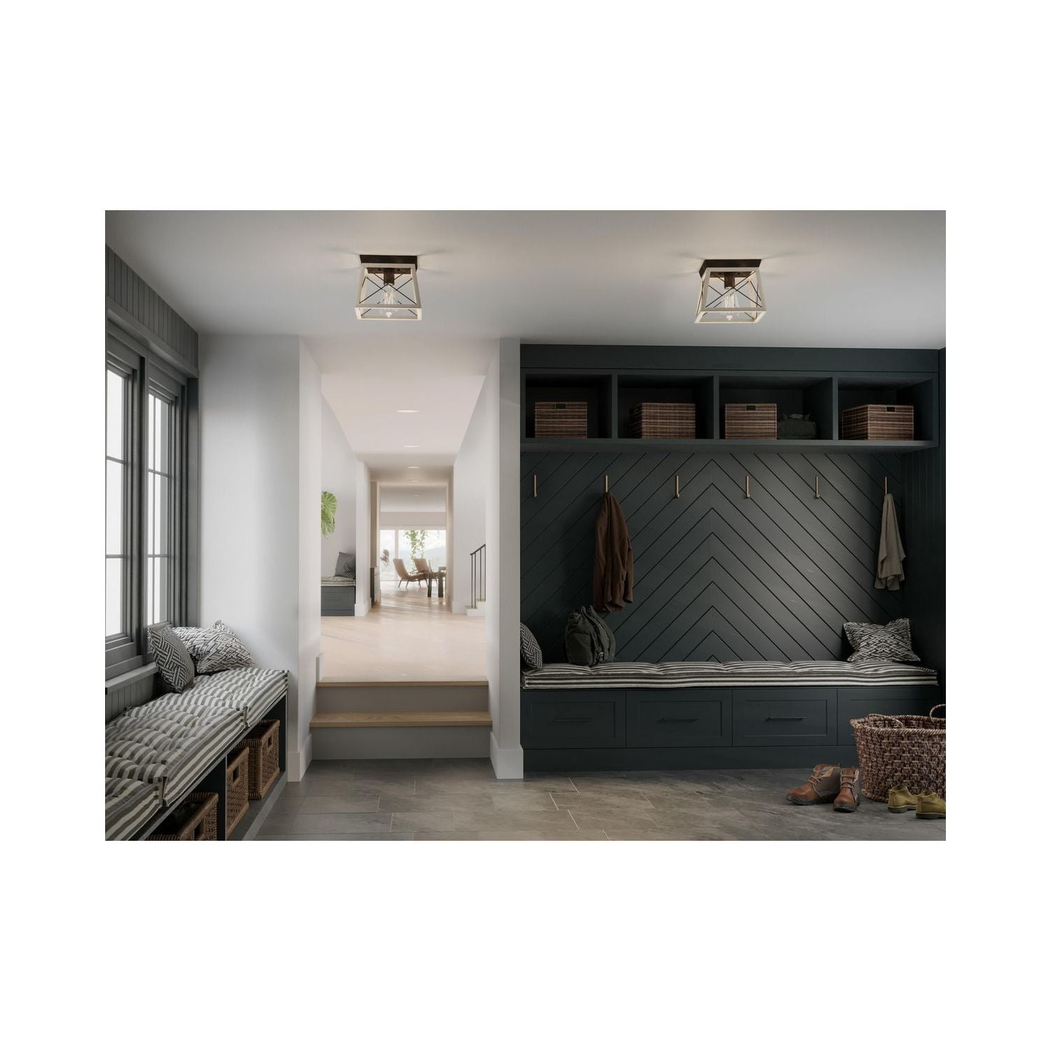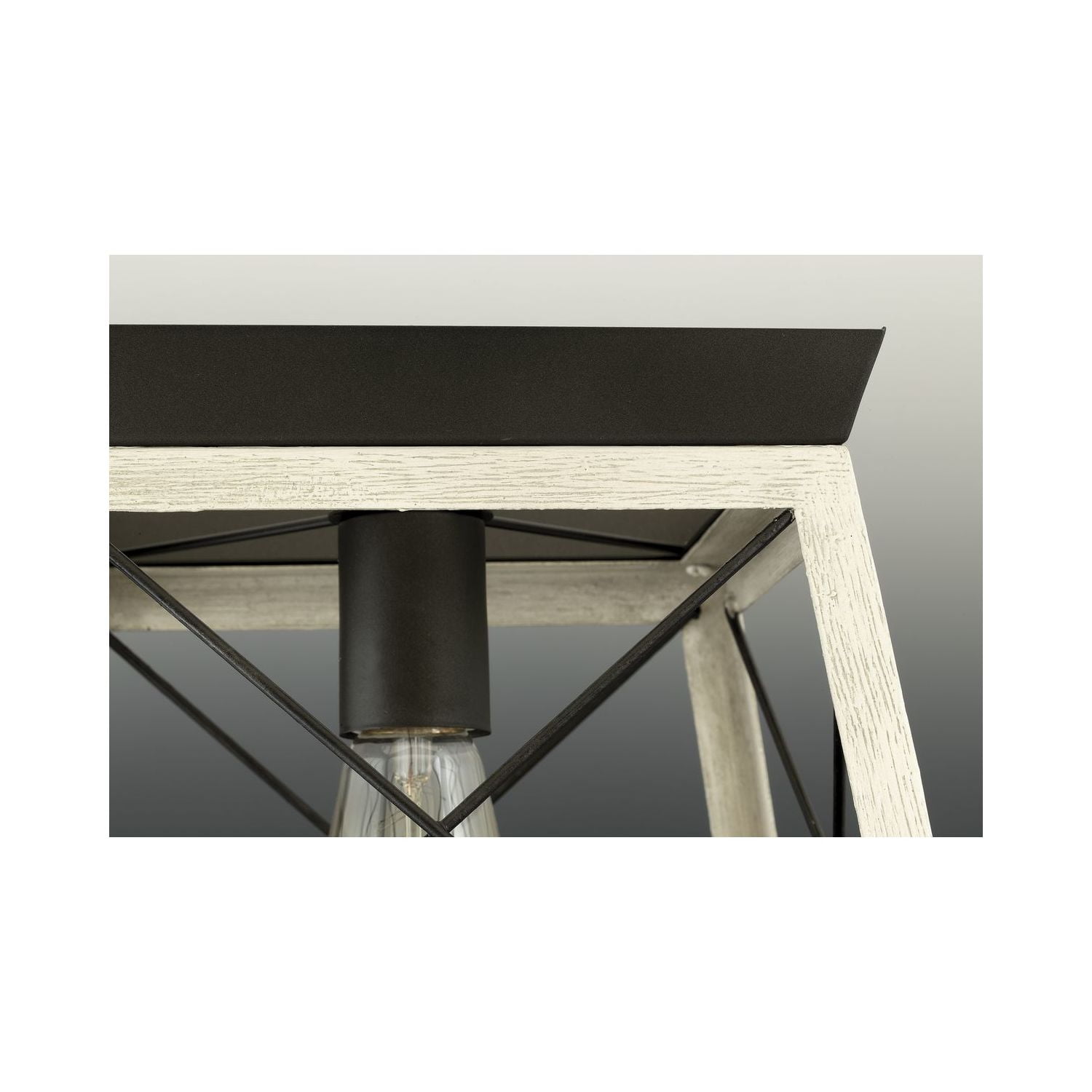 Create a rustic aesthetic with a flush mount light from the Briarwood Collection. A comforting country glow peeks through the classic X-brace design reminiscent of charming country barn doors and rustic farmhouse gates. A faux wood frame coated in a charming whitewashed finish is accented by a graphite plate. Ideal for vintage filament bulbs (not included). Compatible with dimmable bulbs. This one-light flush mount adds style and can light everything from your closet to hallway, from entryway to kitchen, and is perfect for low ceilings.