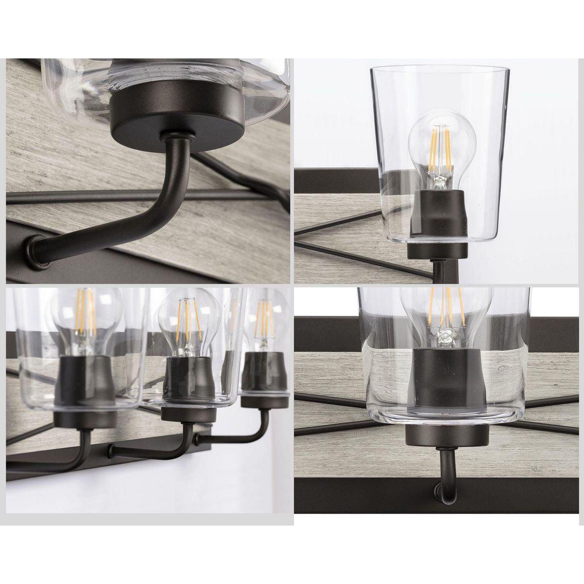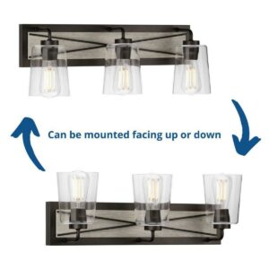 Enjoy a touch of country character with a bath light from the Briarwood Collection. Crisp clear glass shades provide beautiful illumination. A barn door-inspired X-brace design with a backdrop of faux wood is accented by a graphite backplate. Compatible with dimmable bulbs (not included). Features a steel construction and is damp location rated for long-lasting use. Includes mounting hardware for quick and simple installation. Create different looks by mounting the light fixture up or down.