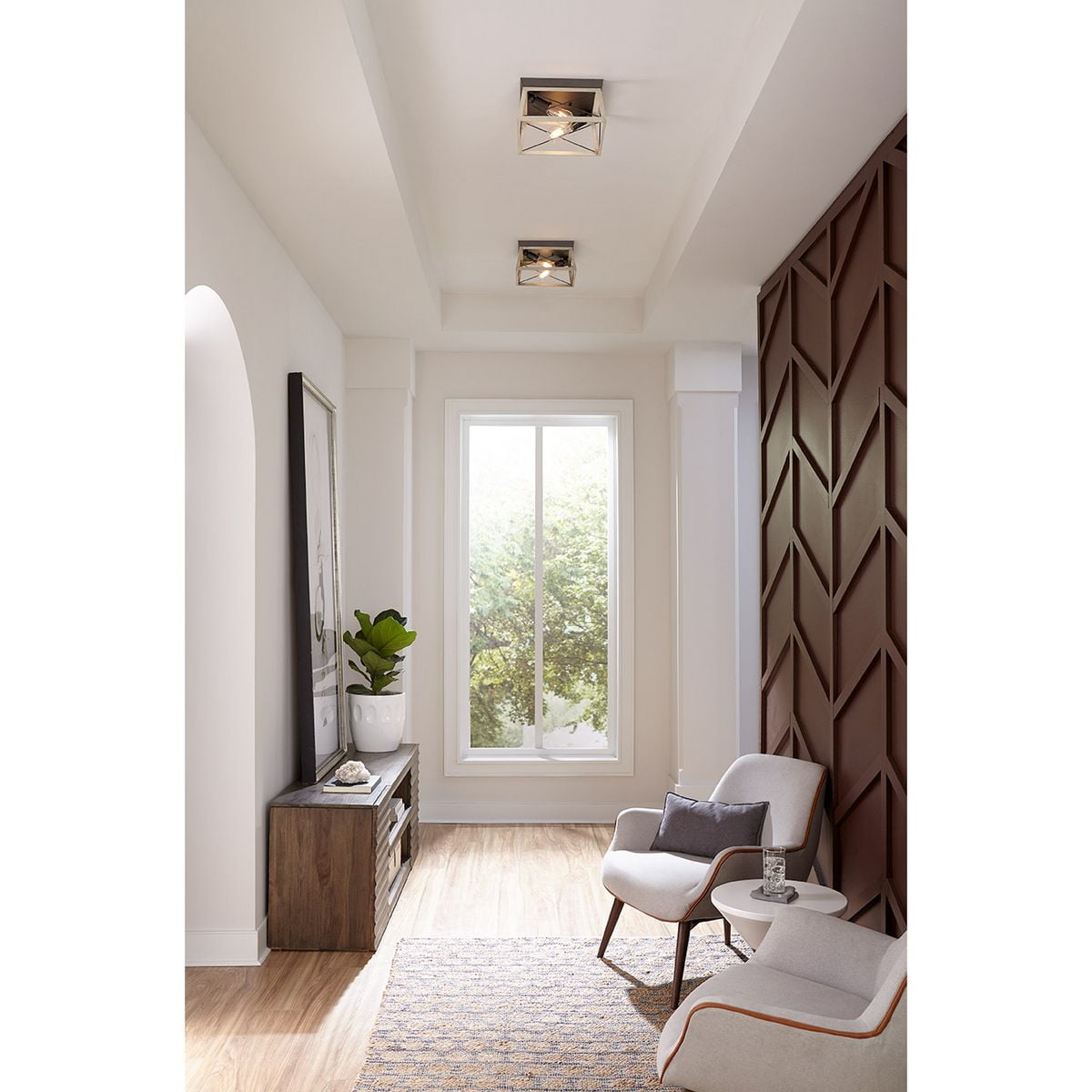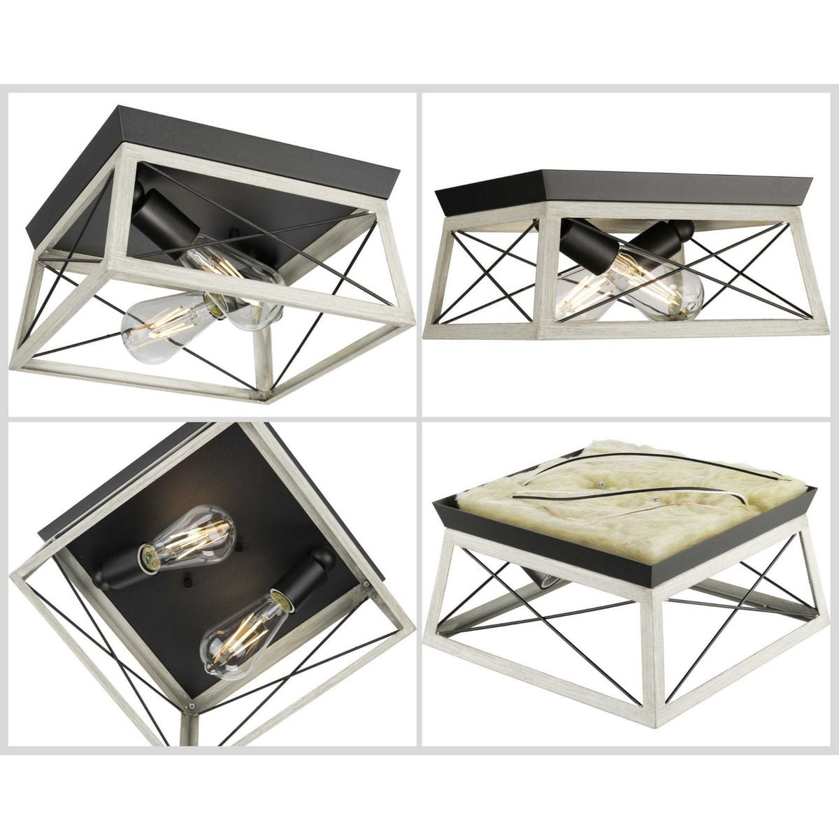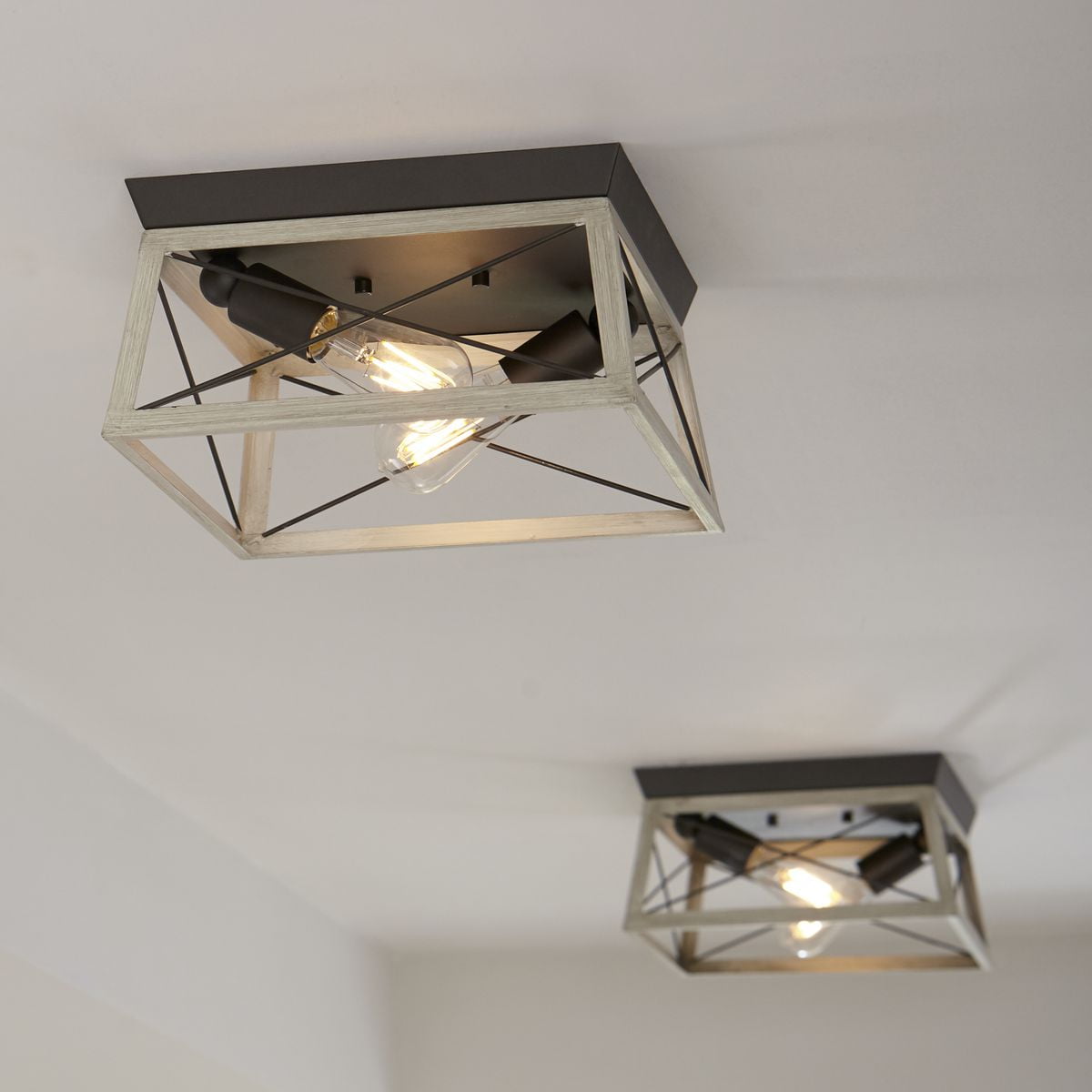 Create a rustic aesthetic with a flush mount light from the Briarwood Collection. A comforting country glow peeks through the classic X-brace design reminiscent of charming country barn doors and rustic farmhouse gates. A faux wood frame coated in a charming whitewashed finish is accented by a graphite ceiling plate. Ideal for vintage filament bulbs (not included). Compatible with dimmable bulbs. This two-light flush mount adds style and can light everything from your closet to hallway, from entryway to kitchen, and is perfect for low ceilings.