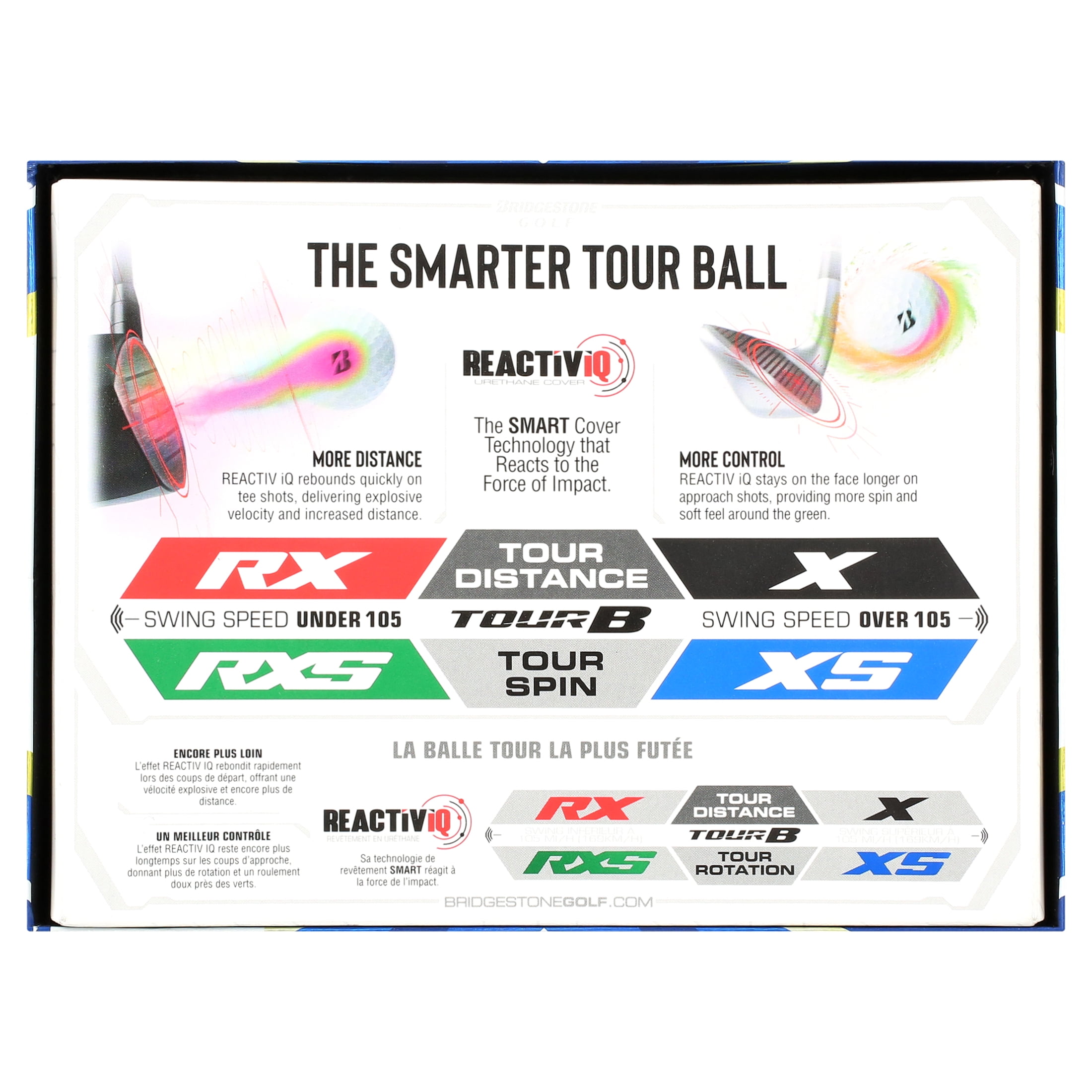 The Bridgestone Tour B golf balls feature the new REACTIV iQ SMART cover technology that reacts to the force of impact. REACTIV iQ rebounds quickly on tee shots, delivering explosive velocity and increased distance. REACTIV iQ stays on the face longer on approach shots, providing more spin and soft feel around the green. Tour B PGA professionals include; Tiger Woods, Matt Kuchar, Lexi Thompson, and Fred Couples.