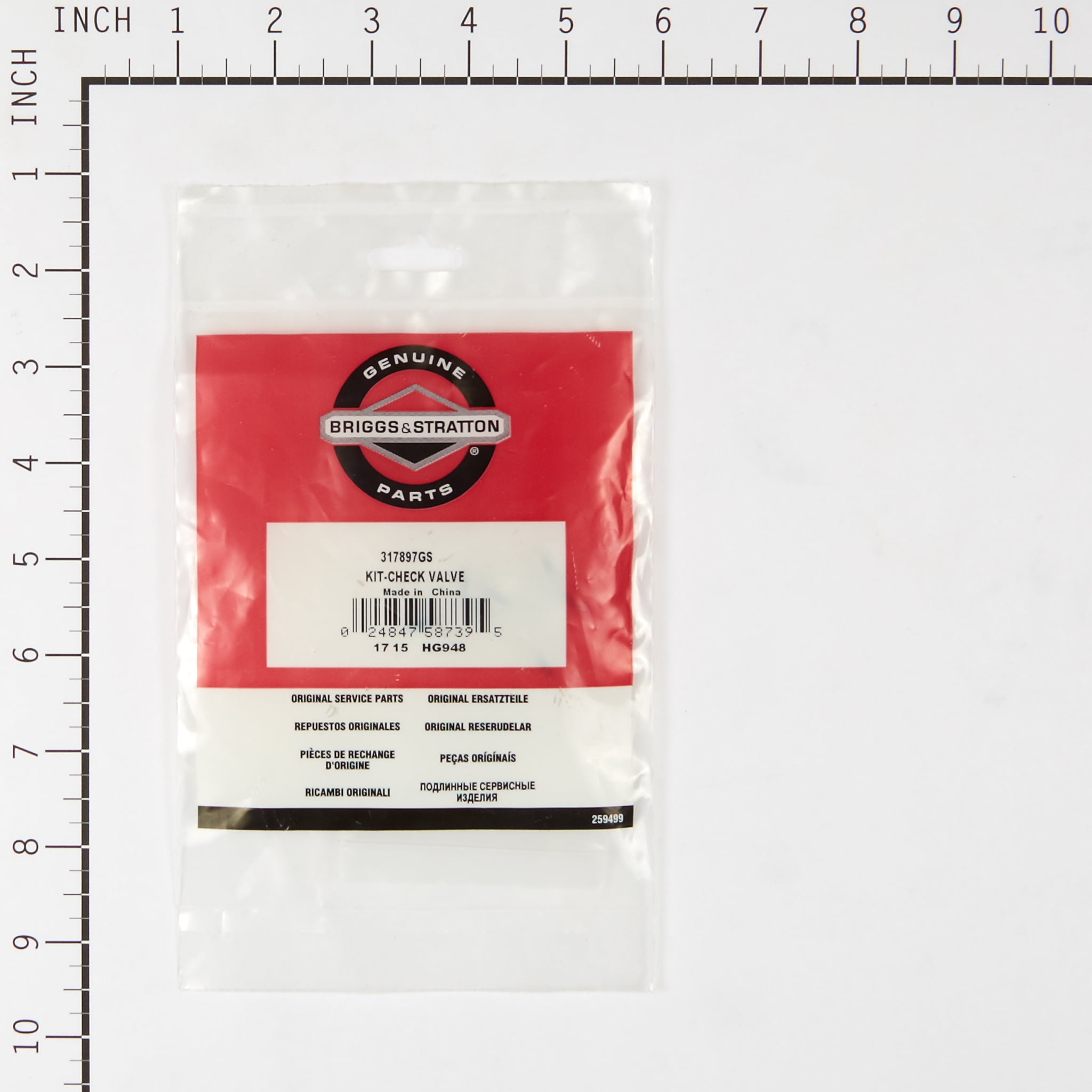 PRODUCT DETAILS Genuine, OEM Briggs & Stratton kit-check valve, part# 317897GS Genuine, OEM Briggs & Stratton parts Measures approximately 0.38 X 5.00 X 8.50 inches INCLUDES (1) Kit-Check Valve
