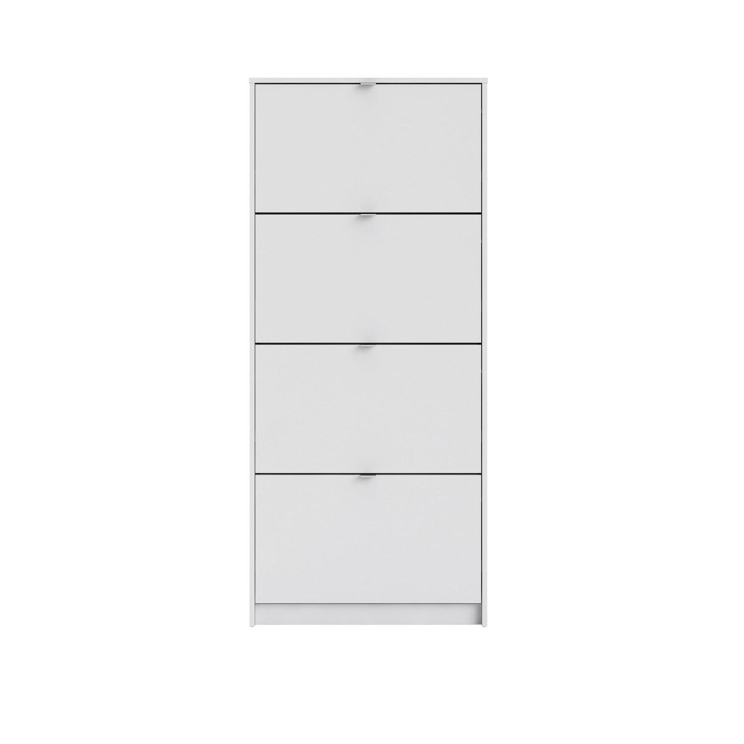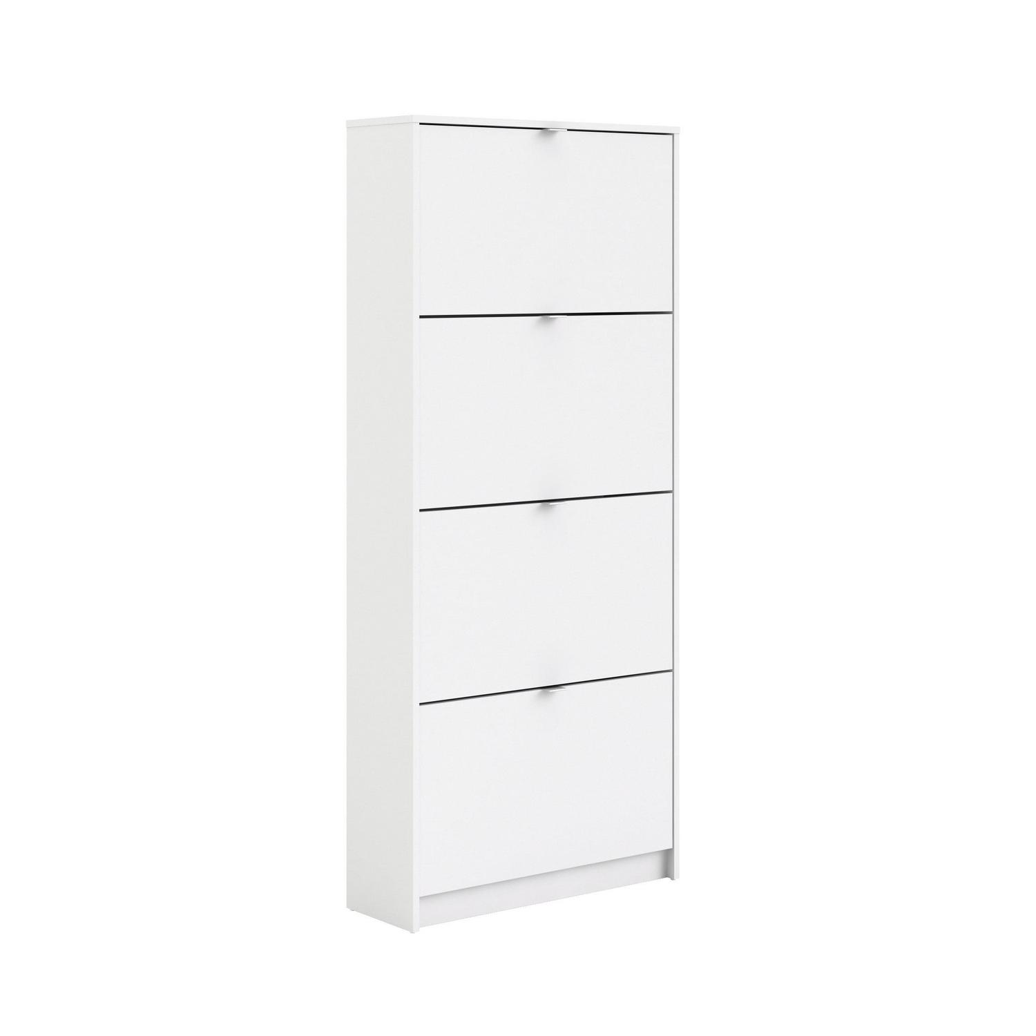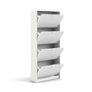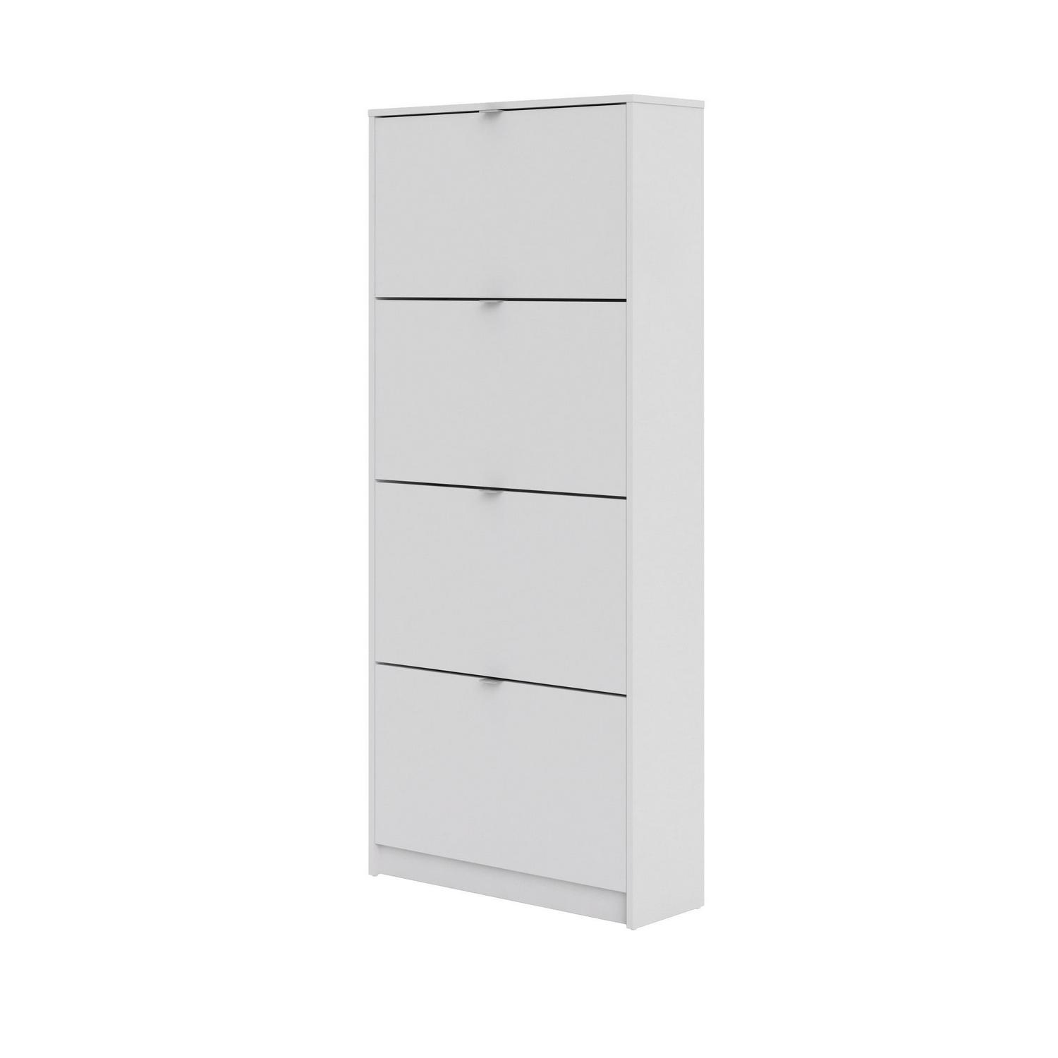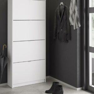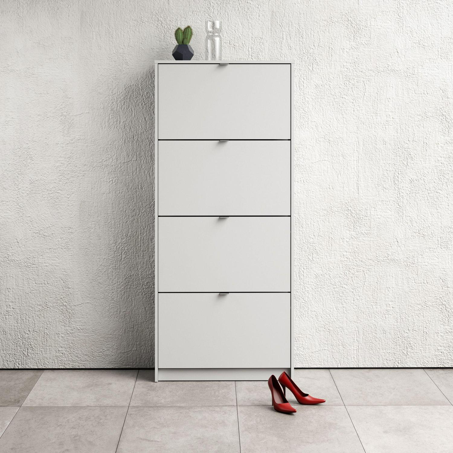 Organize all your footwear in one place and create a clutter-free space with the Bright 4 Drawer Shoe Cabinet. This Shoe Cabinet is great for an entryway. Cabinet has two rows of shoes in each compartment. The Shoe Cabinet will accommodate about 24 pairs of your footwear. The tilting drawers ensures quick and easy access to your shoes. Shoe Cabinet provides a foil surface and that is easy to wipe with a damp cloth. This Scandinavian design provides a durable and functional storage piece that looks anything but utilitarian.