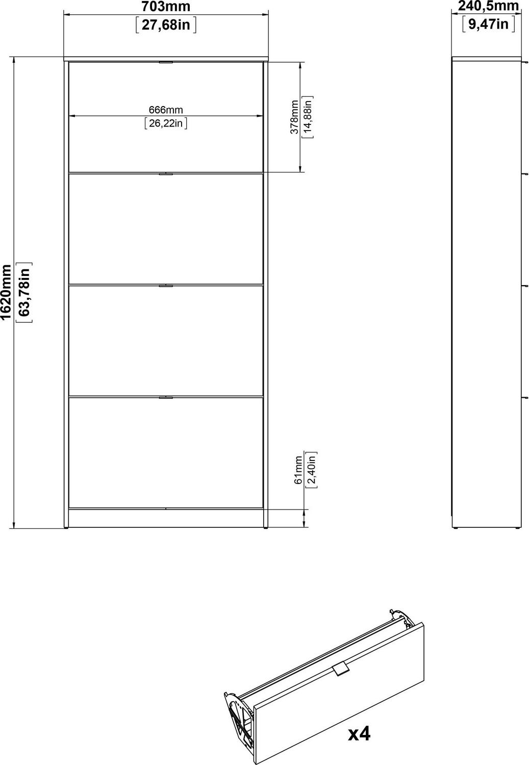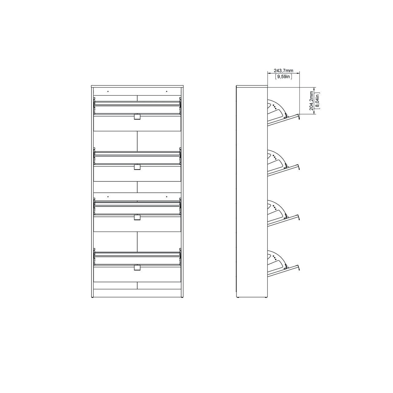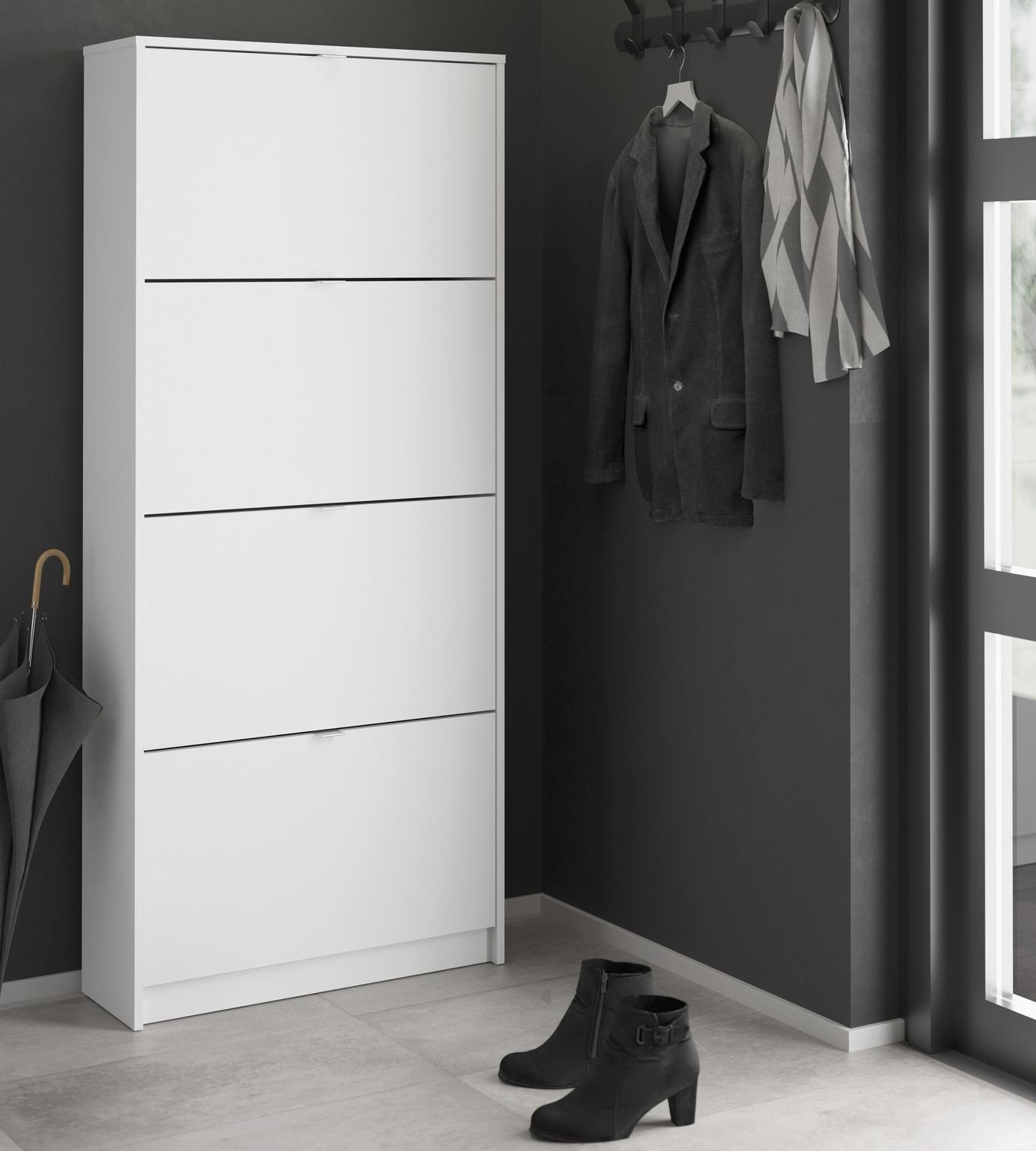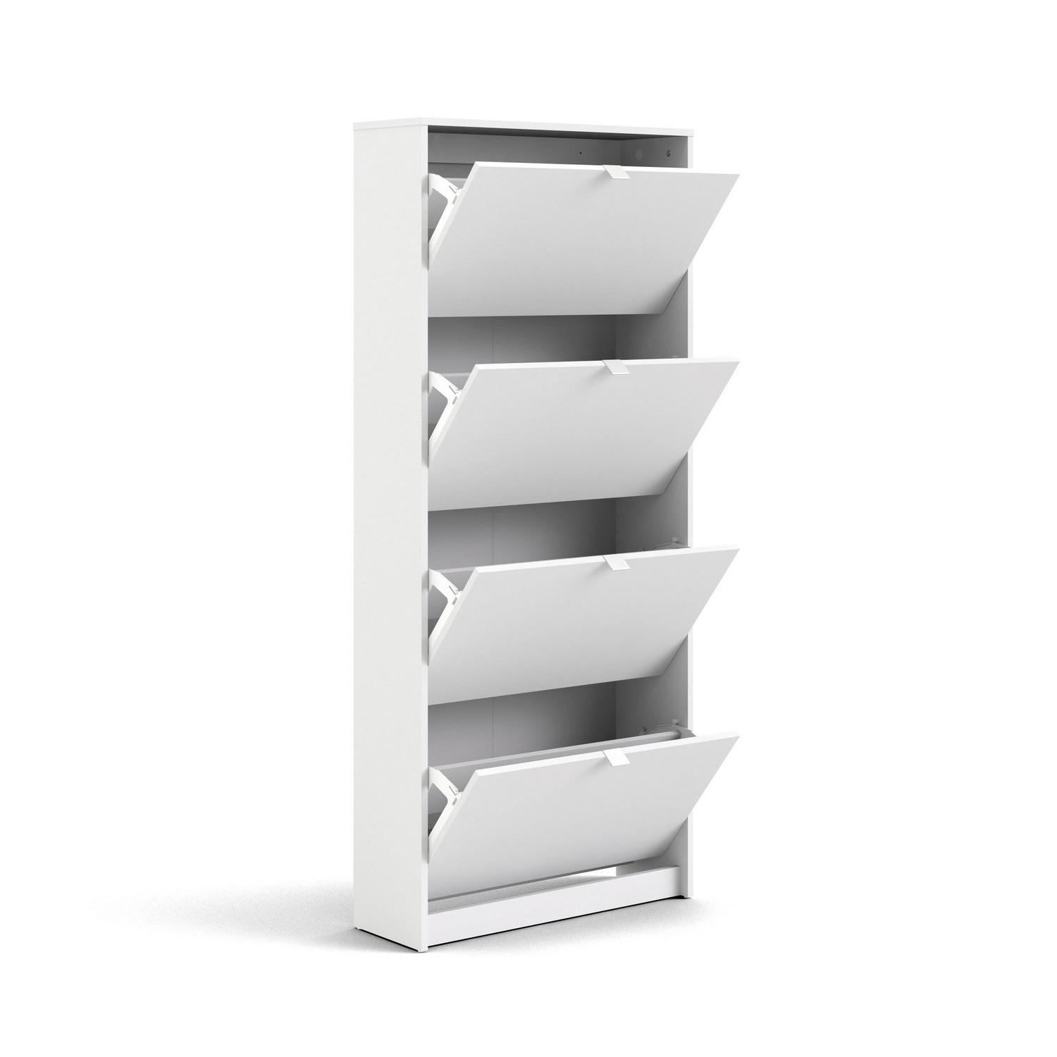 Organize all your footwear in one place and create a clutter-free space with the Bright 4 Drawer Shoe Cabinet. This Shoe Cabinet is great for an entryway. Cabinet has two rows of shoes in each compartment. The Shoe Cabinet will accommodate about 24 pairs of your footwear. The tilting drawers ensures quick and easy access to your shoes. Shoe Cabinet provides a foil surface and that is easy to wipe with a damp cloth. This Scandinavian design provides a durable and functional storage piece that looks anything but utilitarian.