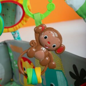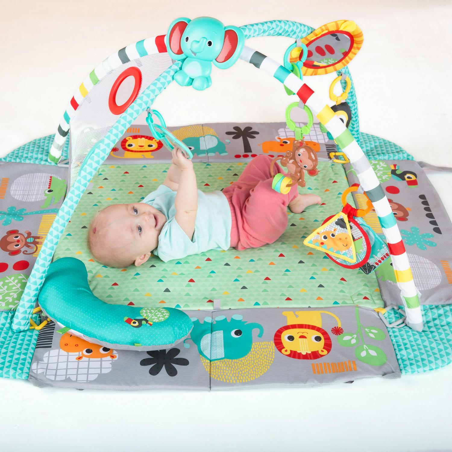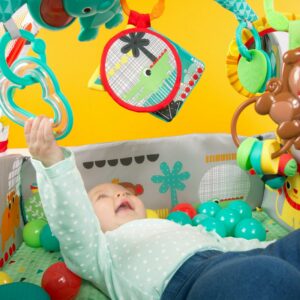 Remember how much FUN you had playing in a ball pit as a kid The tossing! The swimming! Now you can bring the joy of a ball pit right to your living room (without offending your inner germaphobe you know you ve thought about it). Unlike your standard playmat, this baby mat can be adjusted up or down to create walls. Keep baby right where you want him with these plush barriers, or you guessed it fill the play gym with bouncy, bobbling, bubbly balls! For younger babies, the jumbo mat lays flat for tummy time. Playtime is all around with engaging toys, crinkle fabrics, rattles, tunes and more. Who s ready to have a ball with Bright Starts