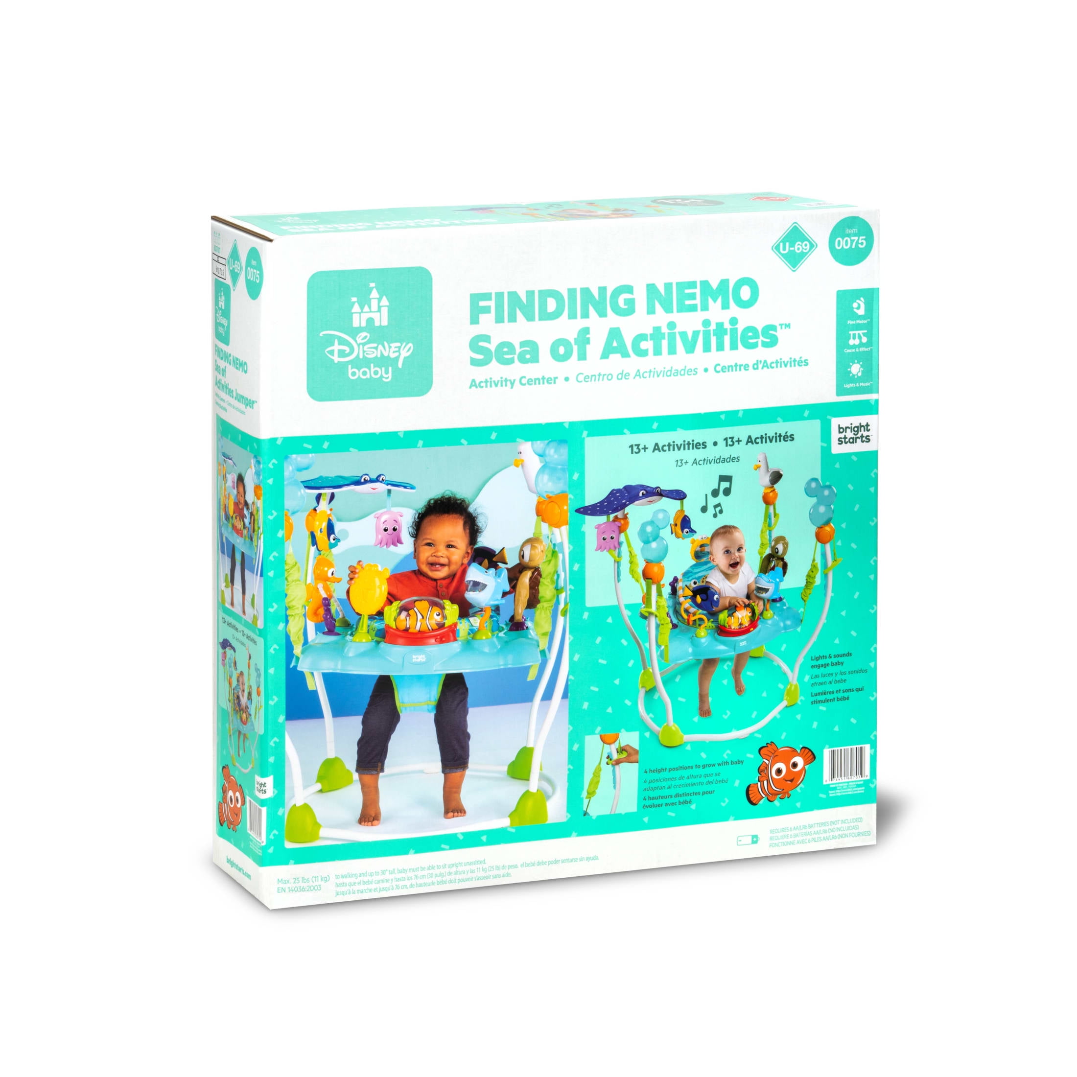 Bright Starts Disney Baby Adjustable Baby Activity Center Jumper, Just keep jumping with the Finding Nemo Sea of Activities Jumper. This unisex magical entertainer from Disney Baby will take your baby on an underwater adventure all the way to P. Sherman 42 Wallaby Way Sydney. Surrounded by a sea of Nemo-themed toys, you’ll watch waves of wonder upon her face as she interacts with the 13+ activities created by Bright Starts. She’ll clown around with her favorite clown fish, sea herself in a baby-safe mirror, and play with all her Nemo favorites, like Dory, Bruce, Mr. Ray, and more. Infant baby can steer her ship any way she wants in her 360-degree rotating chair, made with a high-backed seat for extra comfort.