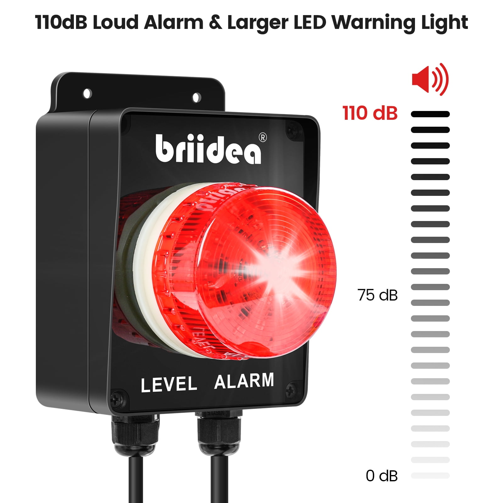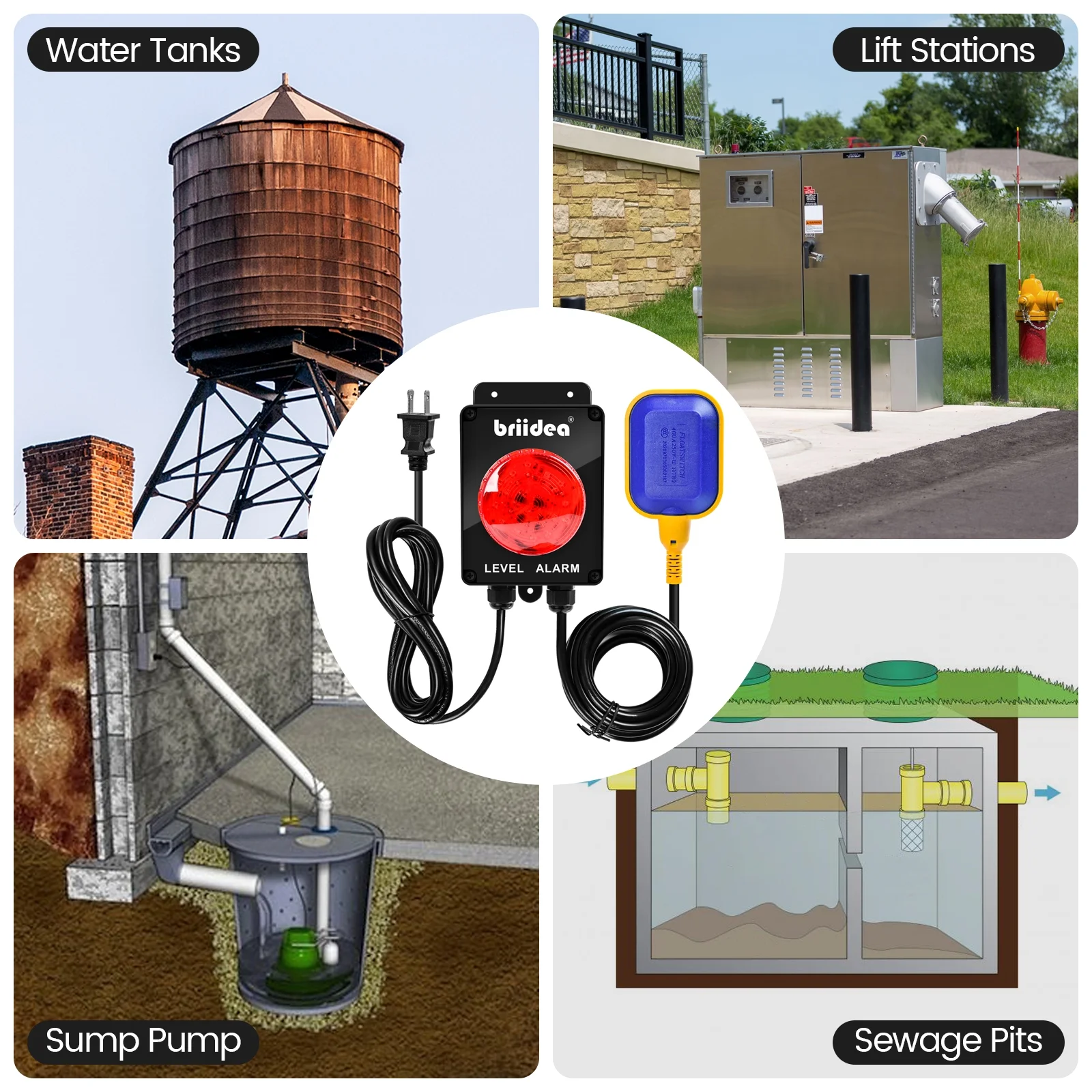 HIGH WATER SEPTIC ALARM: Basement flooding can cost you a lot of time, effort and money. Use Briidea septic tank alarm, through the float switch to detect the water level of your septic, and timely alarm when the water level is too high, protect your house and property from flooding, give you peace of mind then 110 DECIBEL ALARM: With volume alarm and large LED warning light, double protection. The alarm sounds up to 110 dB, you can hear it clearly no matter where you are, thus protecting your basement and home from water damage WEATHERPROOF ENCLOSURE: Are you looking for a high water sump alarm flood alarm that works both outdoors and indoors? The encloser of our alarm is made of weatherproof components, IP67-rated weatherproof, is not affected by any extreme weather, very suitable for indoor/outdoor use, is your ideal choice ADJUSTABLE DETECT RANGE: The high water alarm system equipped with a 10 ft float level switch and a 6 ft power cord, you can adjust the detect range as needed to minimize damage to your property WIDELY USED: Very suitable for monitoring the water level for sump pumps, water tanks, lift stations, low density oils and sewage water