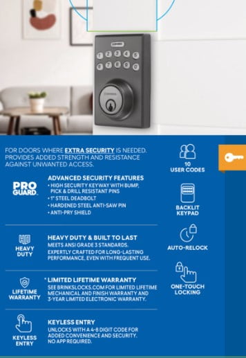 The Brinks keyless entry motorized deadbolt provides strong and convenient security for your home. It’s designed for exterior doors where keyless entry is needed. Its powerful motorized deadbolt allows for one touch locking to secure your home as you leave. The deadbolt also features ‘customizable auto locking’ for the ultimate peace of mind. Use 10 customizable user codes for family members and temporary codes that can be used just once for visitors or service personnel. The low battery indicator keeps you informed about the battery status. For extra security the lock will sound an alarm after 5 incorrect consecutive code entries and the keypad will be deactivated for 45 seconds for additional security. The deadbolt operates by 10 button keypad or key outside and thumb turn inside. The deadbolt is made to fit all standard doors 1-3/8 in. to 1-3/4 thick and the 4-way latch is adjustable for 2-3/8″ or 2-3/4″ backsets. The installation is easy and only requires a screwdriver.