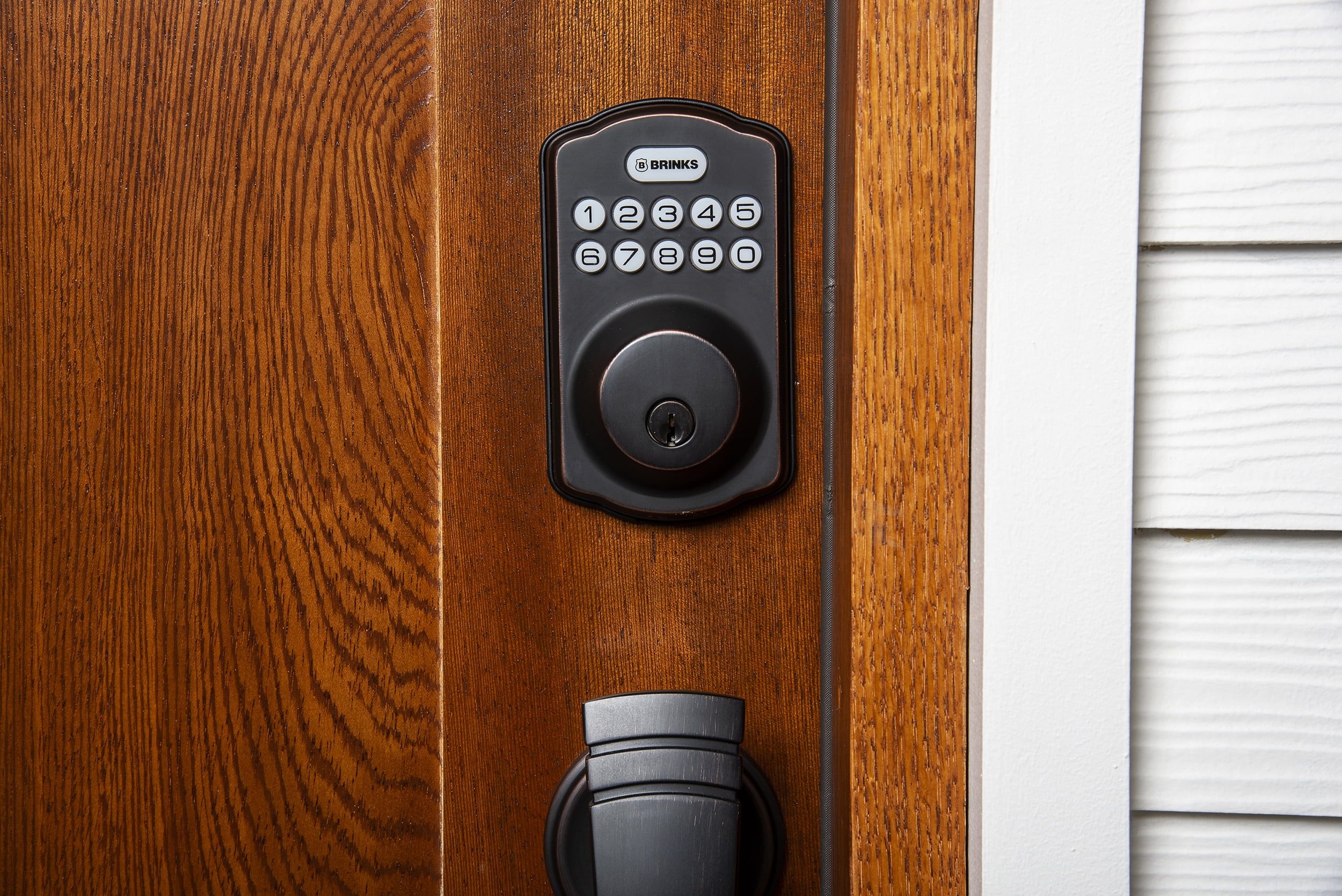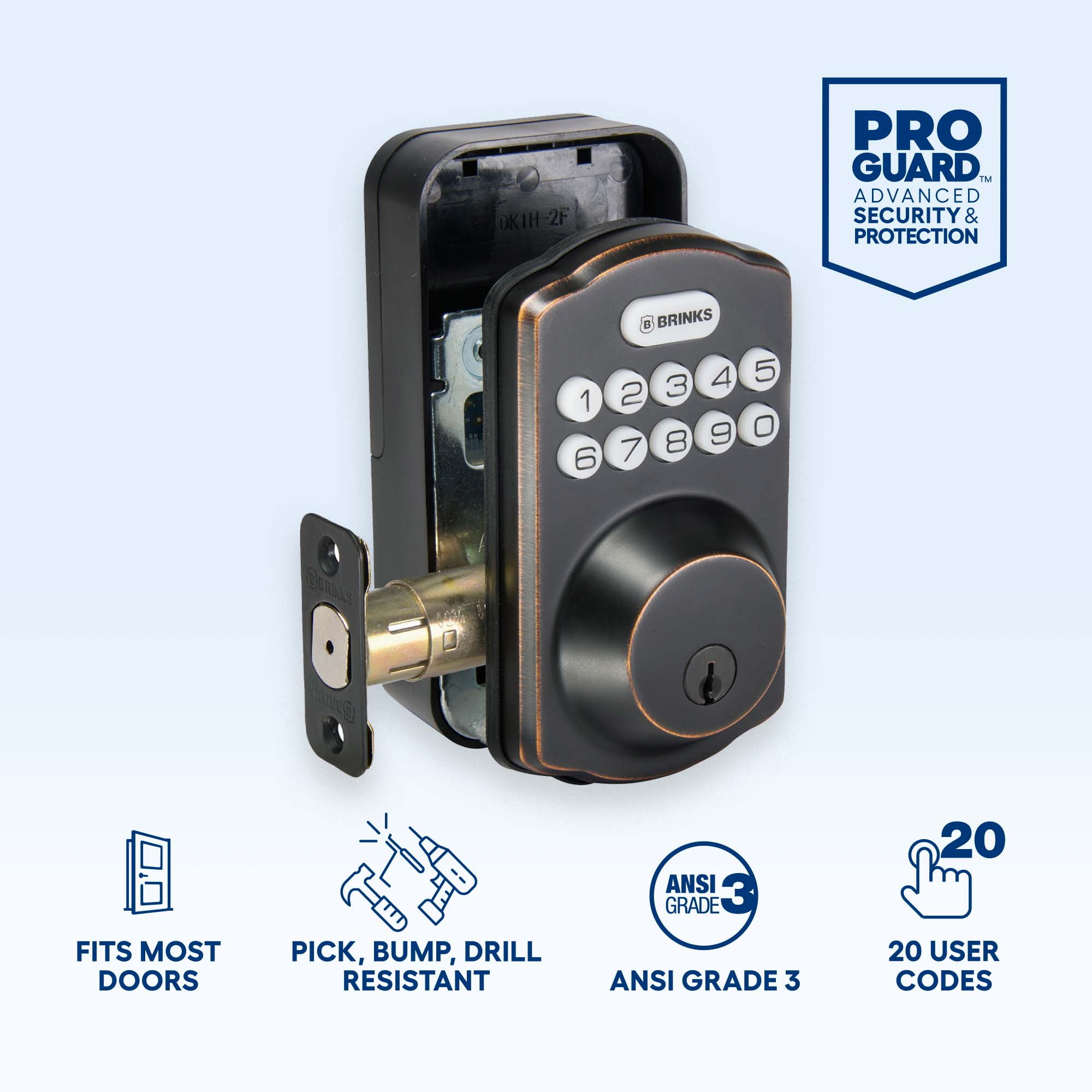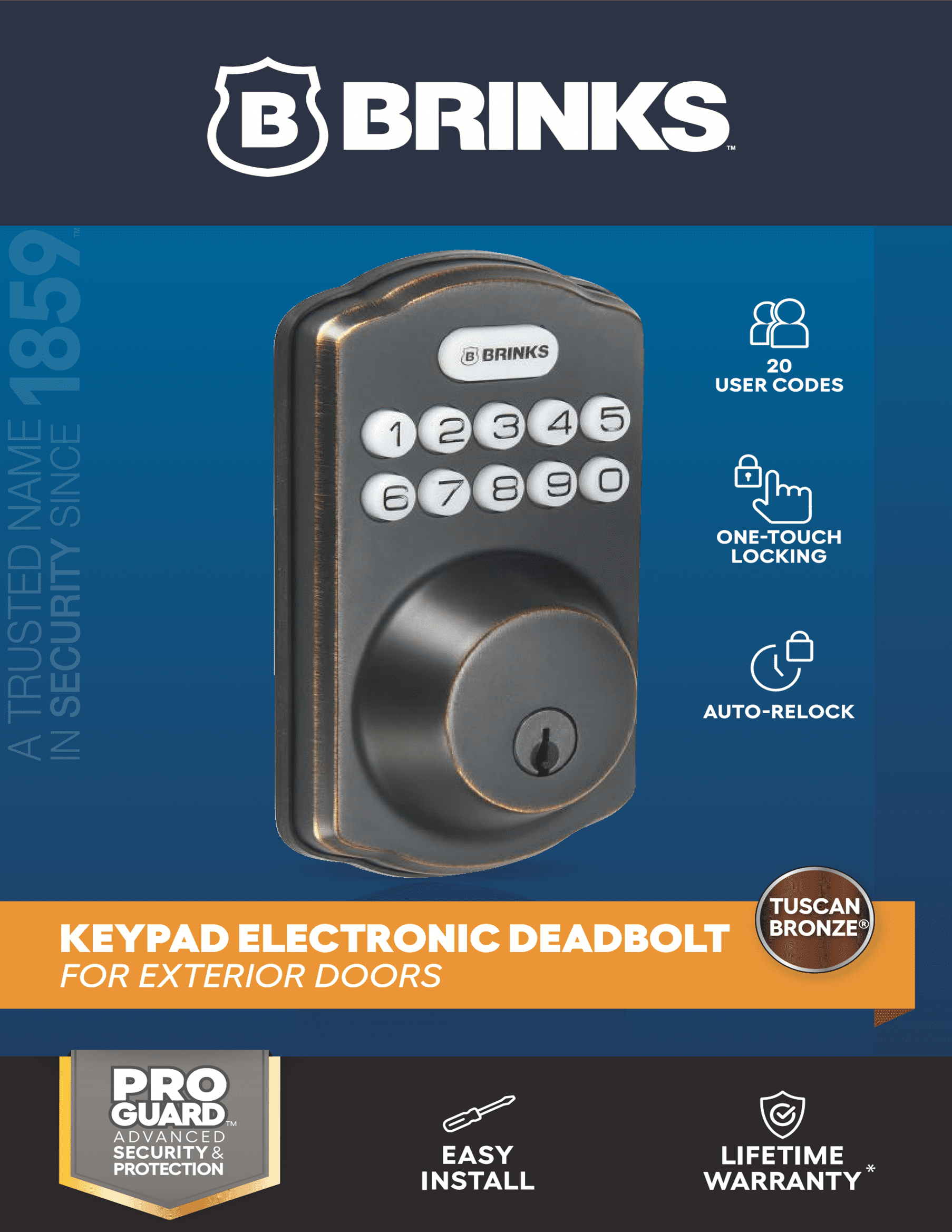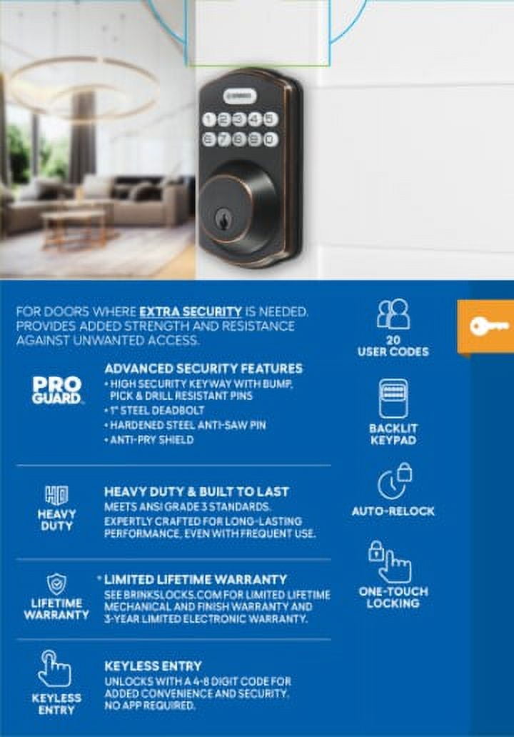 Combines traditional key access with the convenience of keyless entry technology. Brinks Electronic Deadbolt Lock features optimal auto-locking that relocks the door after opening an illuminated keypad for increased visibility. It accommodates 20 user codes for friends and family. Installation is quick and easy, requiring only a regular Philips screwdriver. For those that prefer the traditional keyed entry, a key is included for emergency manual override. The Deadbolt is reversible and can be installed on right or left-handed doors. The Deadbolt is perfect for additional security to your exterior knob or lever and is ideal for the front, back, and side doors. The unit weighs 2.55 lbs. and is made out of steel.