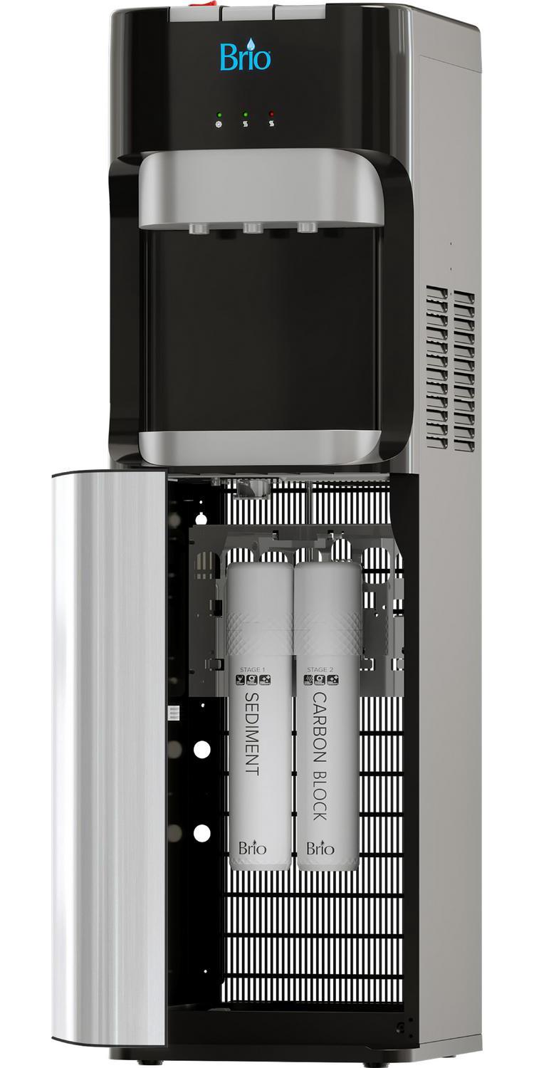 The Brio 400 series advanced 2-stage bottless water cooler dispenser brings quality hydration into any modern lifestyle. The 40-inch tall cooler is slender enough to fit perfectly in any home or office space while adding to your unique interior aesthetics. The bottless technology allows for free, unlimited water supply right in your own home with a user-friendly installation process. The revolutionary filters are designed to remove a vast array of harmful contaminants most commonly found in tap water, such as dirt, dust, chlorine, and more. Dispense filtered cold as low as 39 degrees, hot up to 194 degrees, and room temperature water to make the perfect beverage for any occasion. Experience a water cooler that brings safety, health, and convenience to your fingertips.