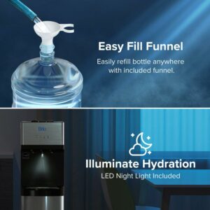 No lines. No plumbing. No hassle. The Brio 520 series self-cleaning bottom loading 2 stage filtration capacity no-line tri-temperature water up to 176-198 degrees hot and cold water ranging from 37-59 degrees fahrenheit water cooler dispenser offers all the convenience of a filtered cooler without the need for a plumbing hook-up. The bottom-load design accommodates long-lasting 5-gallon jugs, and when refill time comes, just slide the replenished bottle into the cabinet. You and your family can enjoy filtered hot, cold, or room temperature water with the dual-filtration process delivering consistently pure water by removing sediments, chlorine taste, and harmful contaminants before they reach glasses and water bottles. The hot water button has a child safety switch that prevents accidental dispensing. Bright LED icons indicate when your water is at the right temperature, and when filters need to be replaced and your bottle needs to be refilled. The cleaning process is a breeze with the press of a button, the self-cleaning ozone feature thoroughly sanitizes the entire dispenser. A twenty-first-century essential, the Brio 520 water dispenser comes in a sleek and durable black stainless steel design that will complement any home s interior.