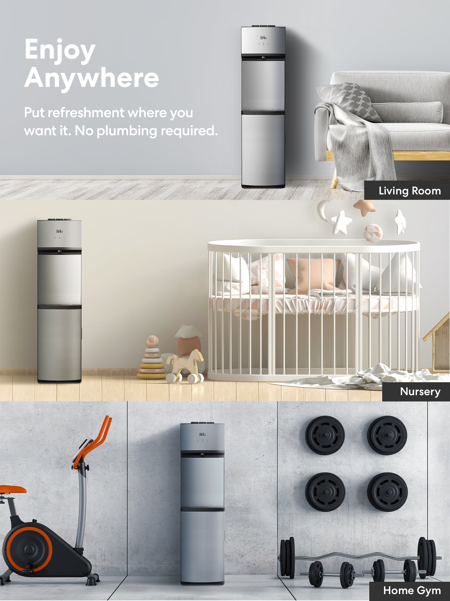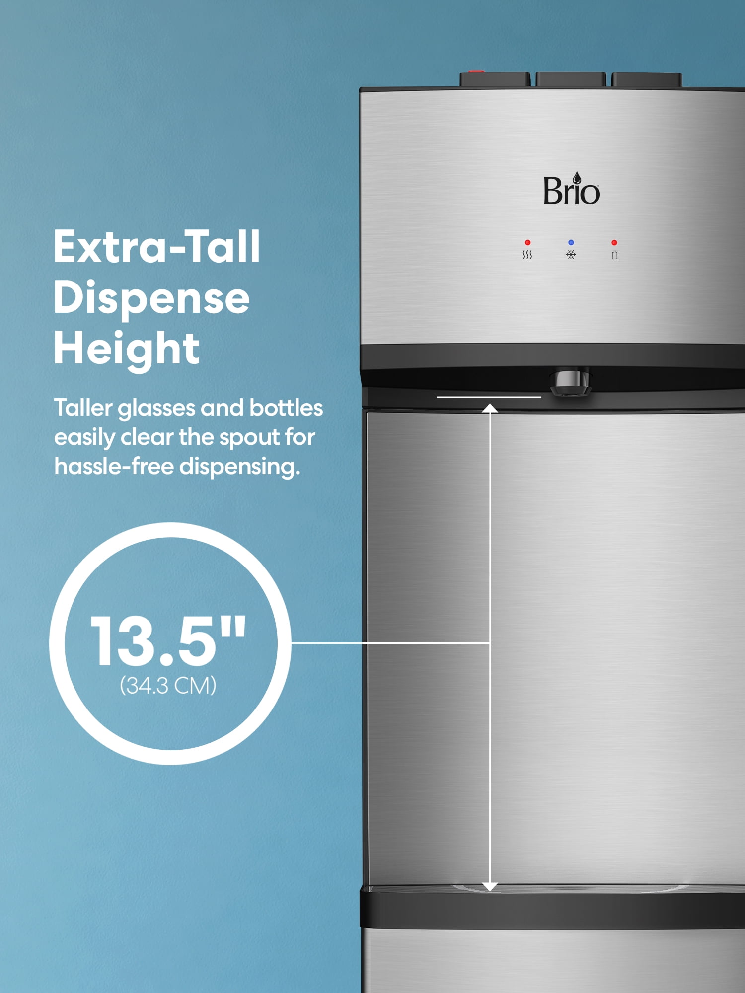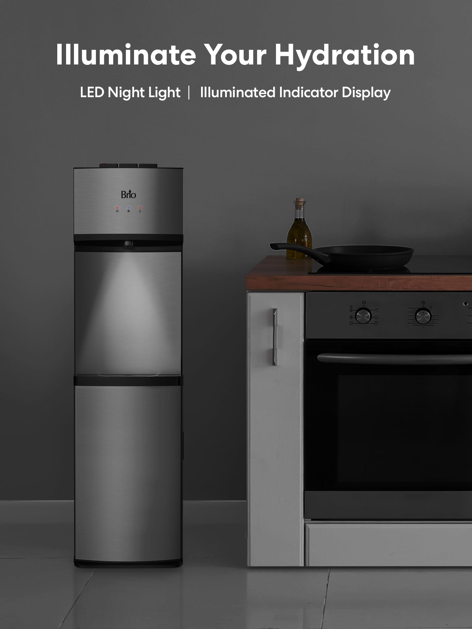 MODERN, DURABLE & EASY-TO-USE: With a slim 11.81″W x 43″H, Total Weight 45 lbs. stainless steel profile, this water dispenser for 5-gallon bottles has a sleek, premium look, fits in anywhere, and holds up to busy environments. Plug-and-play installation takes just a few minutes with no tools, plumbing hookup, or landlord approval required, making this bottom-loading water dispenser ideal for renters and anyone who wants easy access to hydration in non-plumbed spaces like home offices, RVs, and waiting rooms EASY BOTTOM LOADING: Stop struggling with heavy water bottles. Just hook up the 5-gallon bottle of your choice and slide it in. Water dispenser door conceals bottle so water cooler always looks appealingly modern. Ditch the endless cases of water and switch to an affordable hydration solution that not only saves you money but helps keep single-use plastics out of landfills. Compatible with 5-gallon bottles (bottle not included) TRI-TEMP & TALL DISPENSE HEIGHT: Amazing 13.5″ dispense height means no awkward maneuvering to fill tall bottles and glasses. Enjoy hot, room and adjustable cold water selection. Fast flow rate of 1.5 L/min for hot and 2.7 L/min for cold. Food-grade 304 stainless steel reservoirs keep water tasting great. Removable drip tray catches stray drips, keeping dispense area tidy. Includes child safety lock LED NOTIFICATION LIGHTS: Bright indicator lights notify you when water is heating and cooling, so you know exactly when to dispense, as well as an empty bottle indicator light that warns you when your water supply is running low, so you’re never without refreshment. Night light softly illuminates dispense area, ensuring refills are spot-on even in the middle of the night
