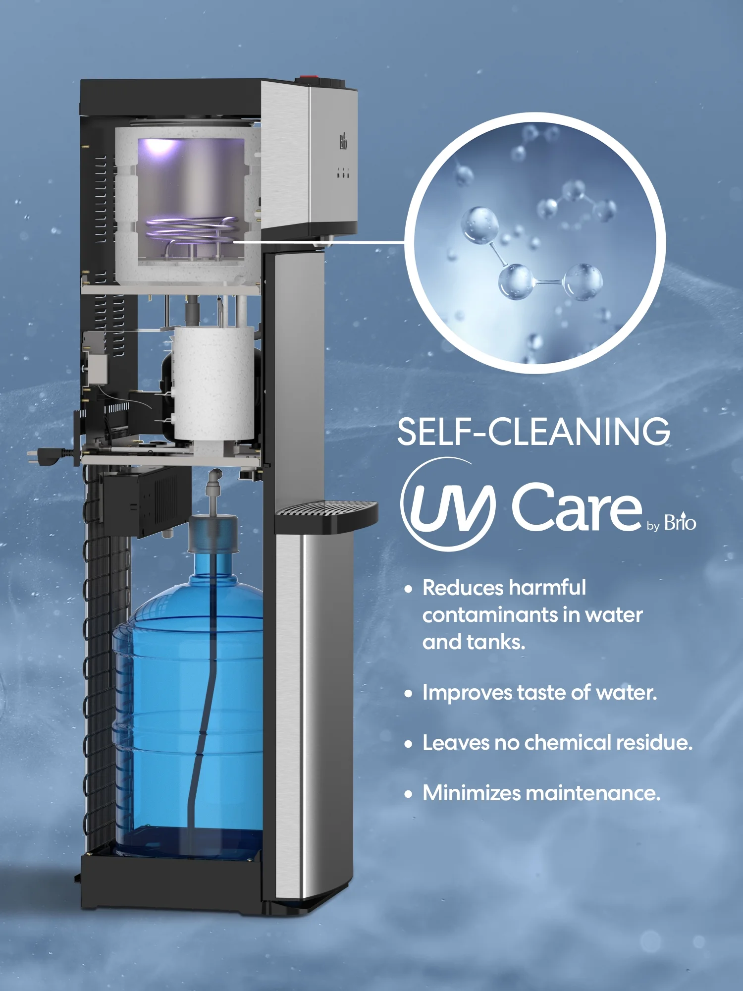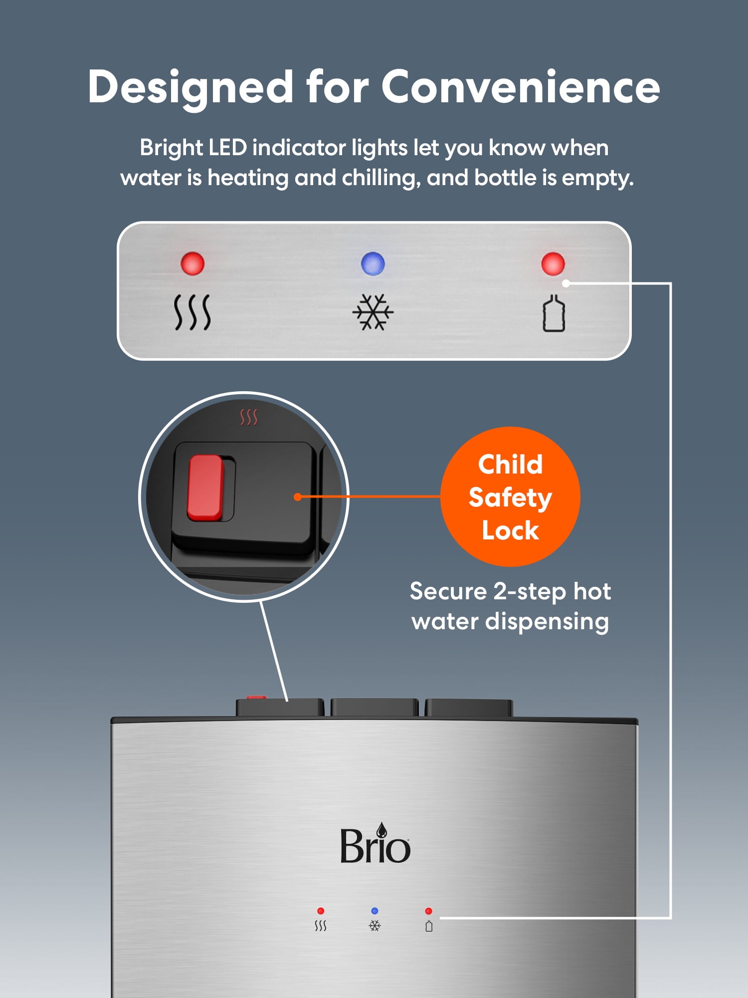 Introducing the newest and most advanced CLBL530 water cooler to date. The Brio 500 Series Bottom Load Water Cooler combines elegance, technology, and durability. Designed to provide a premium hydration experience in the home or office, it features an easy and effortless bottom load design, stunning stainless steel construction, LED night light, and the convenience of tri-temperature dispensing. Product assembled dimensions height 43″, width 12.2 ” and depth 15.6″.