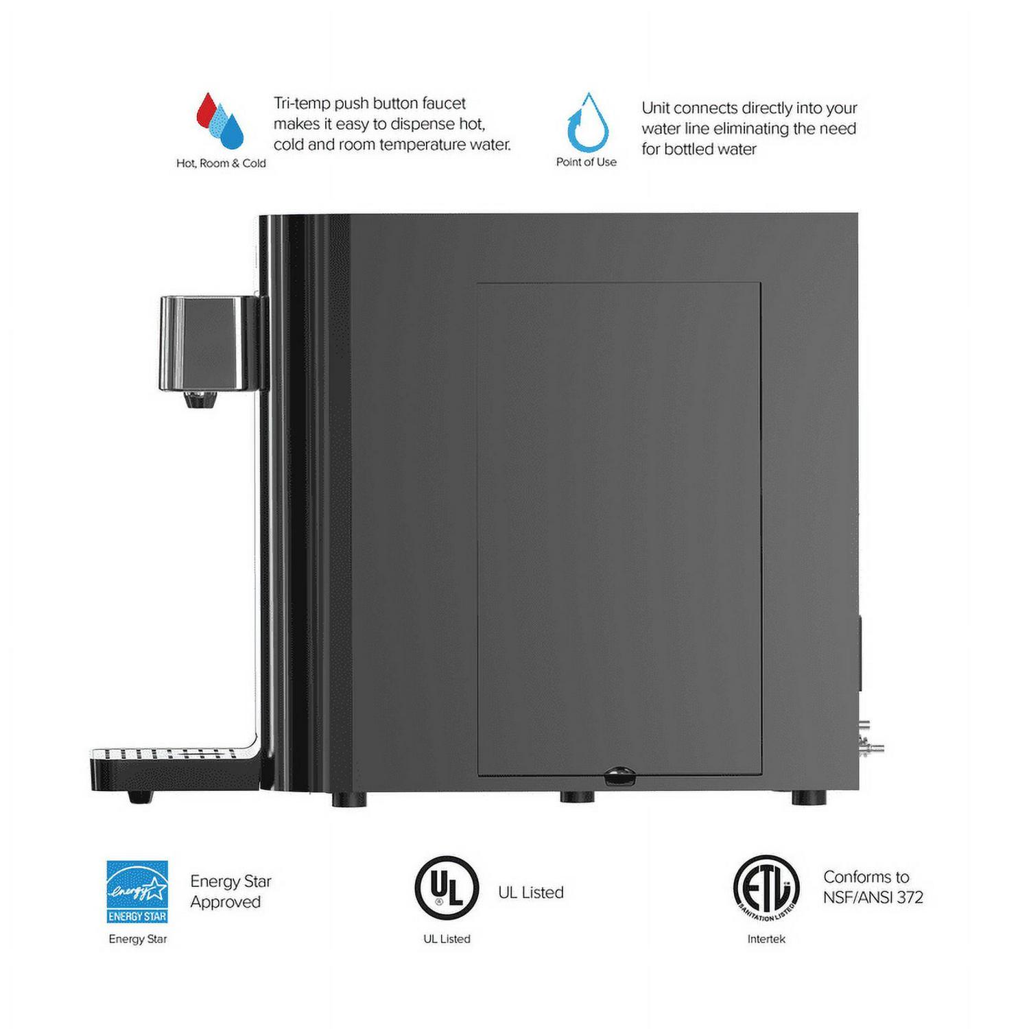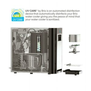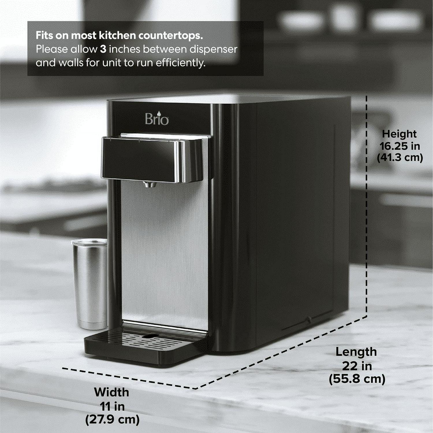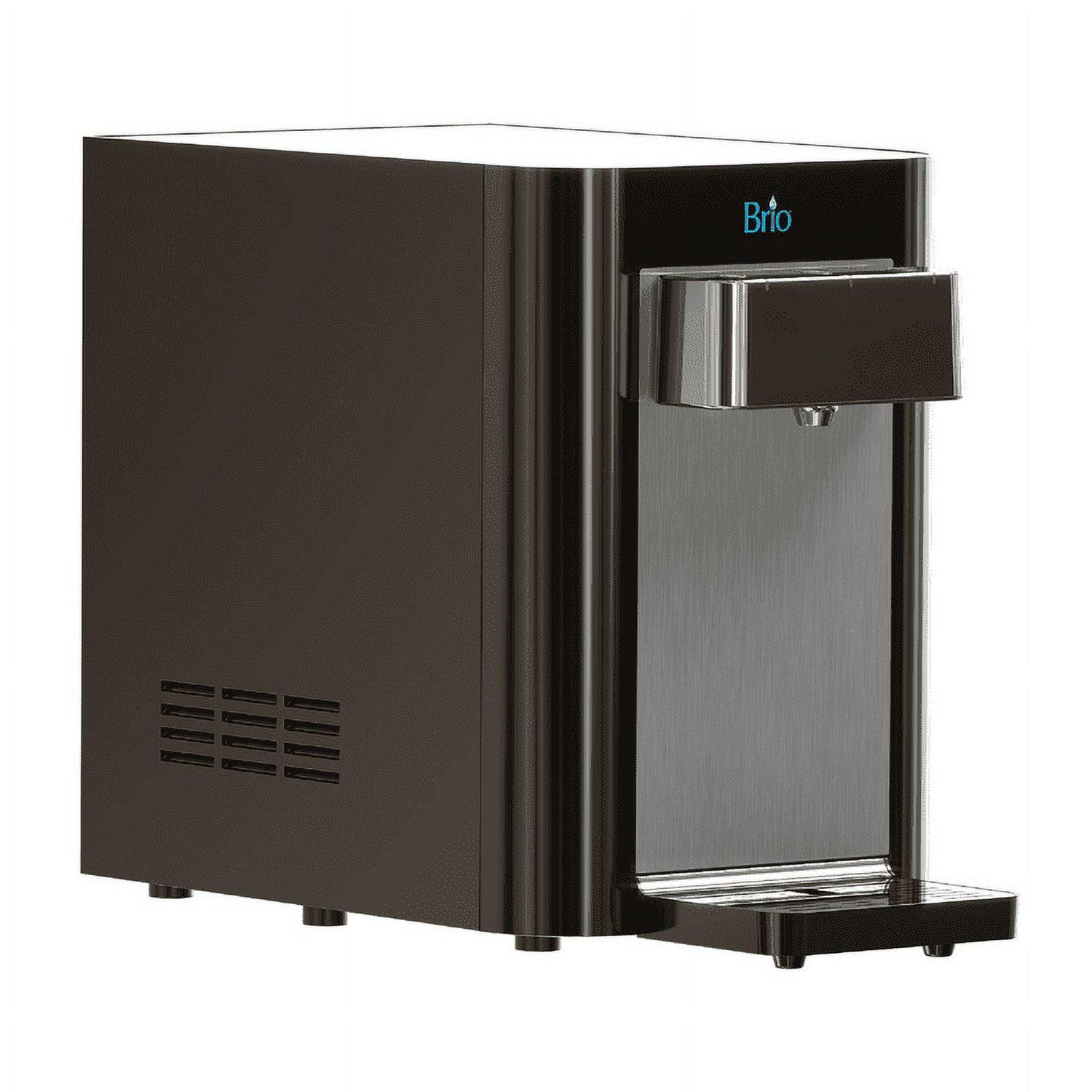 Experience hydration like never before with the brio 2-stage countertop point of use bottle less self-cleaning water cooler. Say goodbye to lifting heavy bottles and trips to the store as this point of use water cooler uses the industry s most innovative p. O. U. Filtration technology. The 2-step filtration system thoroughly purifies water, the first step features a sediment filter that removes dust, particles and rust while the second step features a premium carbon block that further removes contaminants and greatly improves the taste of water. Brio delivers only the finest and purest water in your cup, so enjoy refreshing cool water approximately 39 degrees F, soothing hot water approximately 194 degrees F and room temperature . Always have perfectly coolon hand goes above and beyond, so you never need ice or an appliance to cool or heat water. Enjoy all the benefits of a powerful point of use bottle less cooler with the simplest maintenance. Built with you in mind, this cooler features a child-safety lock to protect tiny hands from scalding water and a self-cleaning feature that utilizes UV light to sanitize the cooler. The automated UV light ensures that your new favorite water cooler remains sanitized throughout daily use, so rest easy knowing that you have the cleanest cooler and water possible. Confidently refill anytime knowing that brio water is there to satisfy all your hydration needs.