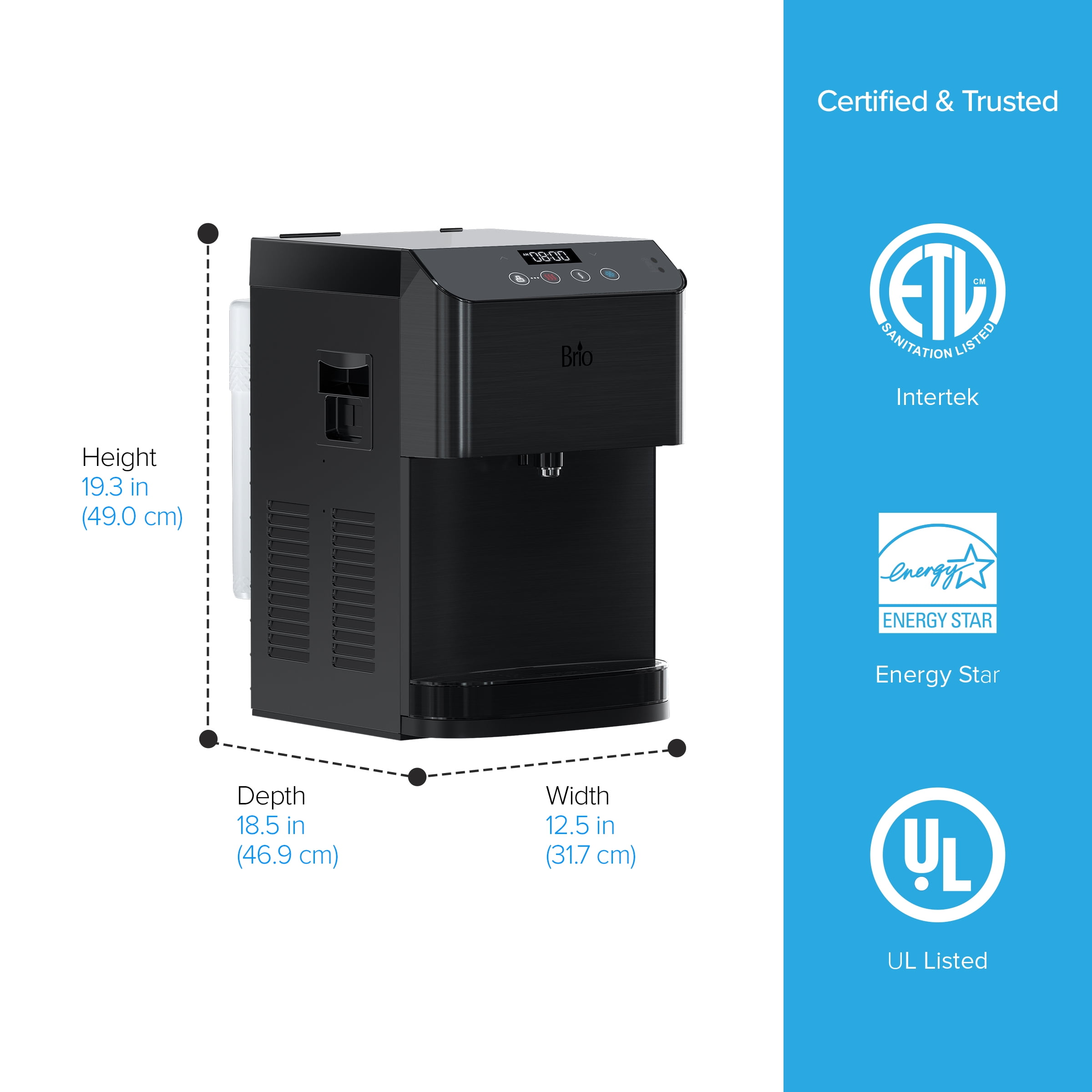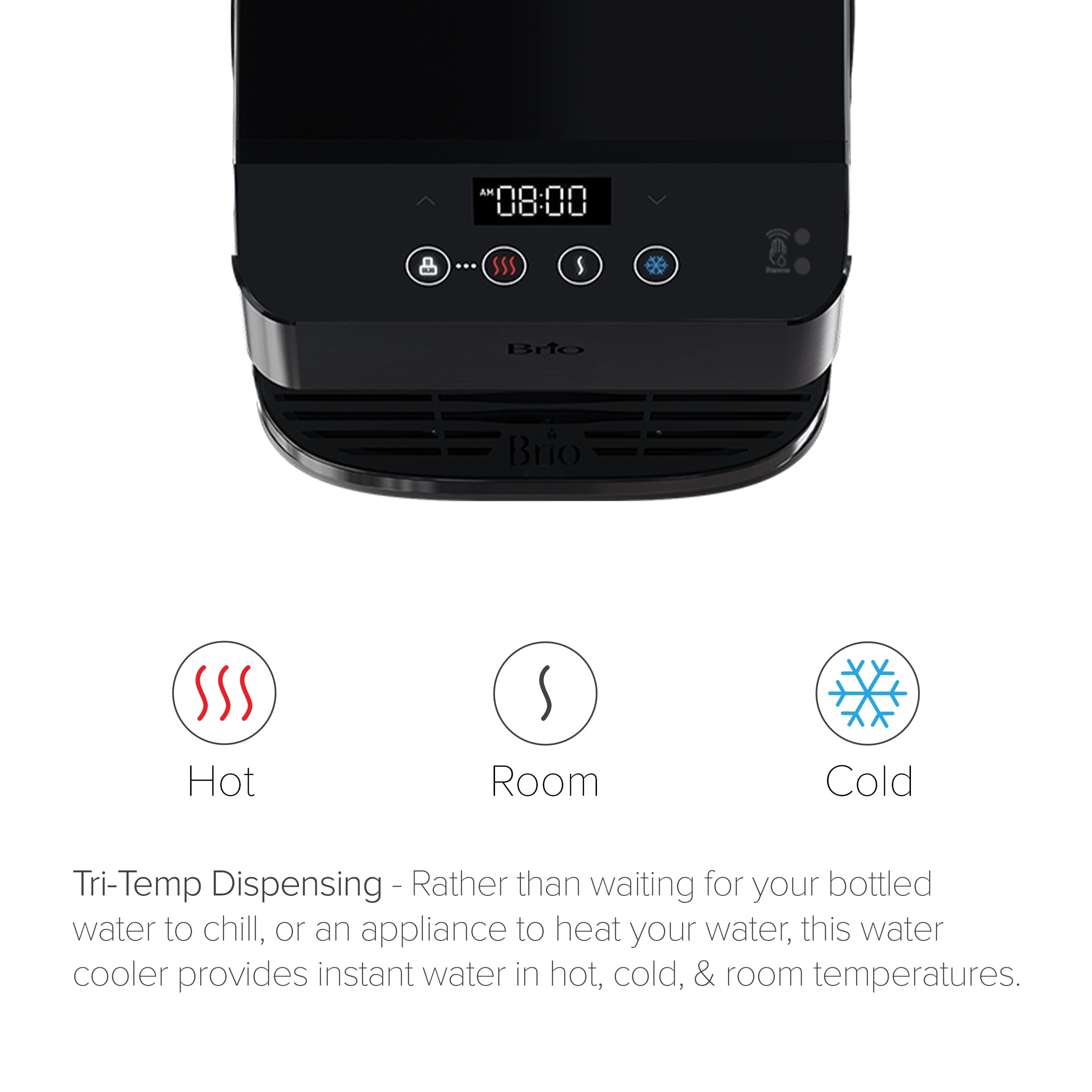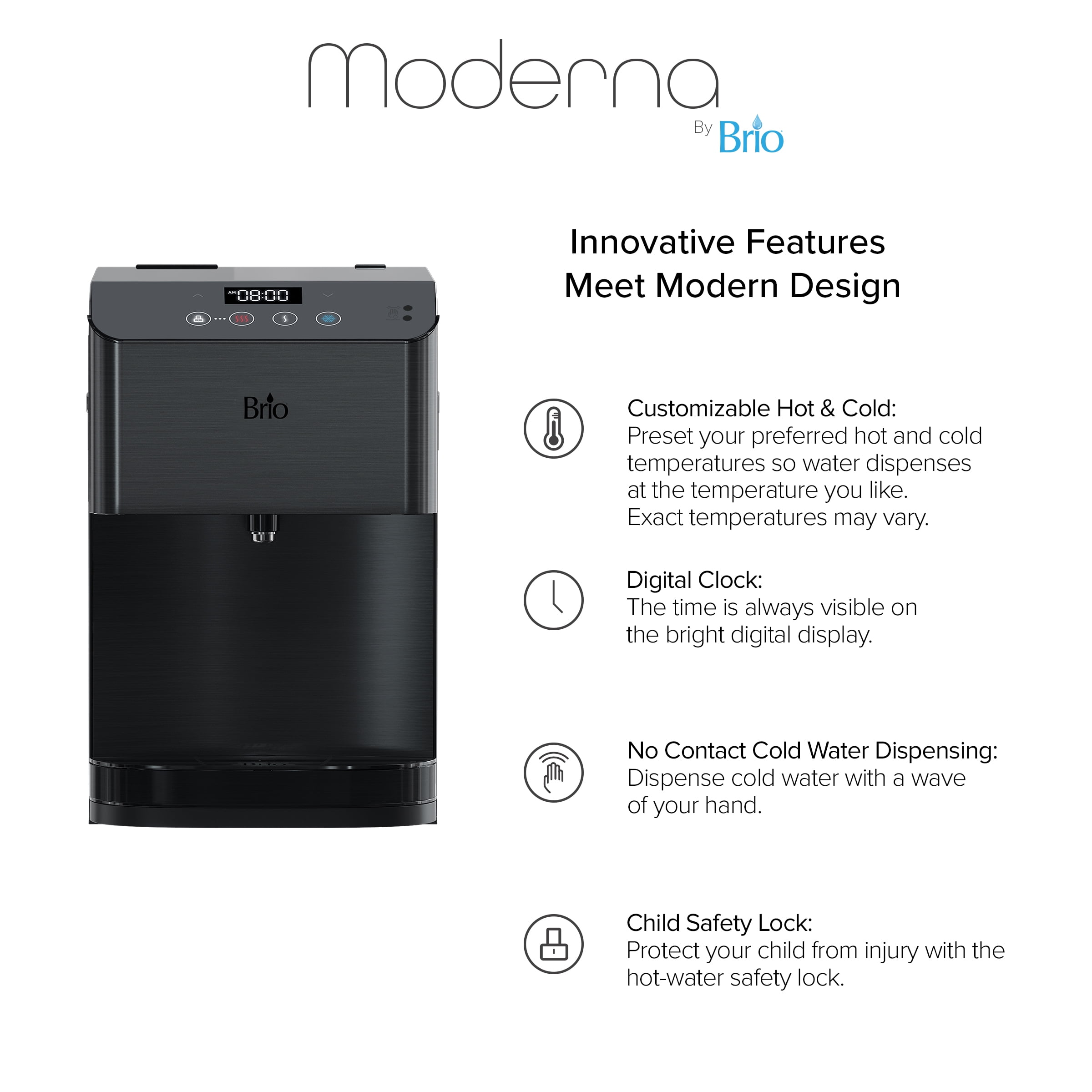 Revitalize with clean water from the Brio 700 series Moderna touch less countertop water cooler dispenser. Simply wave your hand in front of the digital control panel to activate the single-sensor technology to dispense crisp water. Experience hydration like never before with this 3-stage point of use bottleless water cooler. Say goodbye to lifting heavy bottles and trips to the store as this point of use water cooler uses the industry’s most innovative P.O.U. Filtration technology. The 3-step filtration system thoroughly purifies water, removing dust, particles and rust which greatly improves the taste of your water. Brio delivers only the finest and purest water in your cup, so enjoy refreshing cool water as low as 39 degrees, soothing hot water up to 194 degrees and room temperature water at any time. Always have perfectly cool or hot water on hand with the cooler that goes above and beyond. Enjoy all the benefits of a powerful point of use bottleless cooler with the simplest maintenance. Built with you in mind, this cooler features a child-safety lock to protect tiny hands from scalding water. The illuminated display panel allows you to control the water temperature, clock and nightlight. Trust in a water system that leads in innovation and health.